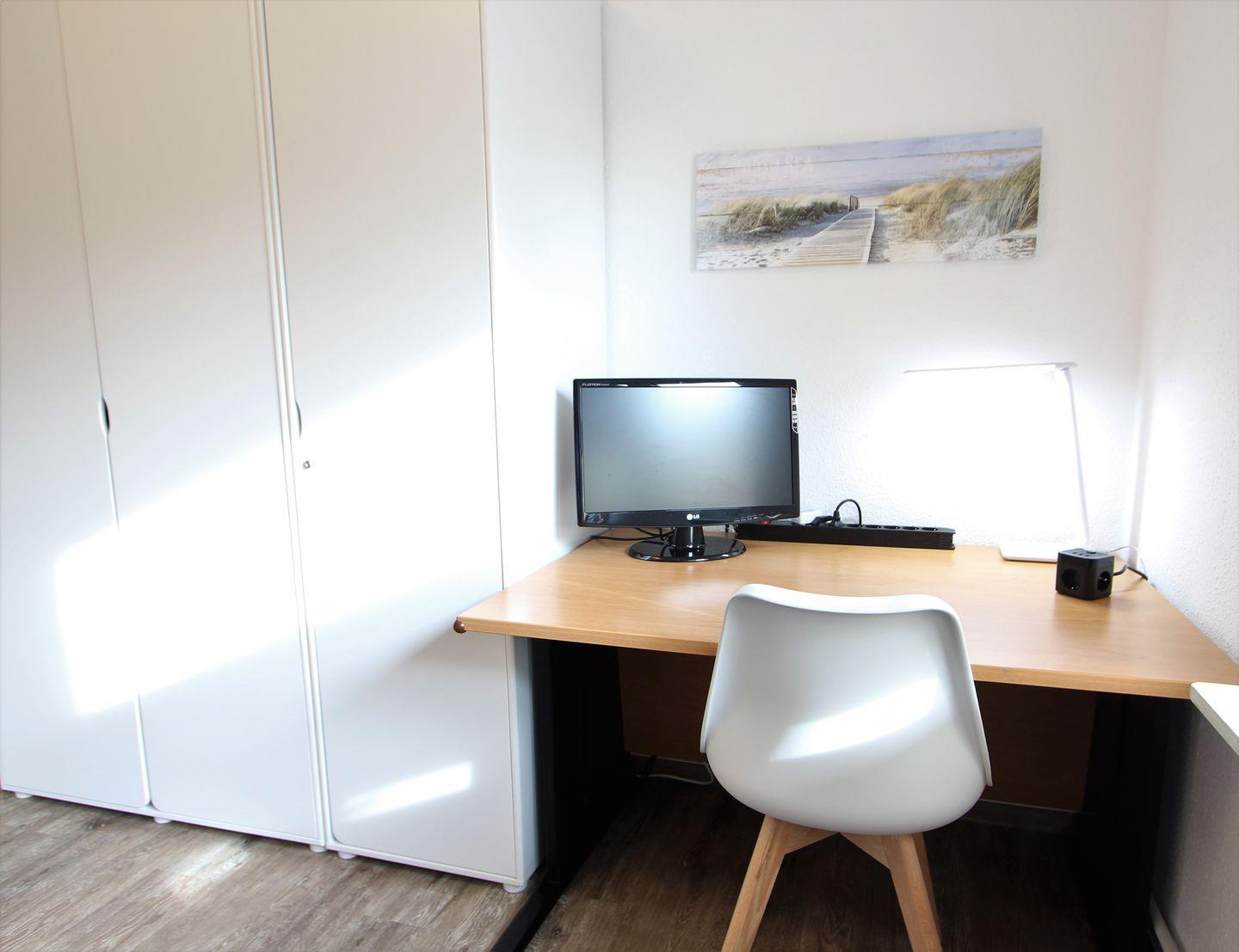 1 Schlafzimmer mit 2 Einzelbetten (90 x 200 cm) ein Bett mit einem Auszug für den 5. Schlafplatz, Schreibtisch mit PC-Monitor.