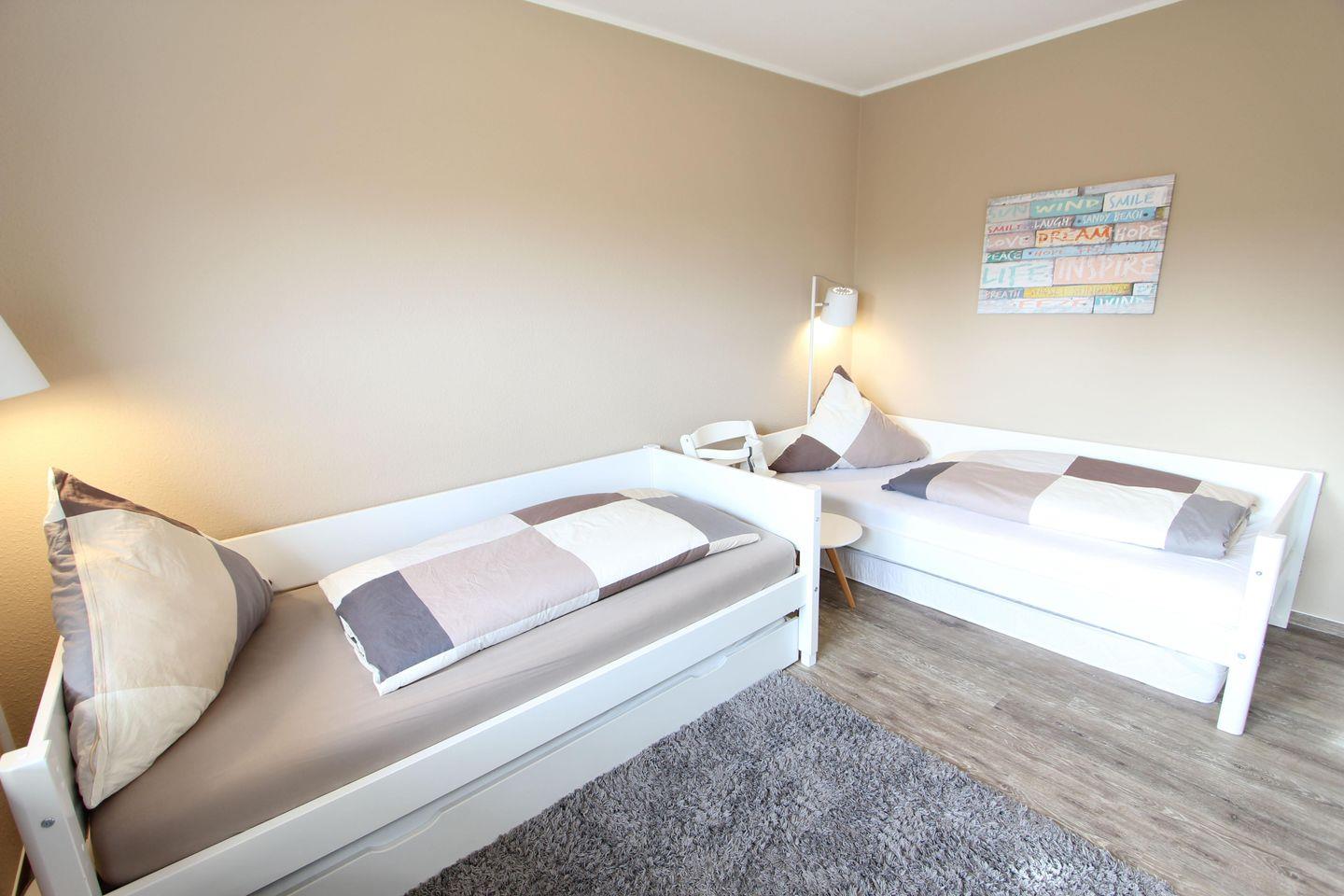 Im 2. Schlafzimmer befinden sich 2 Einzelbetten mit den Maßen 90 x 200 cm eines der Betten verfügt über einen Auszug für den 5. Schlafplatz. Hier befindet sich auch noch ein Schreibtisch mit PC-Monitor.