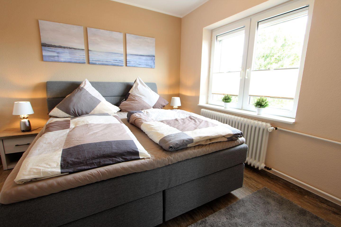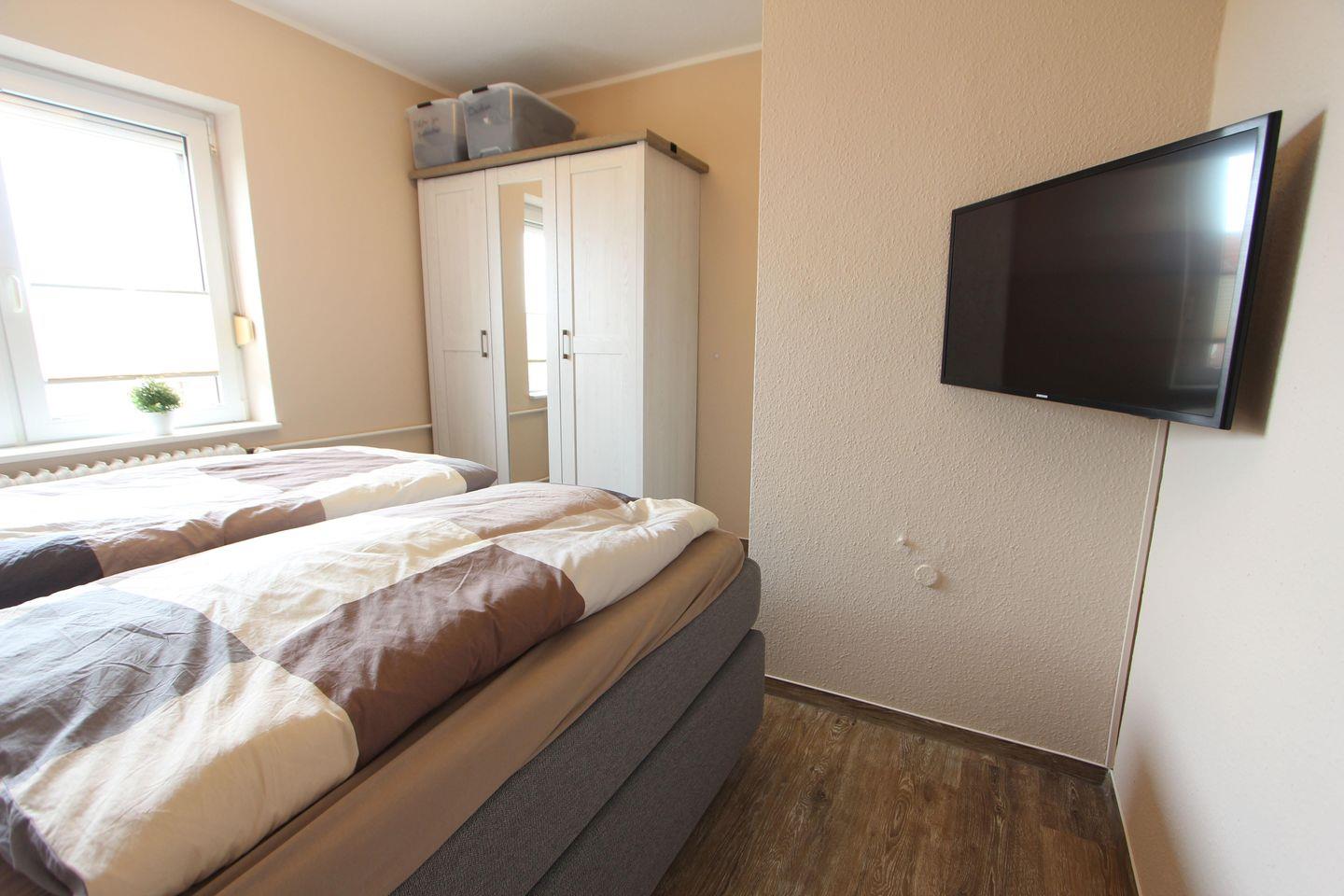 Das Hauptschlafzimmer ist ausgestattet mit einem modernen Boxspringbett mit den Maßen 180 X 200 cm und TV.