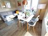 Das helle Wohnzimmer bietet Euch u.a. einen großzügigen Essbereich und eine gemütliche Couchecke. Vom Wohnzimmer aus erreicht Ihr den sonnigen Südbalkon.