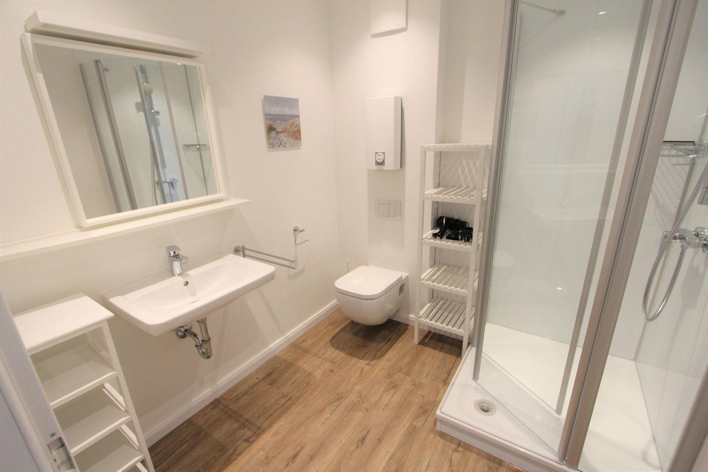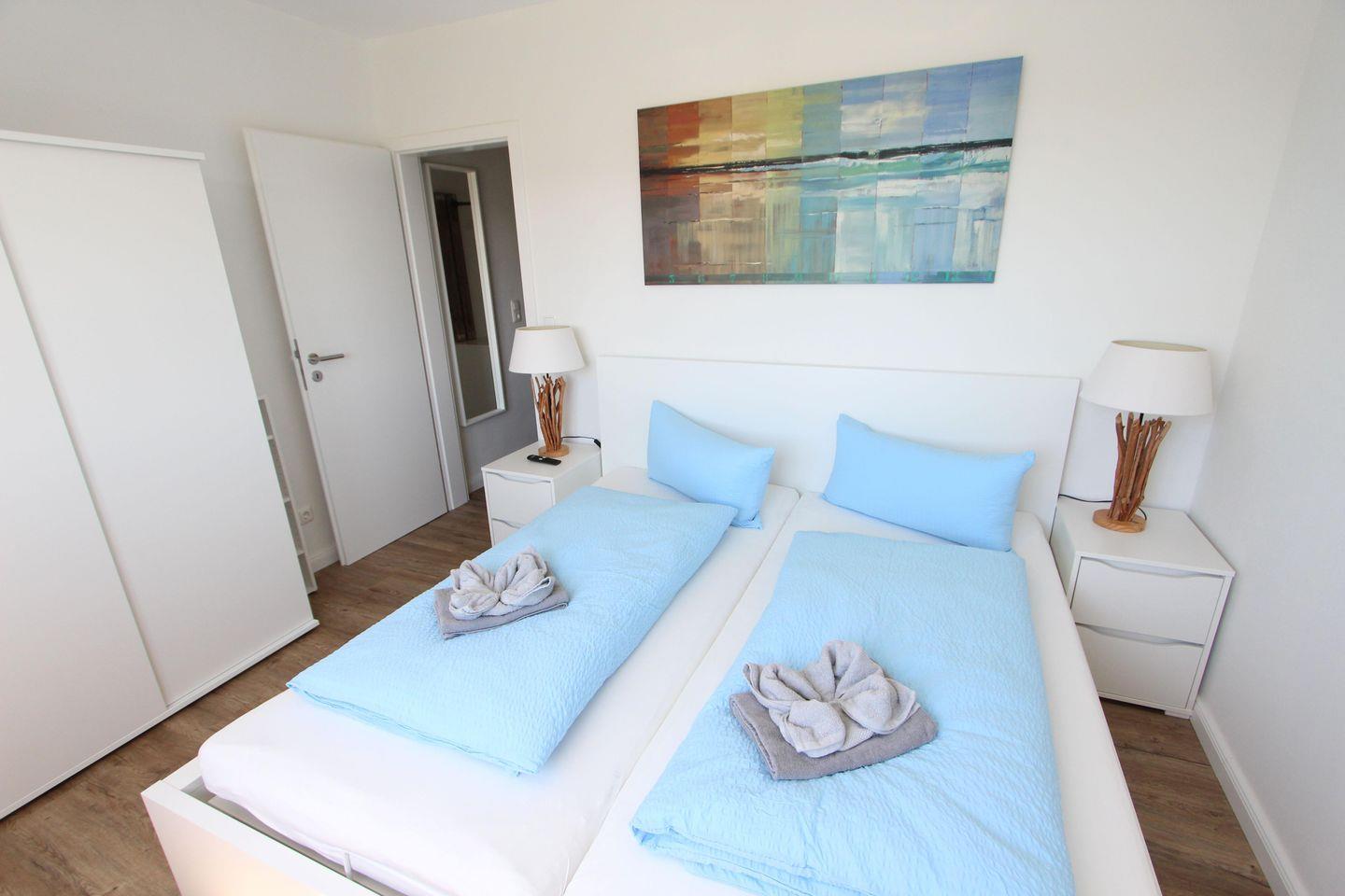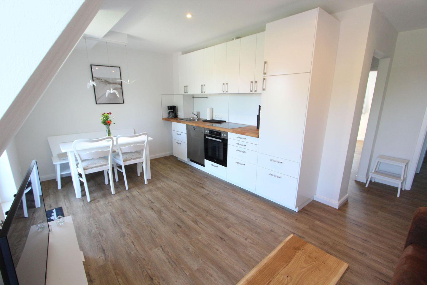 Ferienwohnung "Lili" im 1. OG, ca. 60 m², für bis zu 4 Personen, offene Wohnküche mit Küchenzeile mit Geschirrspüler, Backofen mit Kochfeld, Mikrowelle, Flatscreen-TV und eine gemütliche Couch. Schlafzimmer mit Doppelbett (180 x 200cm) TV, Schlafzimmer mit zwei Einzelbetten (90 x 200cm), Badezimmer mit Dusche und WC, Balkon