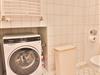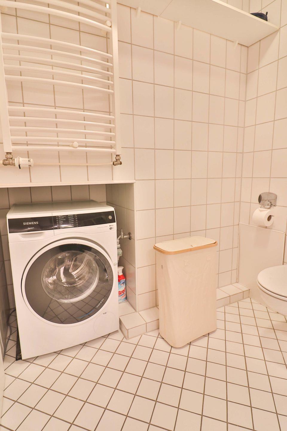 Das große Badezimmer bietet eine Dusche, ein Waschbecken sowie ein WC. Hier finden Sie außerdem Kleiderhaken und Wandregale für Ihre persönlichen Utensilien. In einer Wandnische steht hier der Waschtrockner. Ein Handtuchheizkörper sorgt für wohlige Wärme.