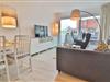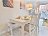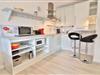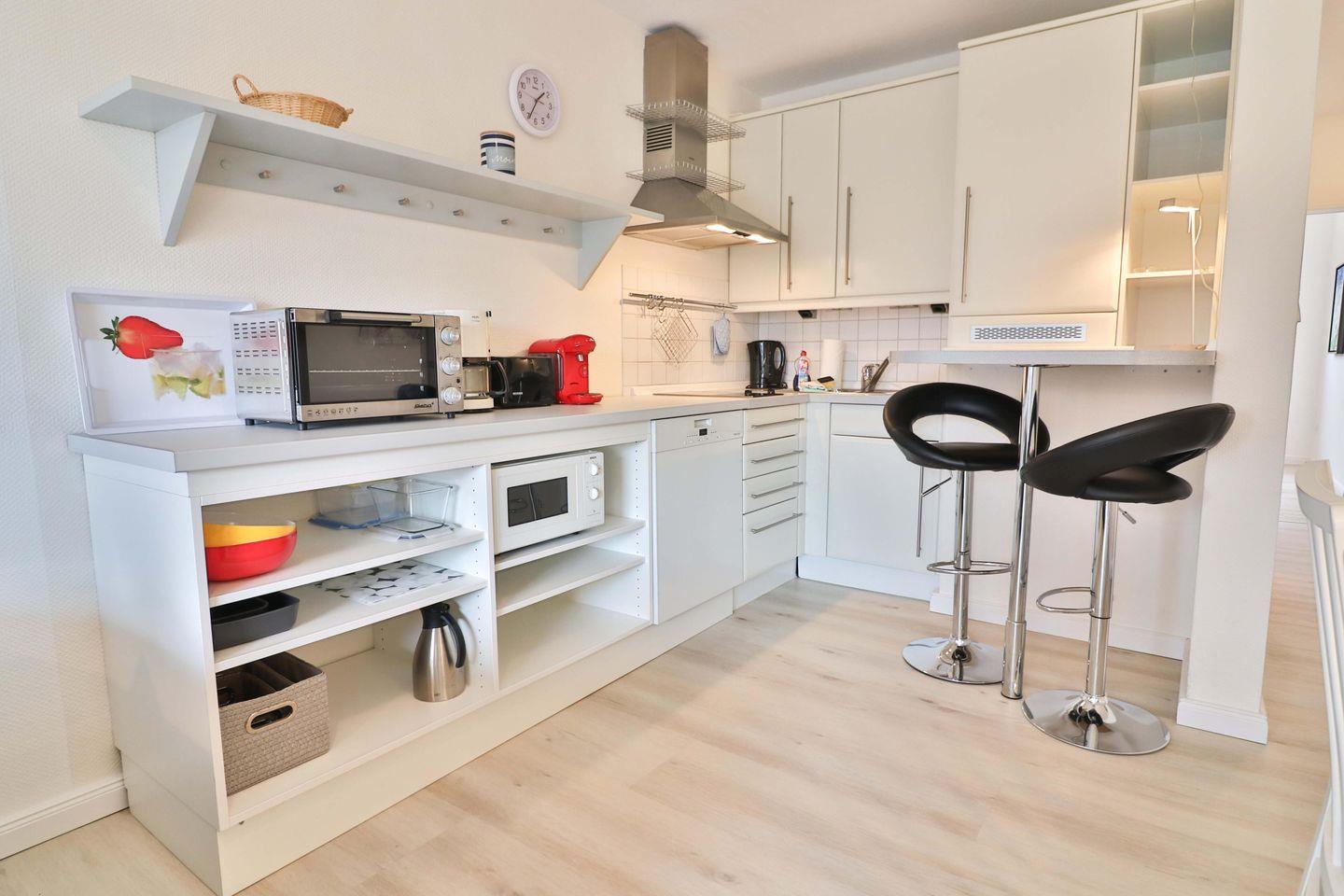 Die offene Küche mit Bartisch und -hockern für 2 Personen verfügt über eine Küchenzeile, die ausreichend Platz bietet, um ein leckeres Essen zuzubereiten. Hier finden Sie ein Spülbecken, einen kleinen Backofen, eine Mikrowelle, ein 2-Platten-Ceranfeld, eine Spülmaschine, einen Kühlschrank mit integriertem Gefrierfach, eine Filterkaffeemaschine, eine Tassimo-Kapselmaschine, Toaster und Wasserkocher. Neben diversen Küchenutensilien enthält die Küche eine gute Auswahl an Geschirr.