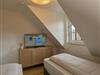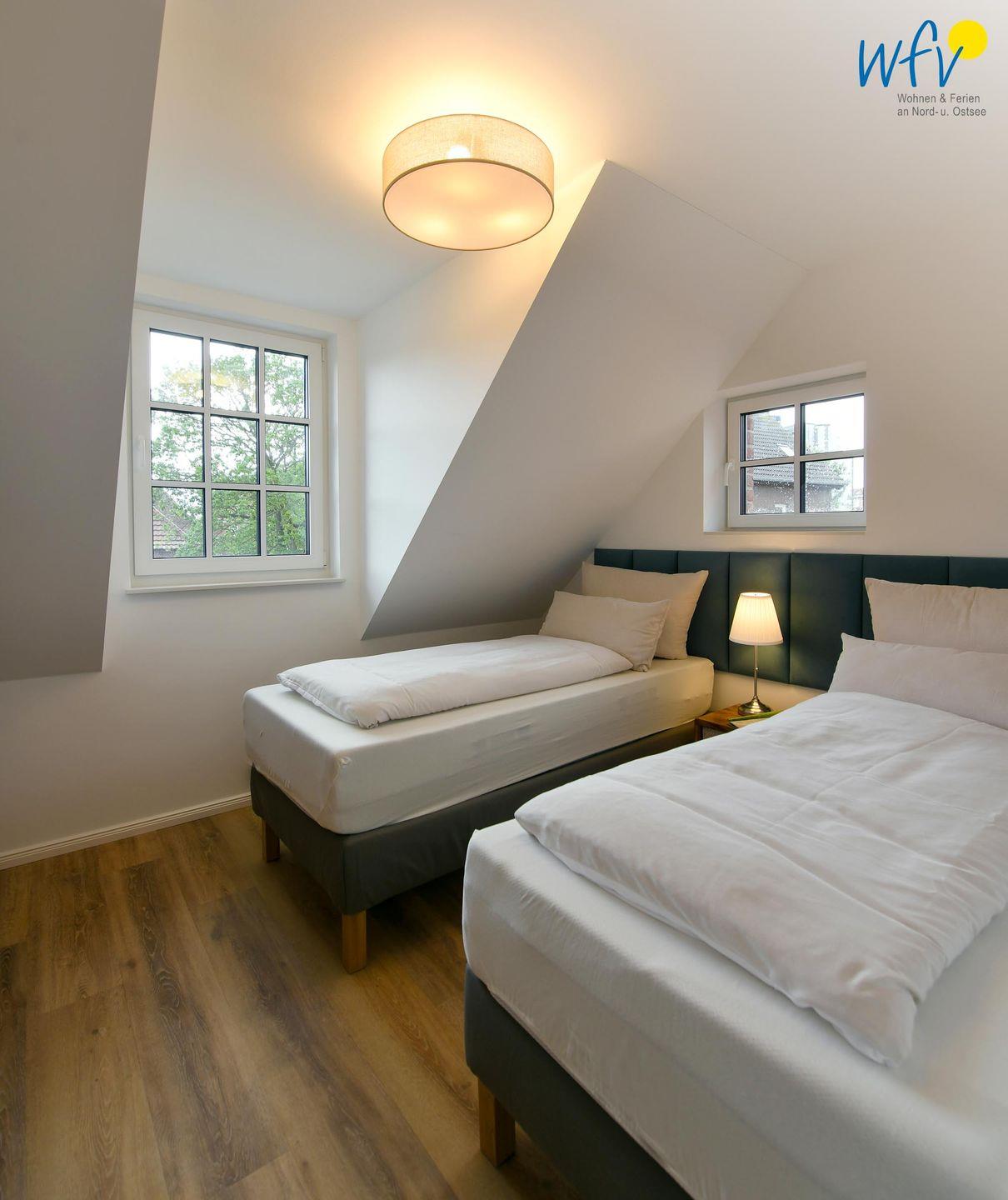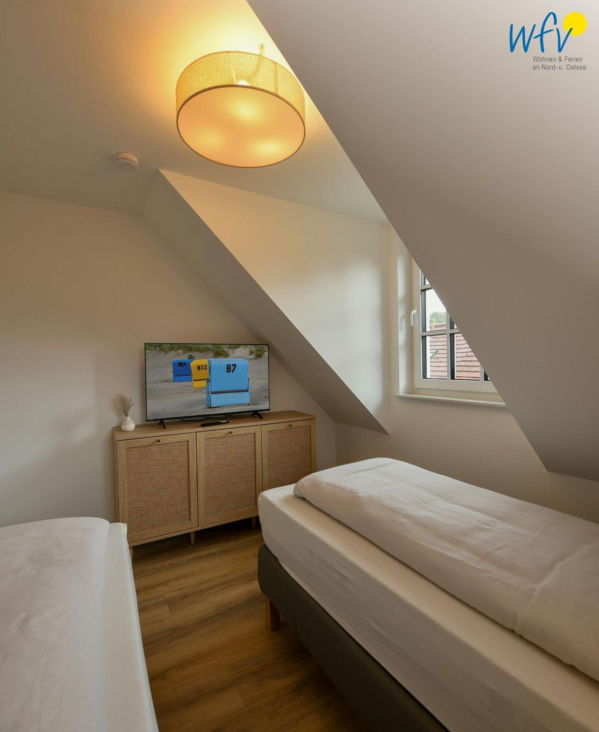 Die zwei separaten Schlafzimmer im Dachgeschoss bieten Ihnen sowohl Komfort, als auch Privatsphäre. Ein Schlafzimmer ist mit einem komfortablen Kingsize-Boxspringbett ausgestattet, das zweite Schlafzimmer beinhaltet zwei Einzelbetten, die bei Bedarf auch zusammengeschoben werden können.