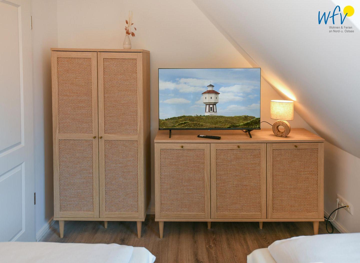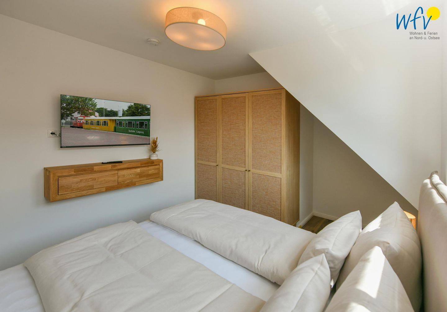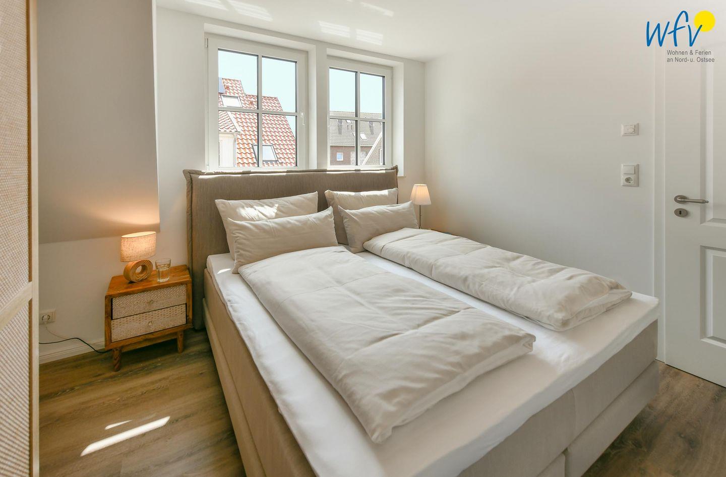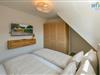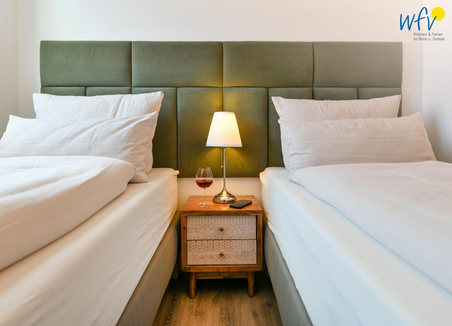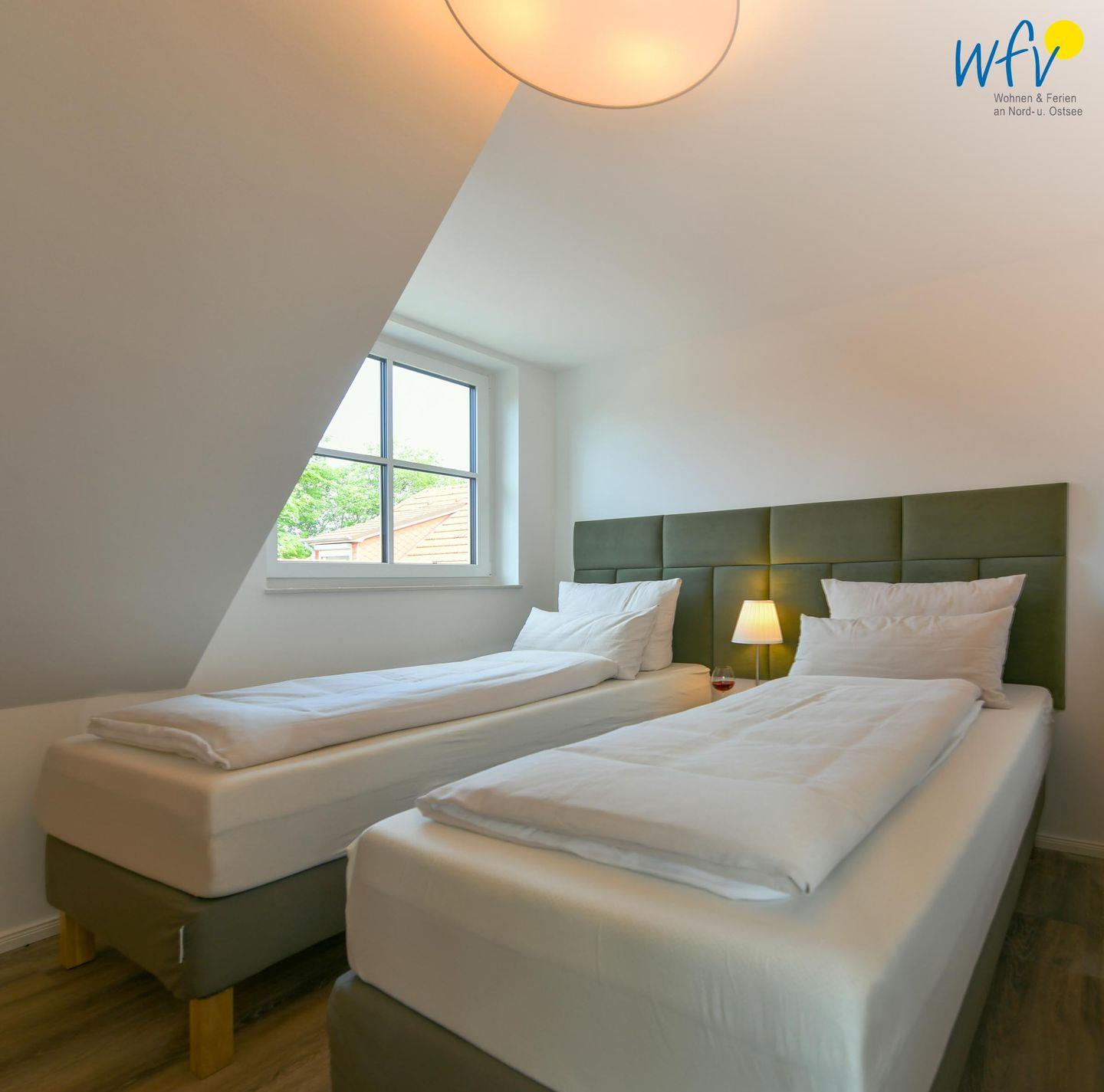 Die zwei separaten Schlafzimmer im Dachgeschoss bieten Ihnen sowohl Komfort, als auch Privatsphäre. Das Elternschlafzimmer ist mit einem großen Doppelbett ausgestattet (180 cm), das Kinderschlafzimmer mit zwei eleganten Einzelbetten, die bei Bedarf auch zu einem großen Doppelbett zusammengeschoben werden können.
