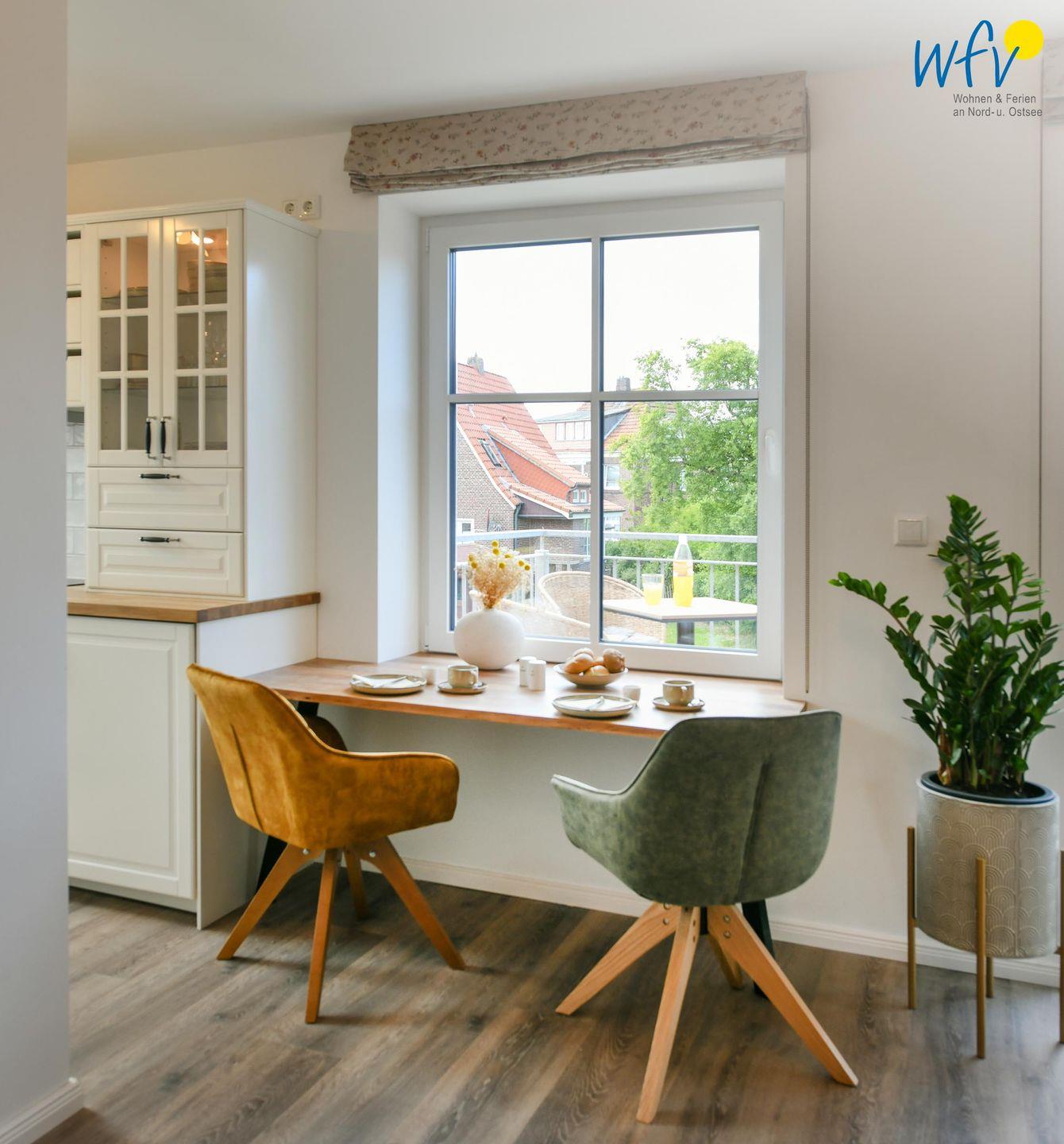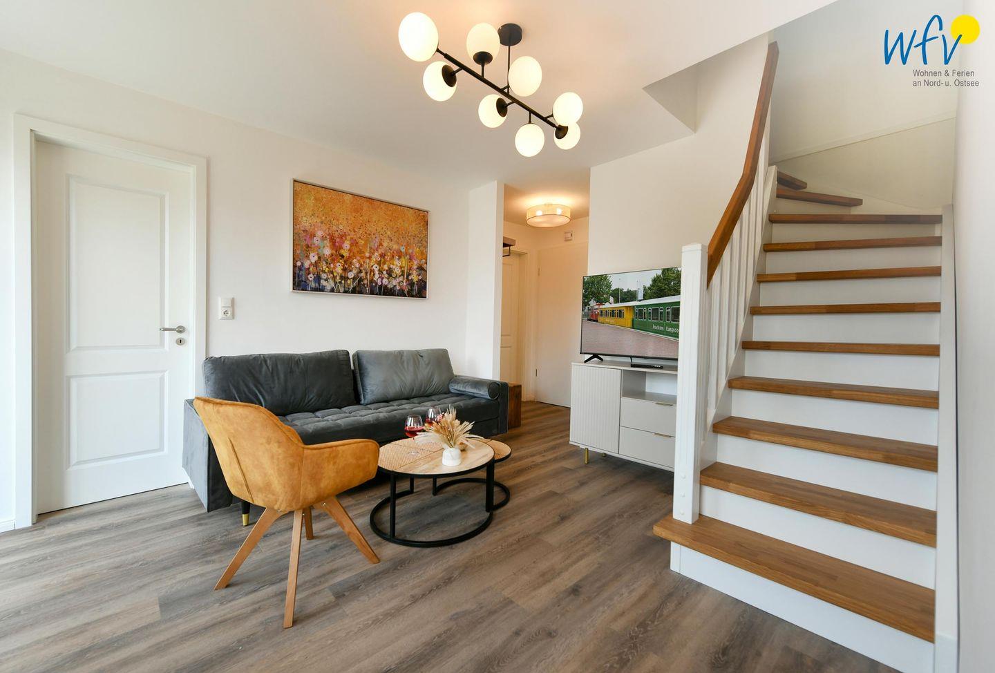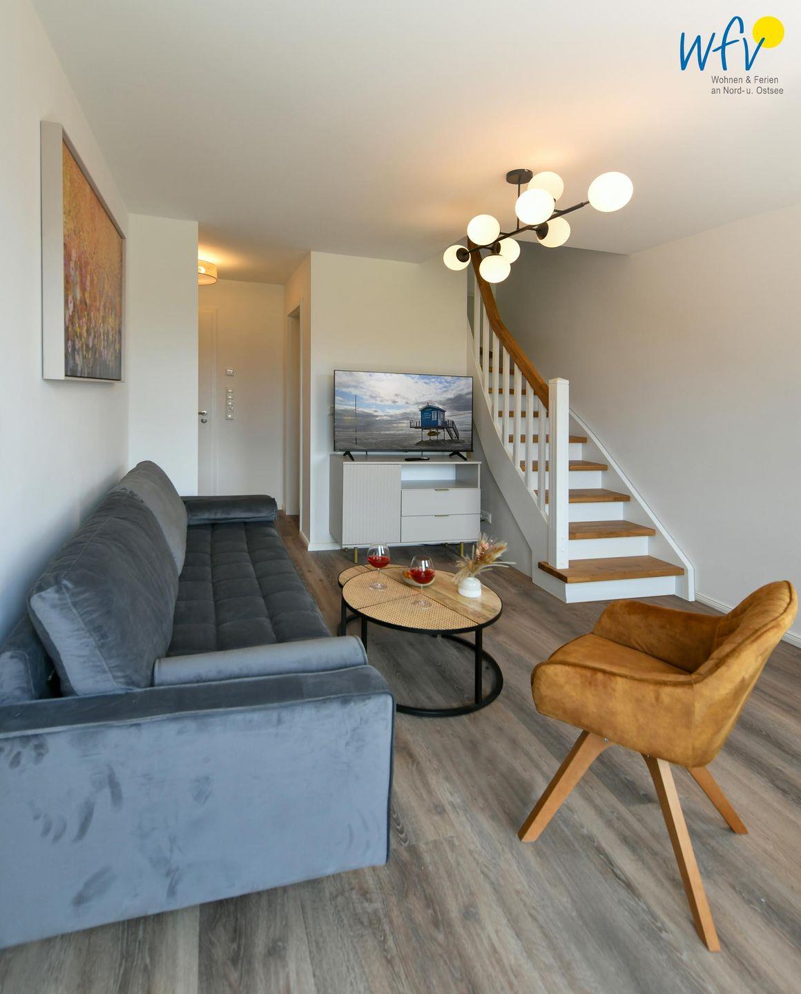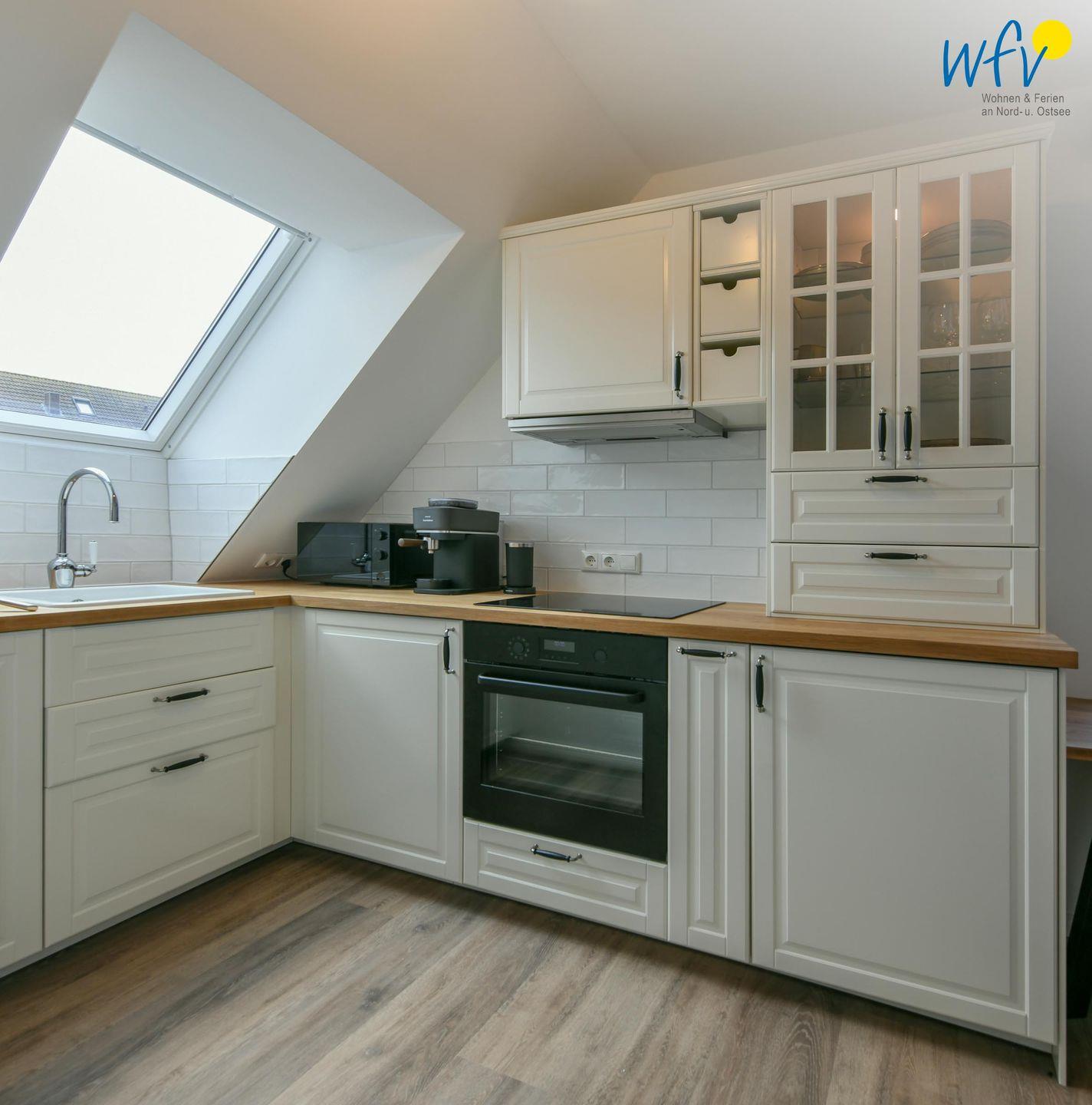 Die Maisonette-Ferienwohnung verfügt über ein modernes, offenes Wohnkonzept über zwei Etagen, das für ein weites Raumgefühl sorgt. Im Dachgeschoss sind Wohnbereich und Küche harmonisch miteinander verbunden, sodass Sie hier nach dem Strandtag oder der Fahrradtour gemütliche Abende auf dem bequemen Sofa verbringen, fernsehen und lesen können oder das gemeinsame Kochen genießen. Für kulinarische Erlebnisse ist die moderne Küche mit einem 4-Platten-Induktionsherd, einem Backofen, einer Mikrowelle, einem Kühlschrank mit Gefrierfach sowie einer Spülmaschine ausgestattet. Der angrenzende Essbereich lädt zu gemeinsamen Mahlzeiten ein.