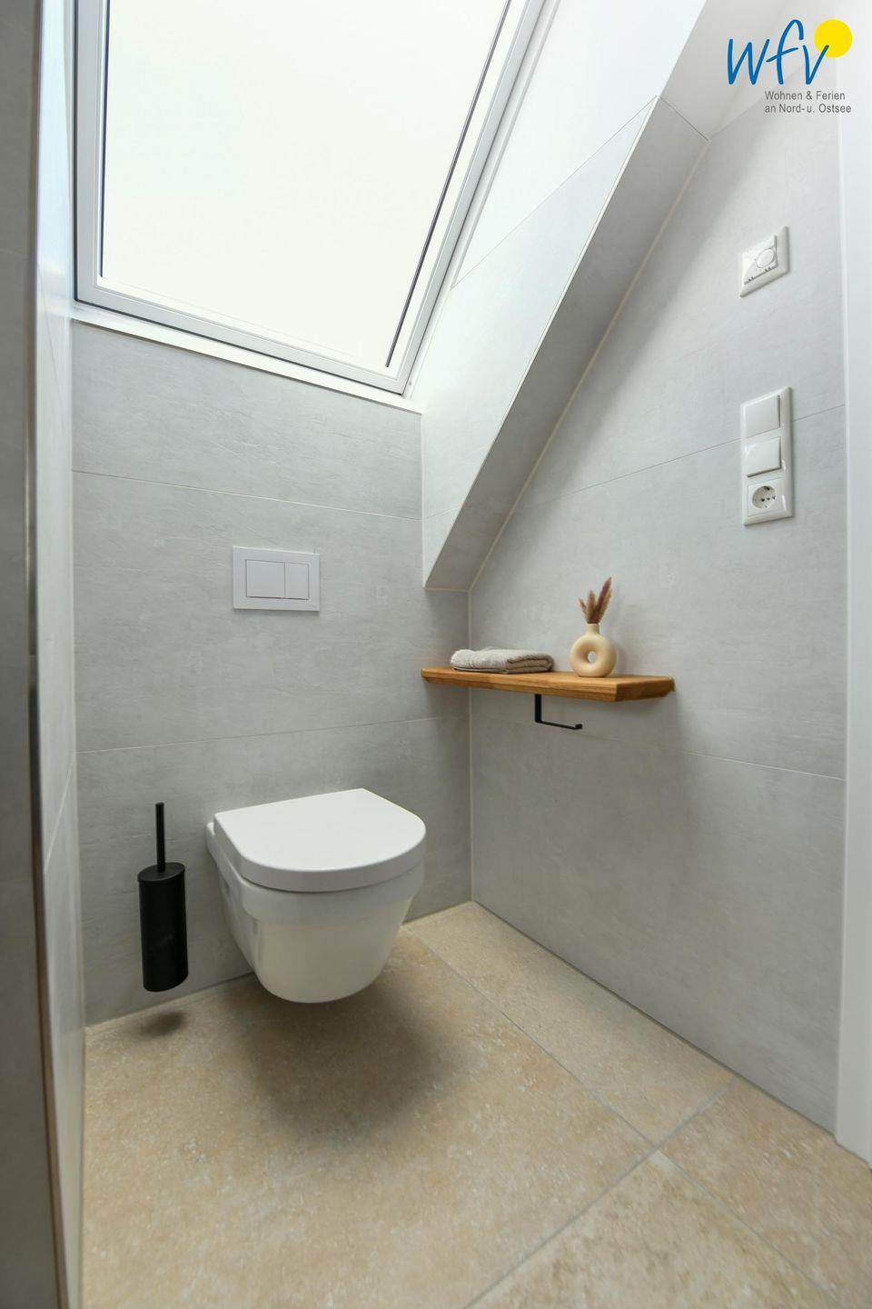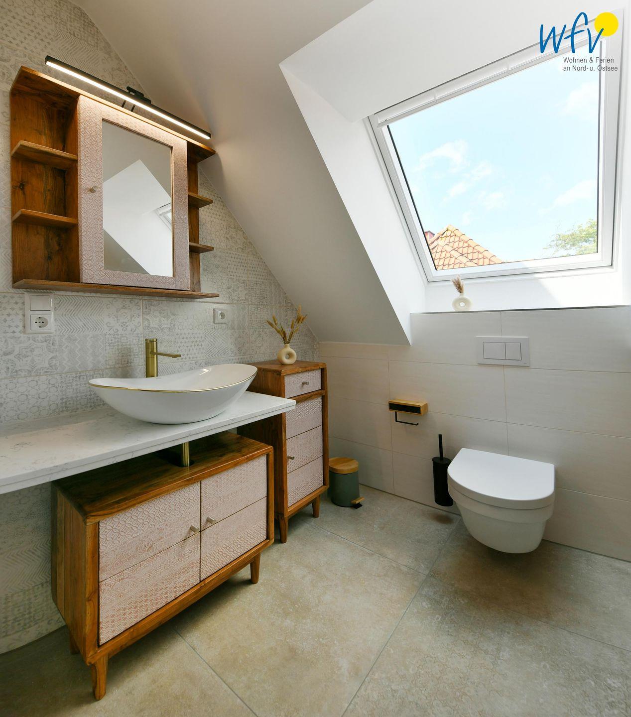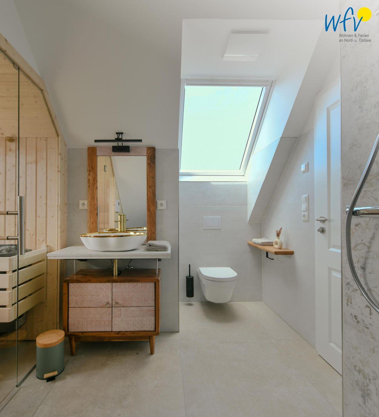 Zwei elegante Tageslichtbäder im Dachgeschoss und im Spitzboden sorgen für angenehme Ausweichmöglichkeiten. In dem oberen Bad mit Dusche und eigener Sauna genießen Sie wohltuende Entspannungszeit.