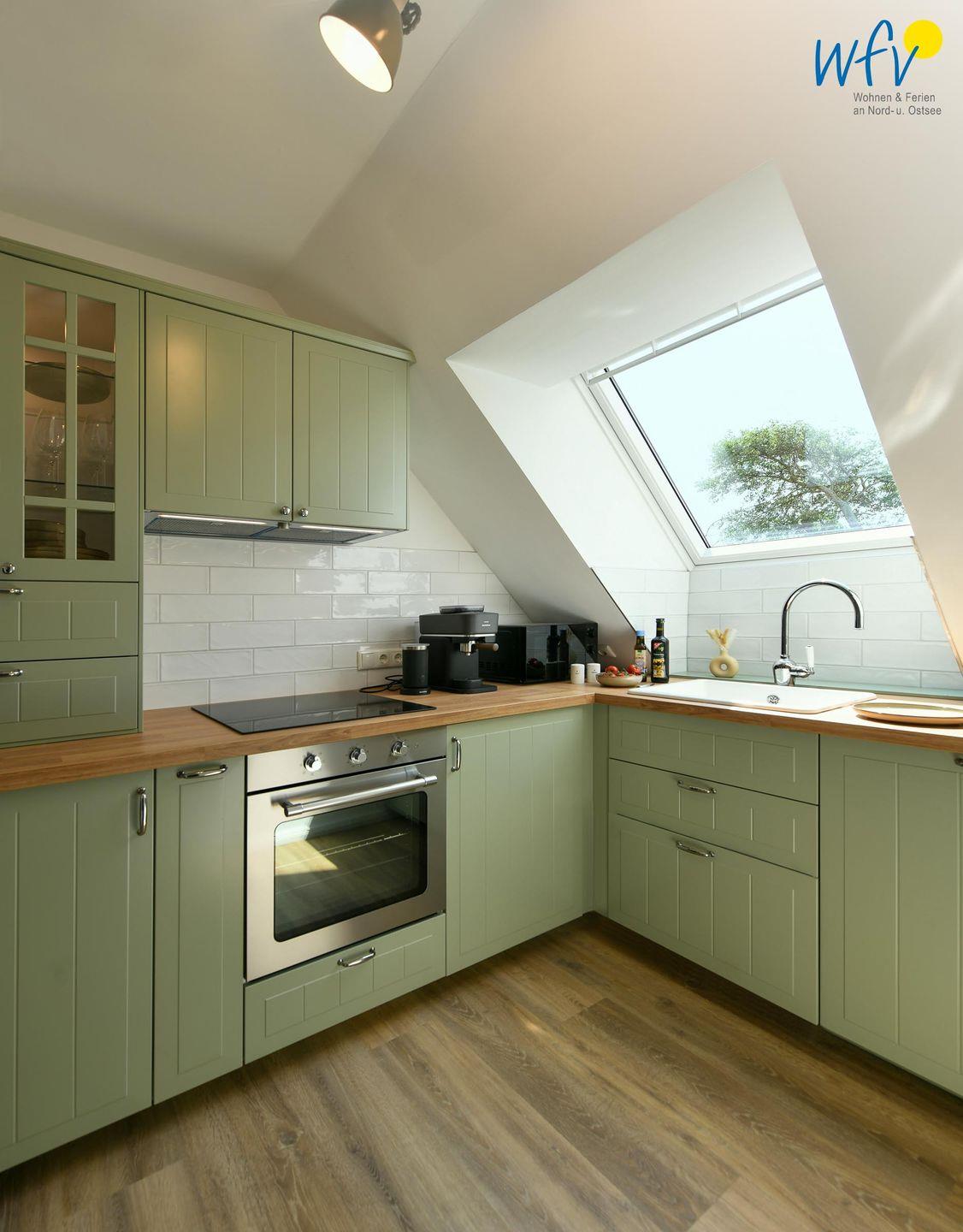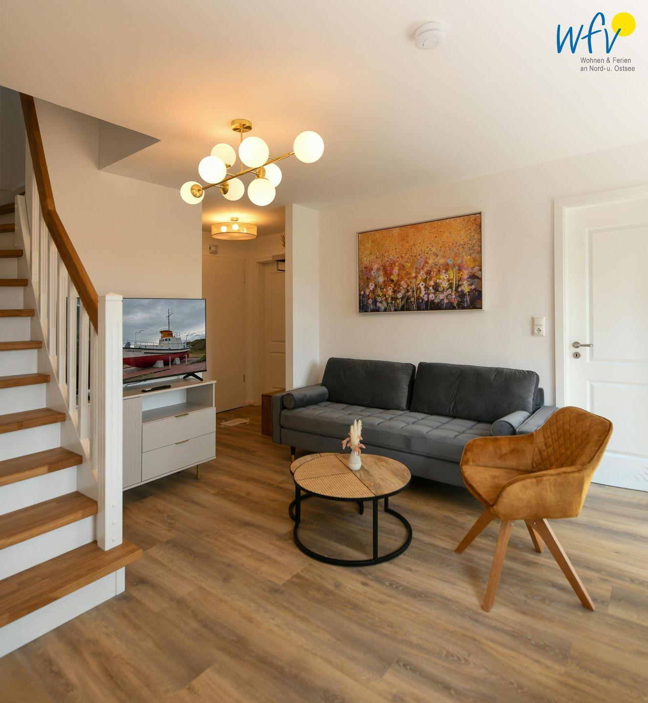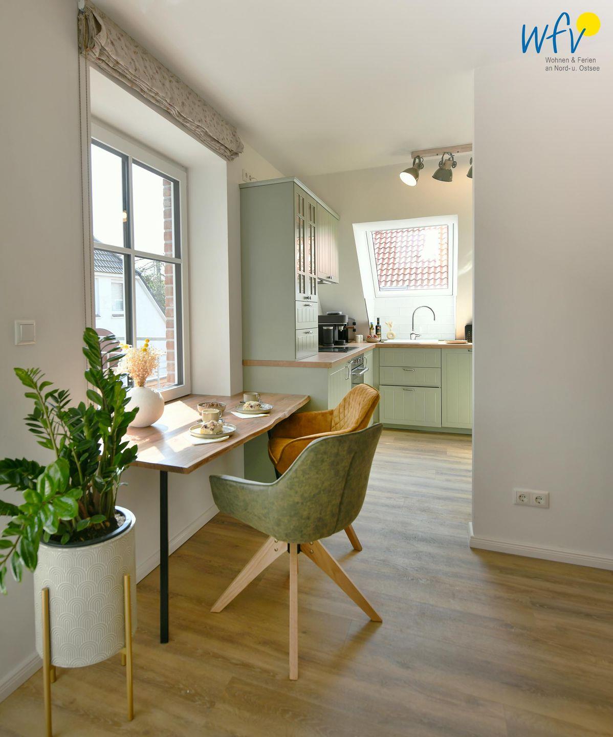 Die Maisonette-Ferienwohnung verfügt über ein modernes, offenes Wohnkonzept über zwei Etagen, das für ein weites Raumgefühl sorgt. Im Dachgeschoss sind Wohnbereich und Küche harmonisch miteinander verbunden, sodass Sie hier nach dem Strandtag oder der Fahrradtour gemütliche Abende auf dem bequemen Sofa verbringen, fernsehen und lesen können oder das gemeinsame Kochen genießen. Für kulinarische Erlebnisse ist die moderne Küche mit einem 4-Platten-Induktionsherd, einem Backofen, einer Mikrowelle, einem Kühlschrank mit Gefrierfach sowie einer Spülmaschine ausgestattet. Der angrenzende Essbereich lädt zu gemeinsamen Mahlzeiten ein.