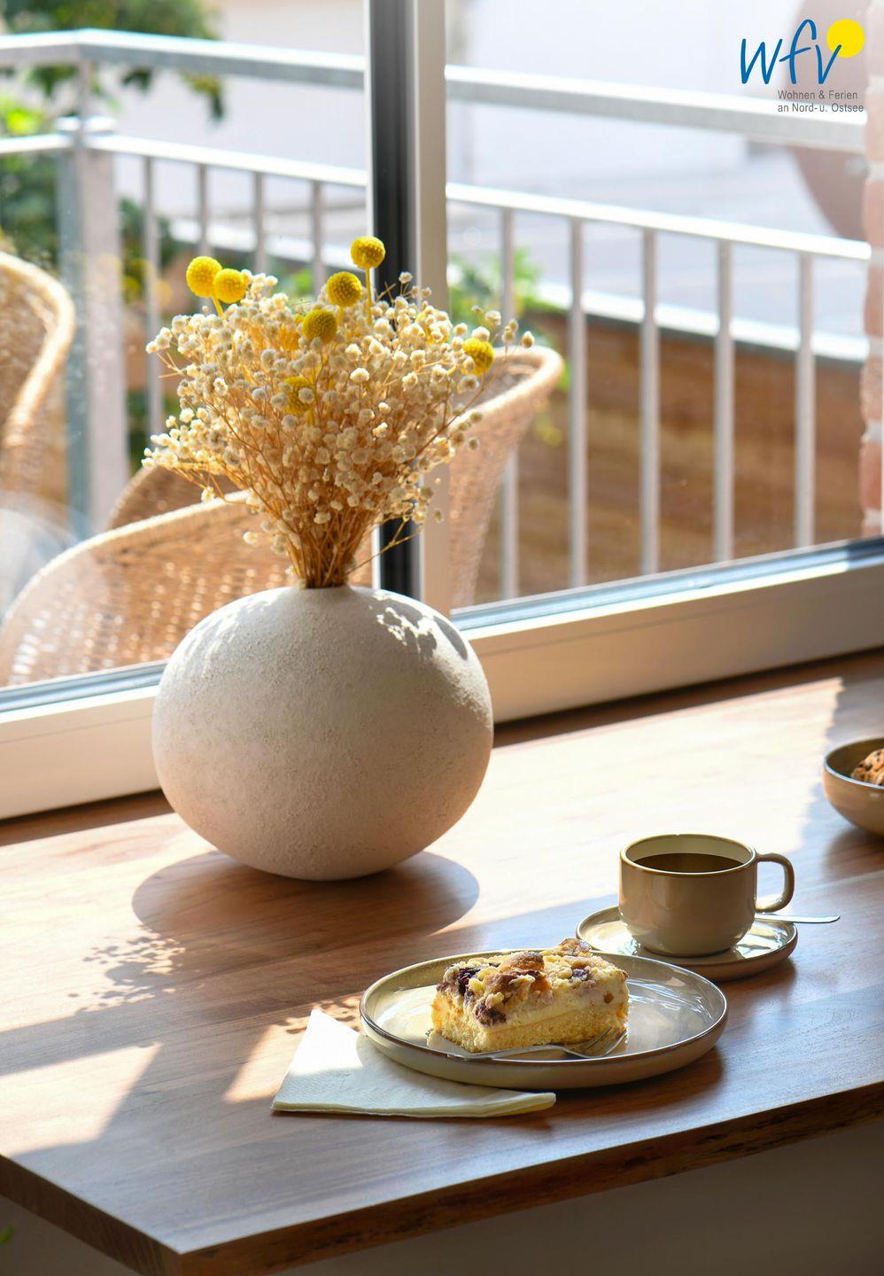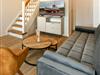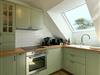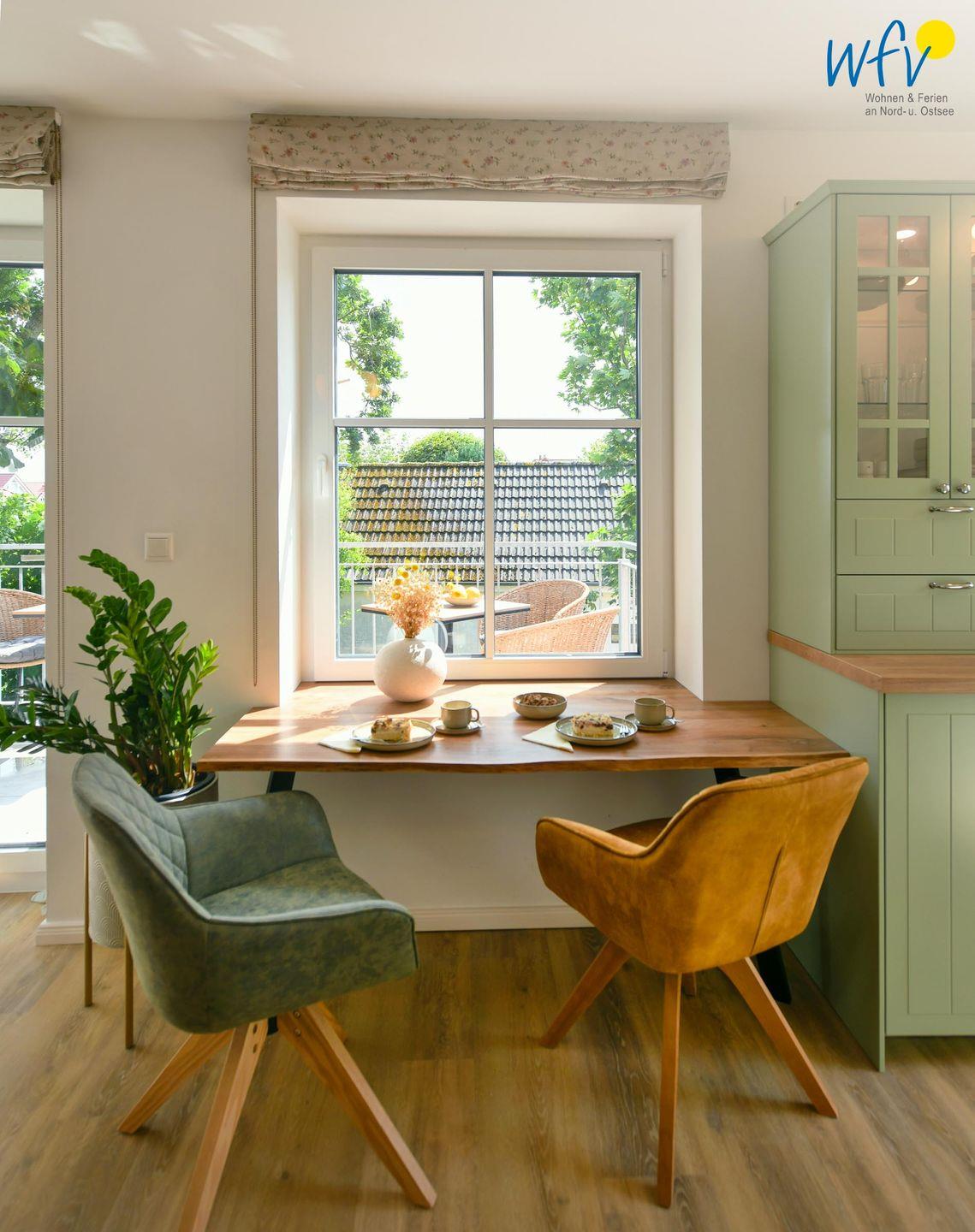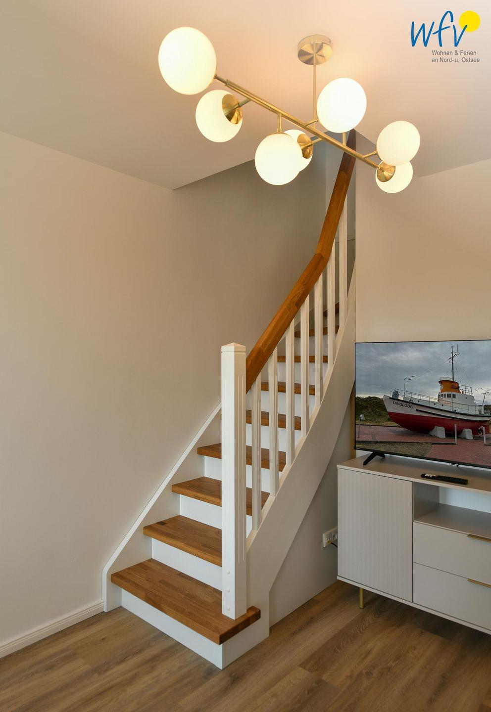 Die Maisonette-Ferienwohnung verfügt über ein modernes, offenes Wohnkonzept über zwei Etagen, das für ein weites Raumgefühl sorgt. Im Dachgeschoss sind Wohnbereich und Küche harmonisch miteinander verbunden, sodass Sie hier nach dem Strandtag oder der Fahrradtour gemütliche Abende auf dem bequemen Sofa verbringen, fernsehen und lesen können oder das gemeinsame Kochen genießen. Für kulinarische Erlebnisse ist die moderne Küche mit einem 4-Platten-Induktionsherd, einem Backofen, einer Mikrowelle, einem Kühlschrank mit Gefrierfach sowie einer Spülmaschine ausgestattet. Der angrenzende Essbereich lädt zu gemeinsamen Mahlzeiten ein.