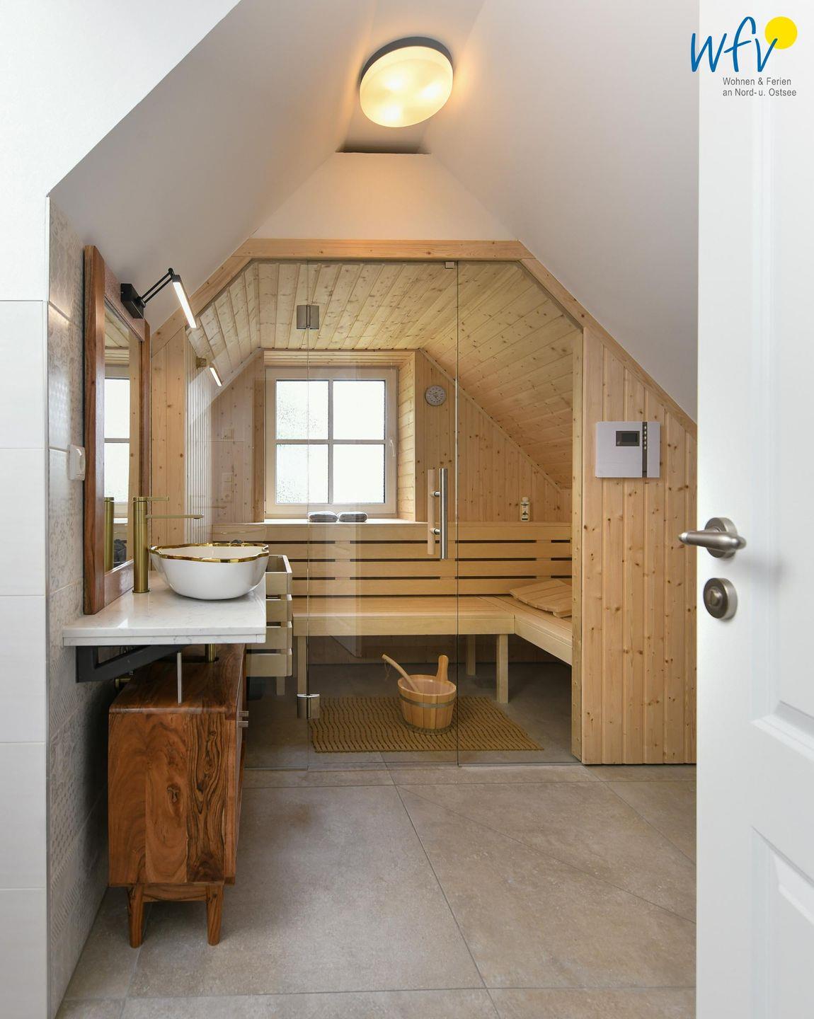Zwei elegante Tageslichtbäder im Dachgeschoss und im Spitzboden sorgen für angenehme Ausweichmöglichkeiten. In dem oberen Bad mit Dusche und eigener Sauna genießen Sie wohltuende Entspannungszeit.