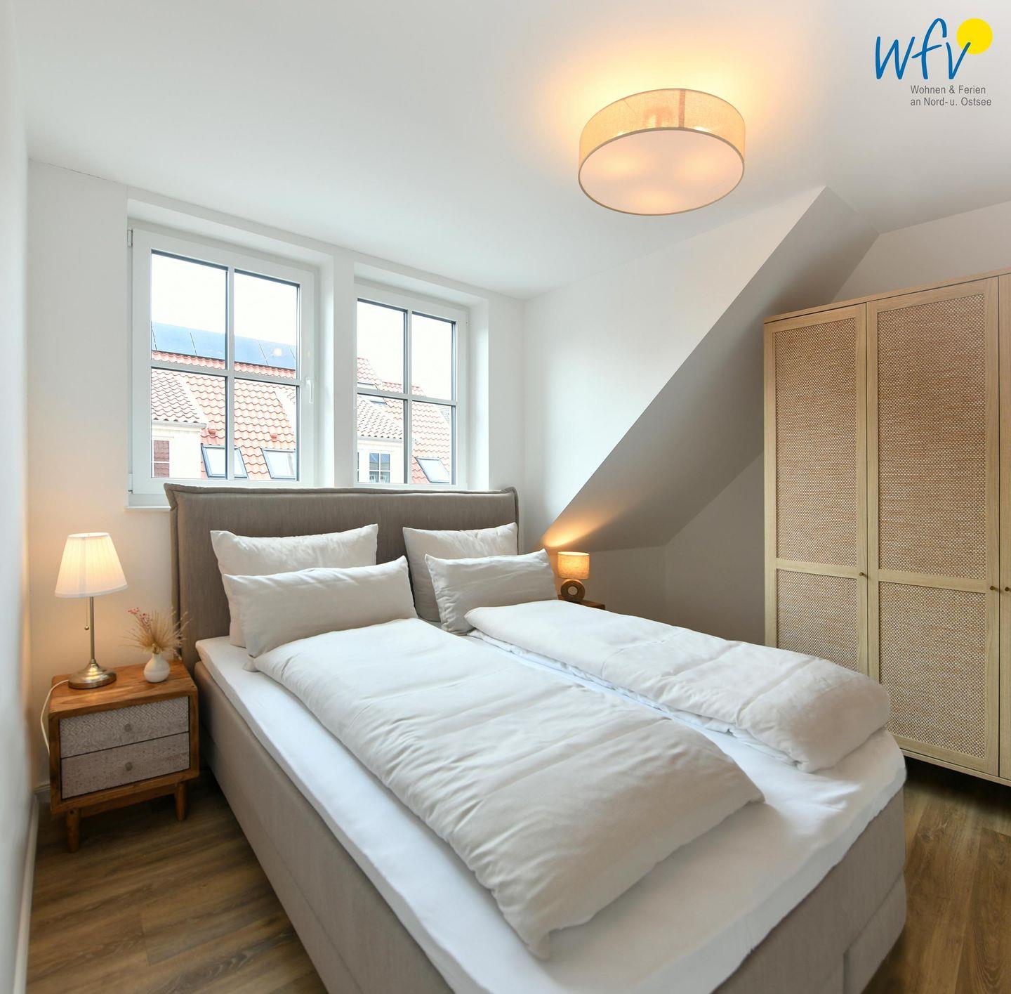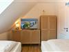 Die zwei separaten Schlafzimmer im Dachgeschoss bieten Ihnen sowohl Komfort, als auch Privatsphäre. Das Elternschlafzimmer ist mit einem großen Doppelbett ausgestattet (180 cm), das Kinderschlafzimmer mit zwei eleganten Einzelbetten, die bei Bedarf auch zu einem großen Doppelbett zusammengeschoben werden können.