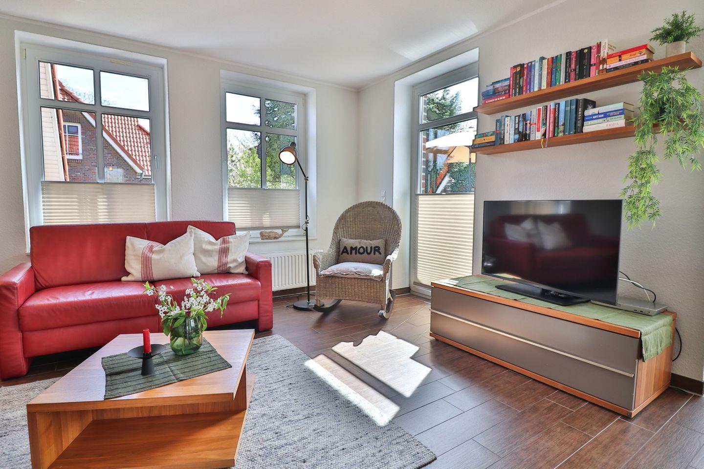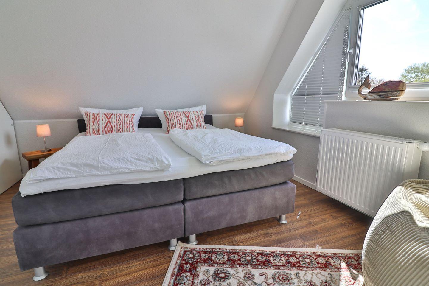 Zwei der drei Schlafzimmer sind mit Doppelbetten (je ca. 180x195 cm) ausgestattet, das dritte enthält zwei Einzelbetten (je 80x190 cm). In allen Schlafzimmern finden Sie hochwertige Boxspringbetten mit passenden Toppern sowie Kleiderschränke und Kommoden für Ihre persönlichen Dinge, in beiden Doppelzimmern ebenfalls Fernseher für zusätzlichen Komfort. Die Verdunkelung erfolgt über Plissees für einen erholsamen Schlaf.