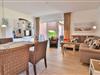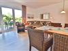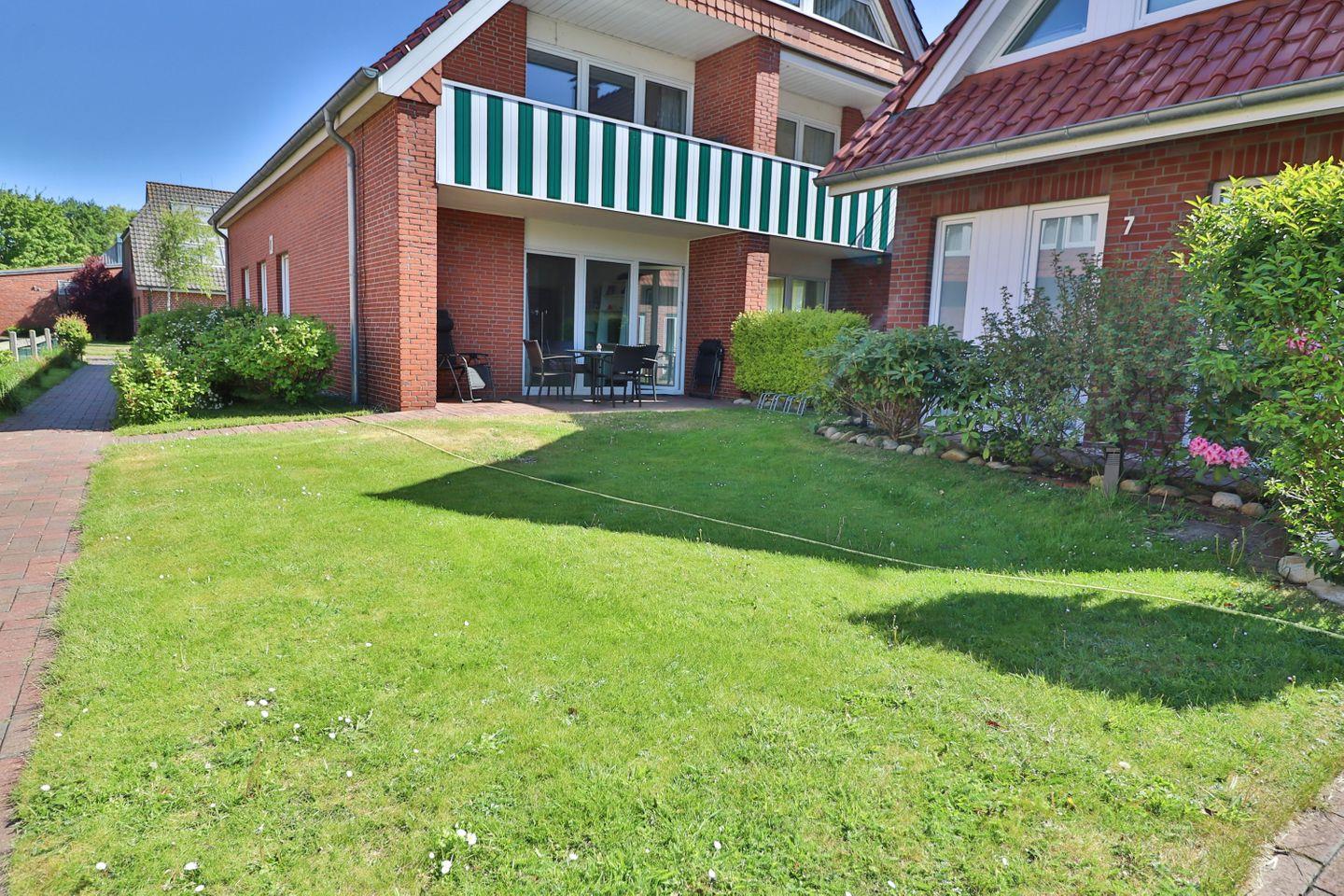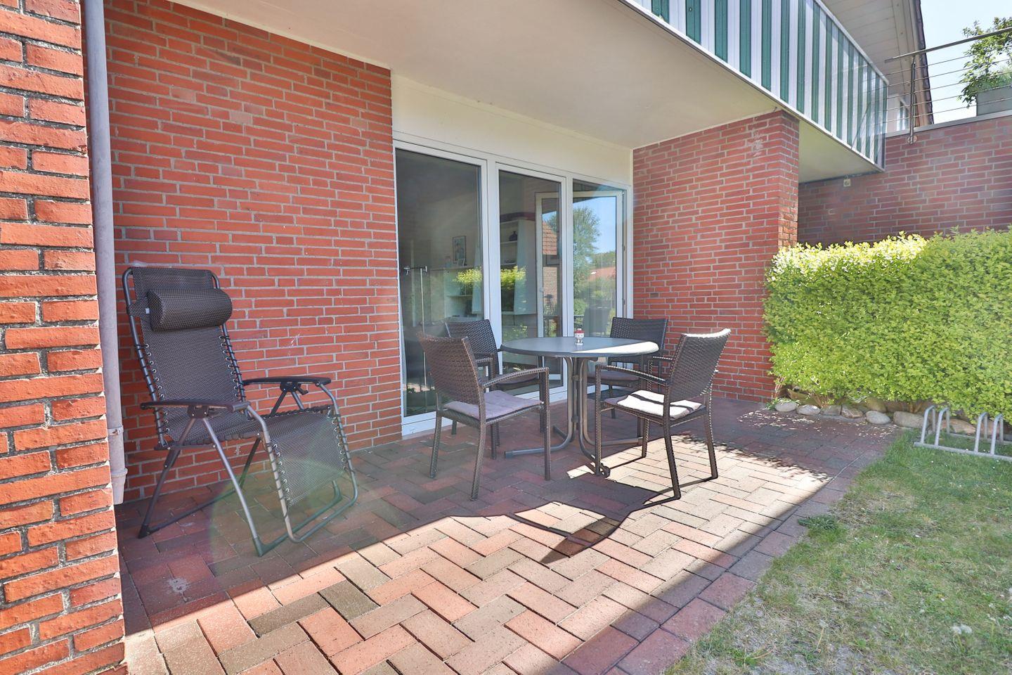 Ein besonderes Highlight dieser Wohnung ist die überdachte Terrasse mit Gartenmöbeln und direktem Zugang zum Garten hinter dem Haus, der zum Verweilen im Freien einlädt und entspannte Momente bei schönem Inselwetter bietet.