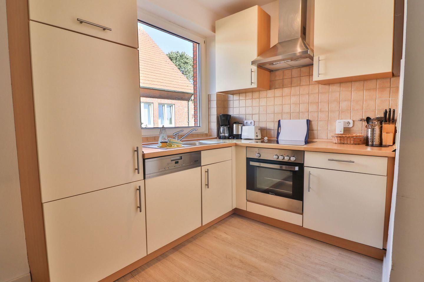 Die offene Küche ist direkt ans Wohnzimmer angeschlossen und mit allen wichtigen Küchengeräten ausgestattet. Dazu zählen ein 4-Platten-Herd, Backofen, Kühlschrank, Spülmaschine, Wasserkocher, Kaffeemaschine und Toaster. Weitere Küchenutensilien sind in ausreichender Menge vorhanden, sodass Sie Mahlzeiten nach Ihren eigenen Wünschen gestalten.