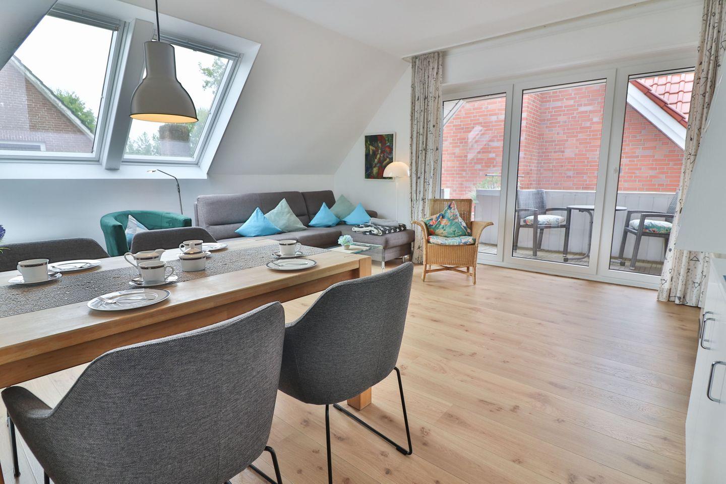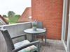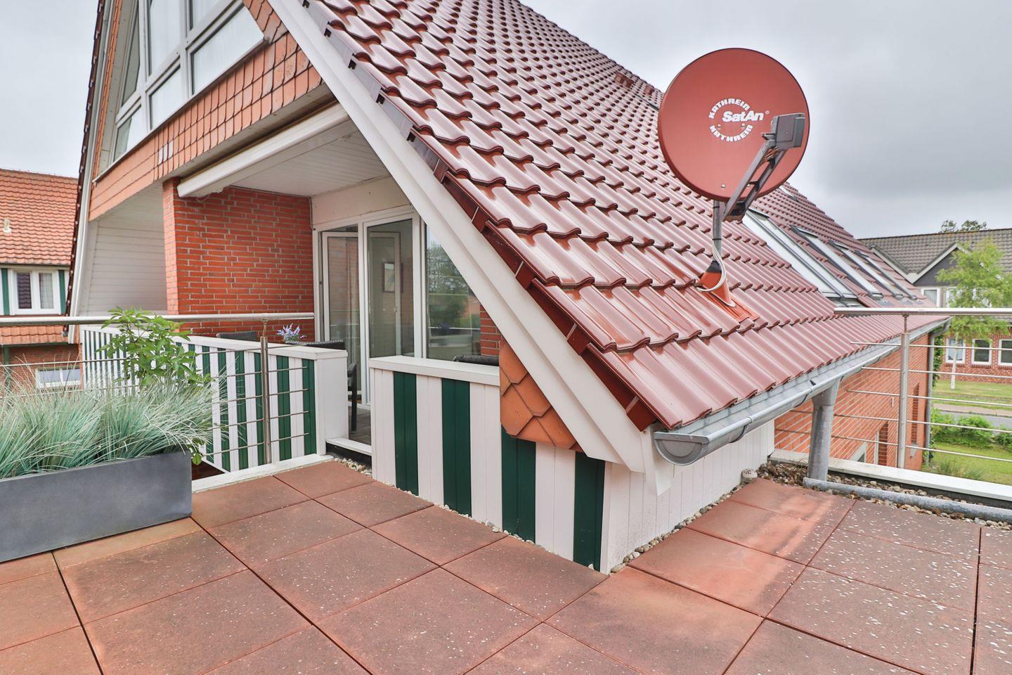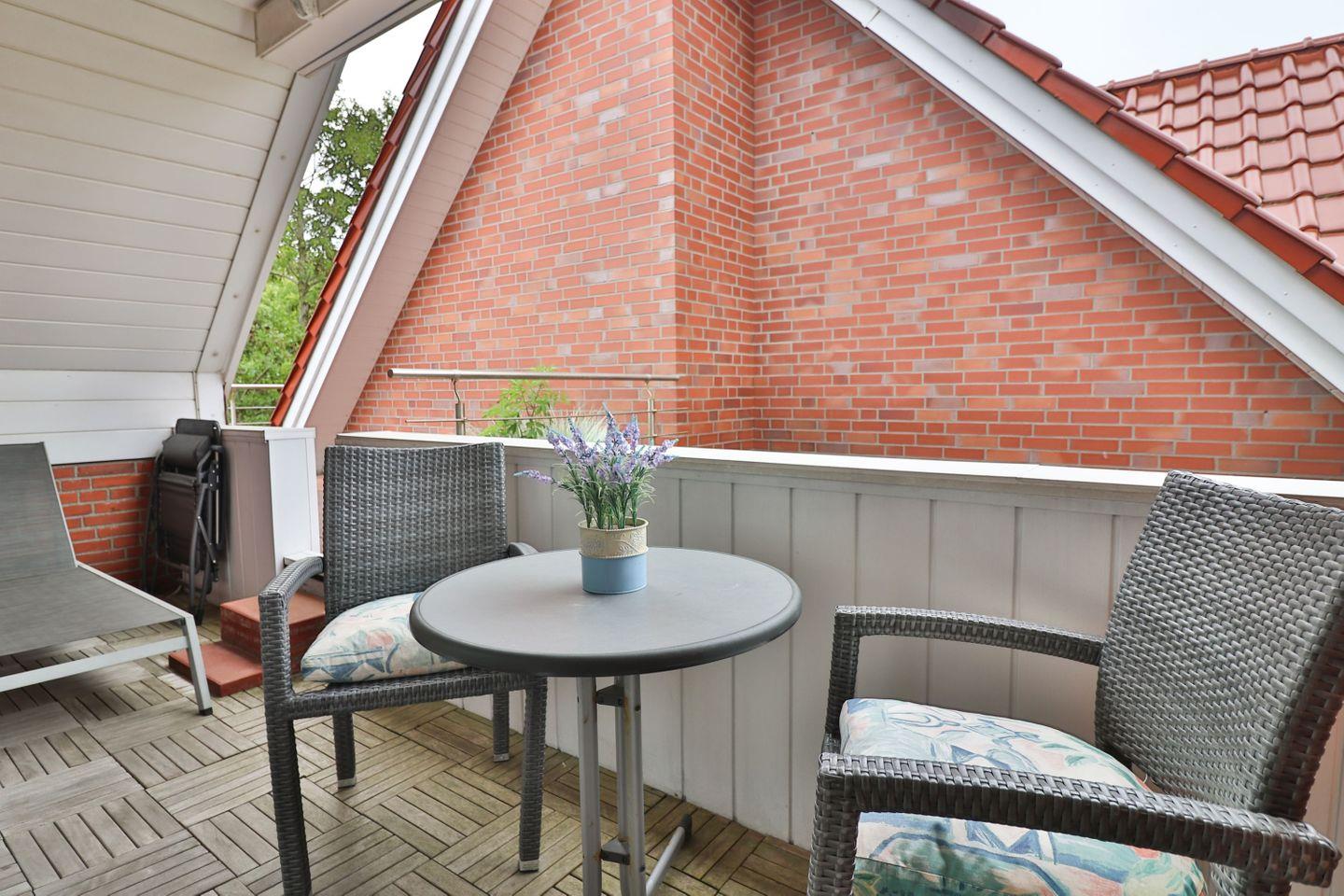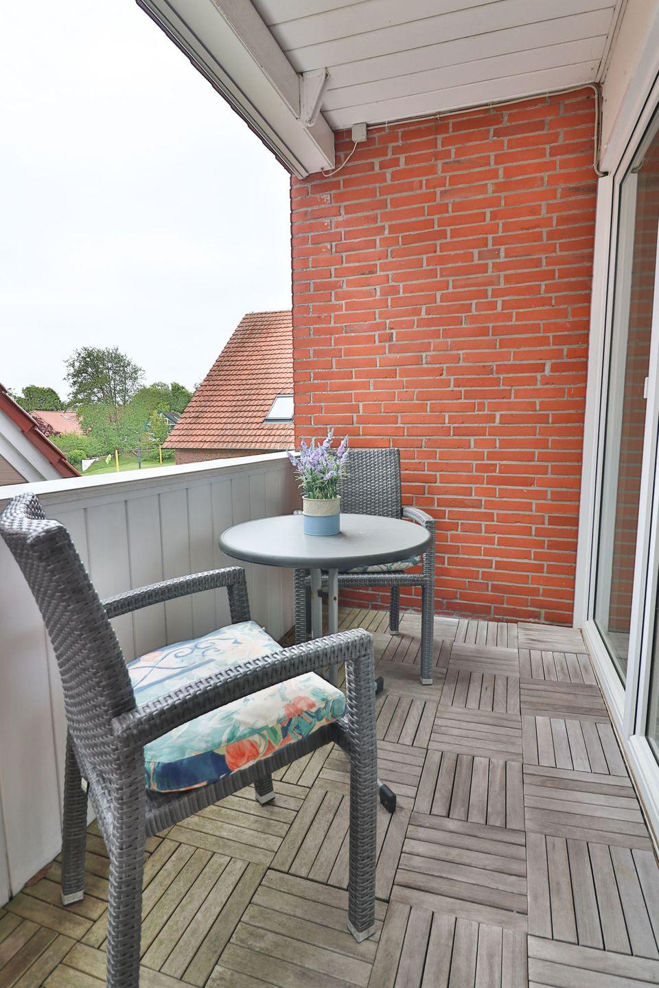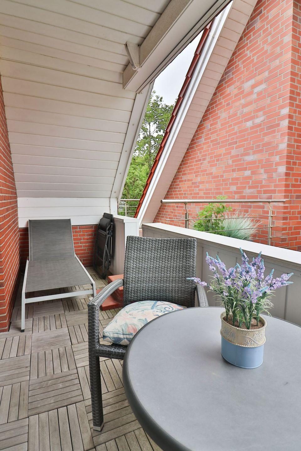 Der zum Teil überdachte Balkon ist mit Gartenmöbeln und Sonnenliegen ausgestattet und bietet Ihnen die Möglichkeit, die frische Nordseeluft zu genießen – unabhängig vom Wetter. Ob Sie morgens in Ruhe frühstücken oder abends entspannen möchten, der Balkon ist ein Rückzugsort im Freien.