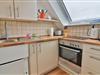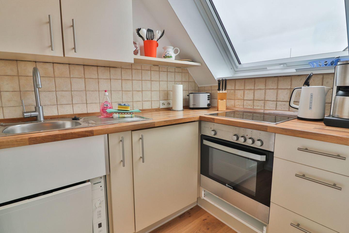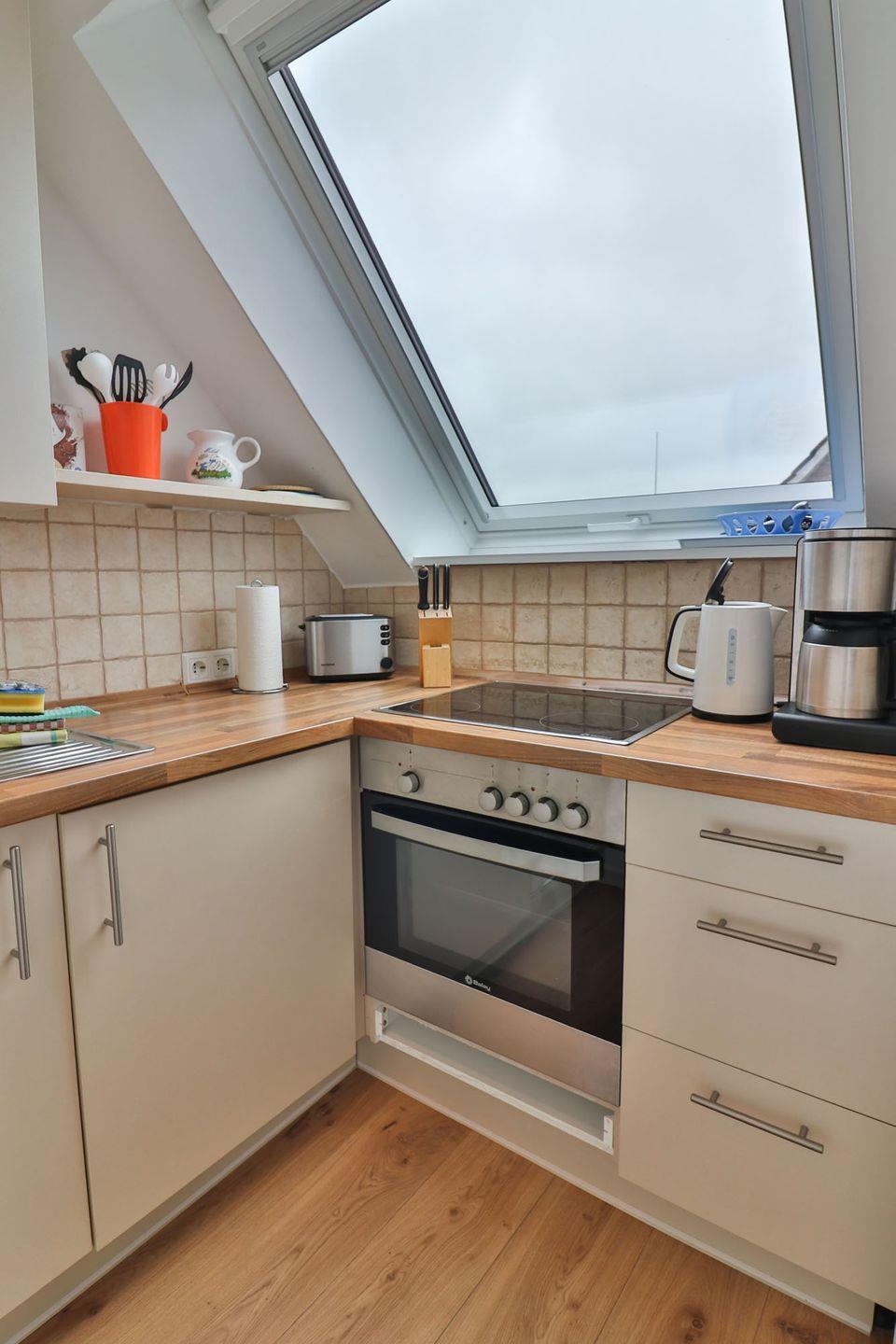 Die separate Küche ist umfassend und funktional eingerichtet: Ein 4-Platten-Herd, Backofen, Toaster, Wasserkocher, Kaffeemaschine sowie eine kleine Spülmaschine stehen bereit, ebenso ein Kühlschrank und sämtliche Küchenutensilien.