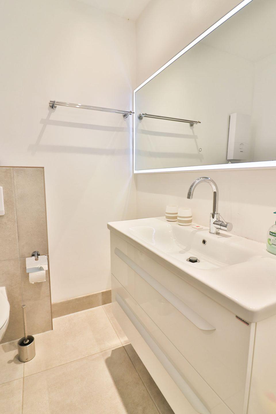 Das moderne Badezimmer ist mit einer bodengleichen Dusche, Waschbecken, Spiegel, Haartrockner und WC ausgestattet.