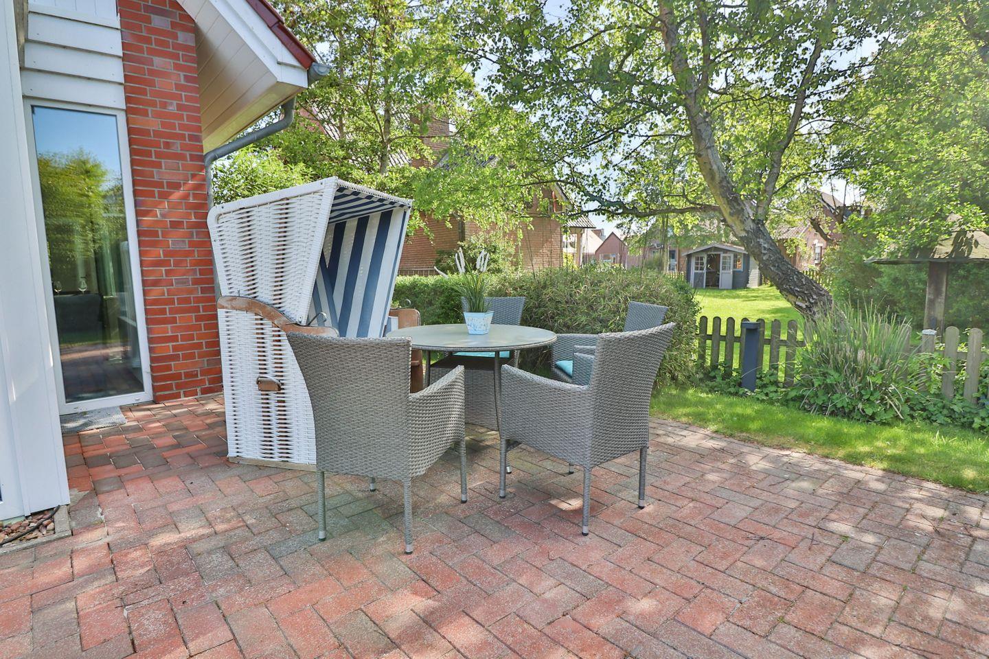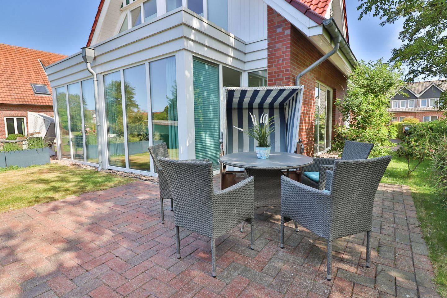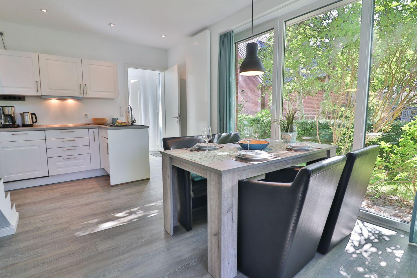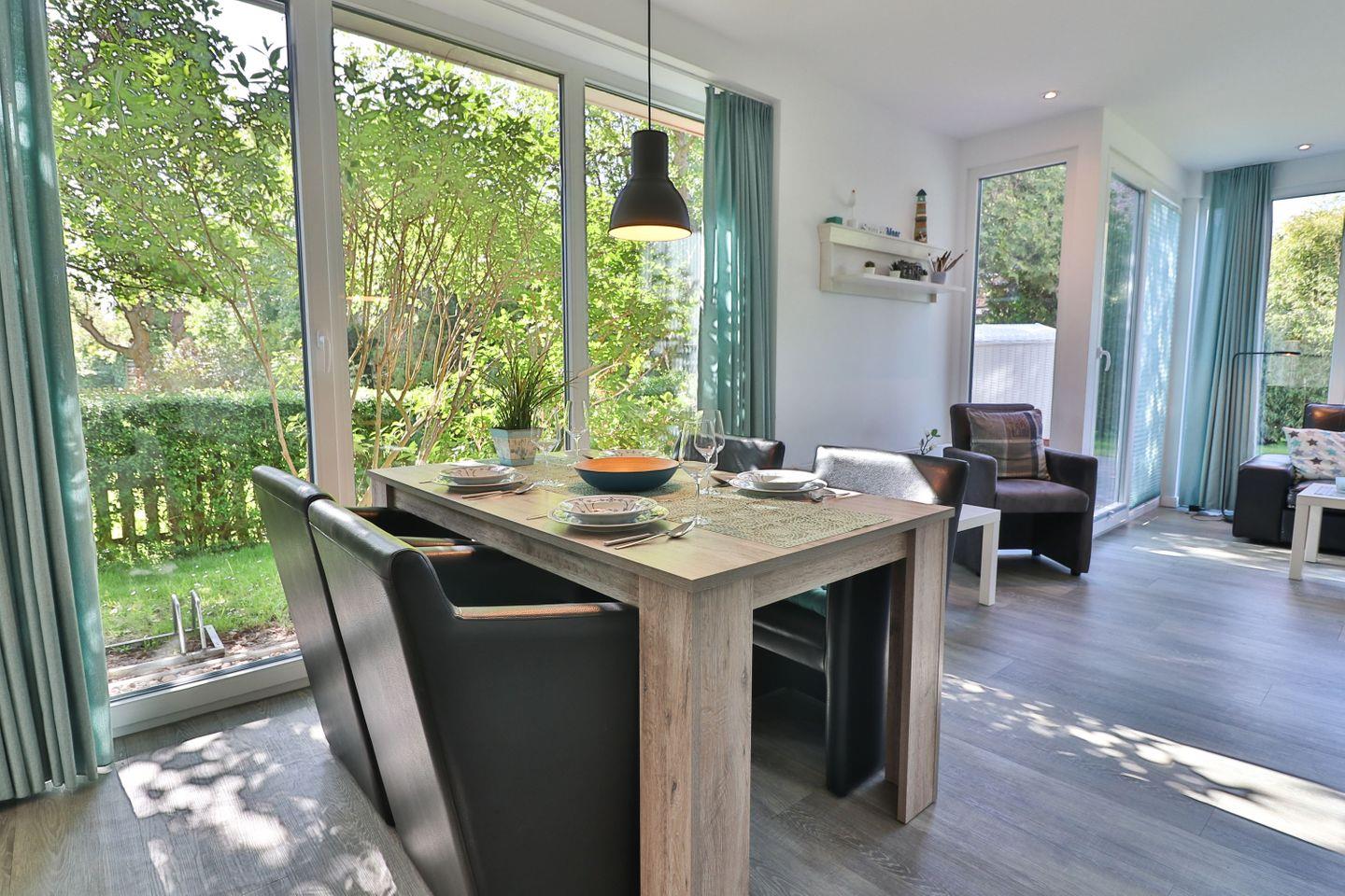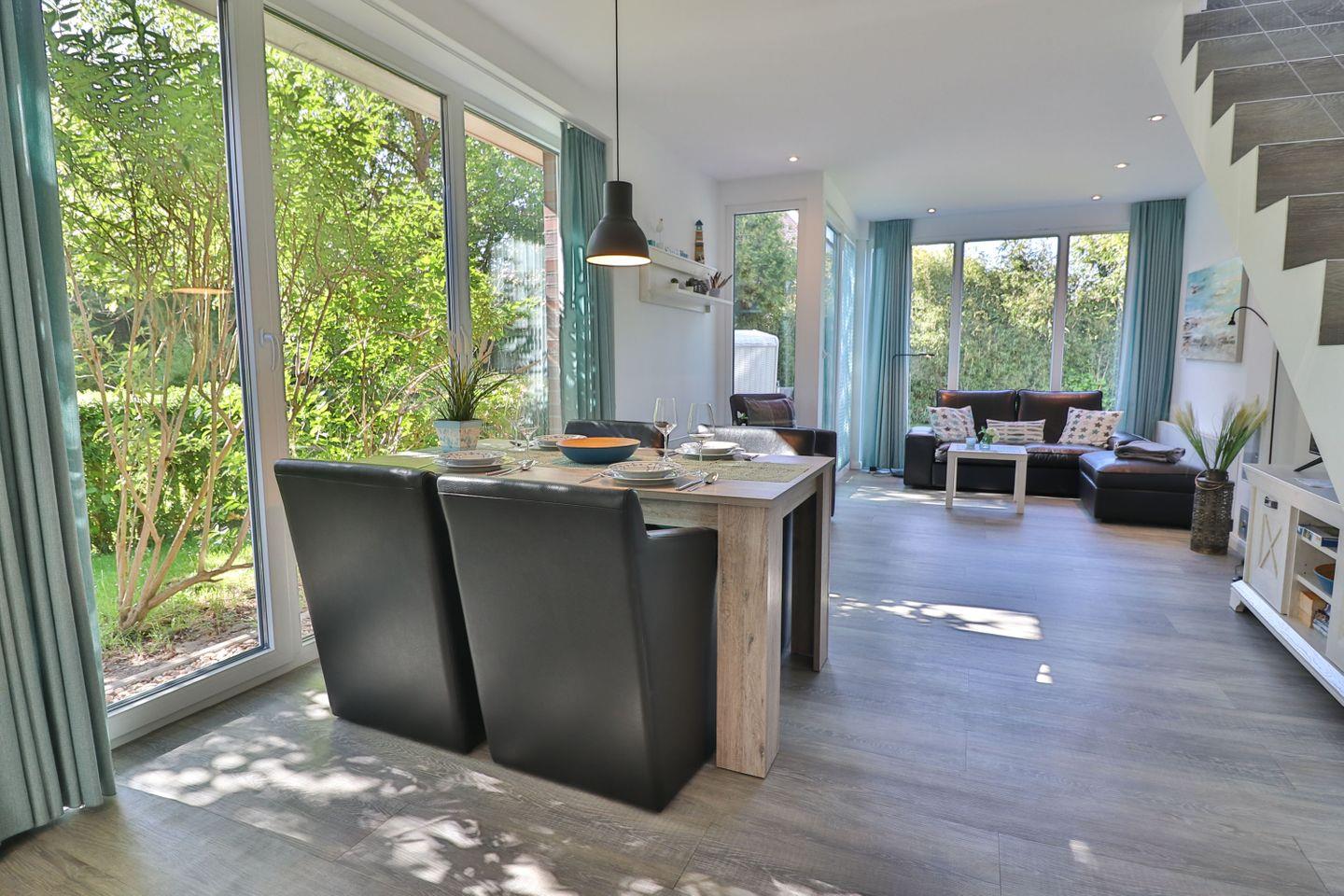 Im Erdgeschoss erwartet Sie ein großzügiges, lichtdurchflutetes Wohn- und Esszimmer mit einer großen Fensterfront, die den Blick in den ruhig gelegenen Garten auf der Rückseite des Hauses freigibt. Von hier aus gelangen Sie direkt auf die möblierte Terrasse mit Tisch, Stühlen und einem Strandkorb – der perfekte Ort für entspannte Stunden im Freien. Der Wohnbereich bietet ein komfortables Sofa, einen Fernseher und lädt zum Ausruhen nach einem Strandspaziergang oder Inselausflug ein. Der angrenzende Essbereich schafft eine gemütliche Atmosphäre für gemeinsame Mahlzeiten, Spieleabende oder geselliges Beisammensein.