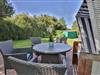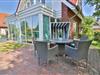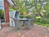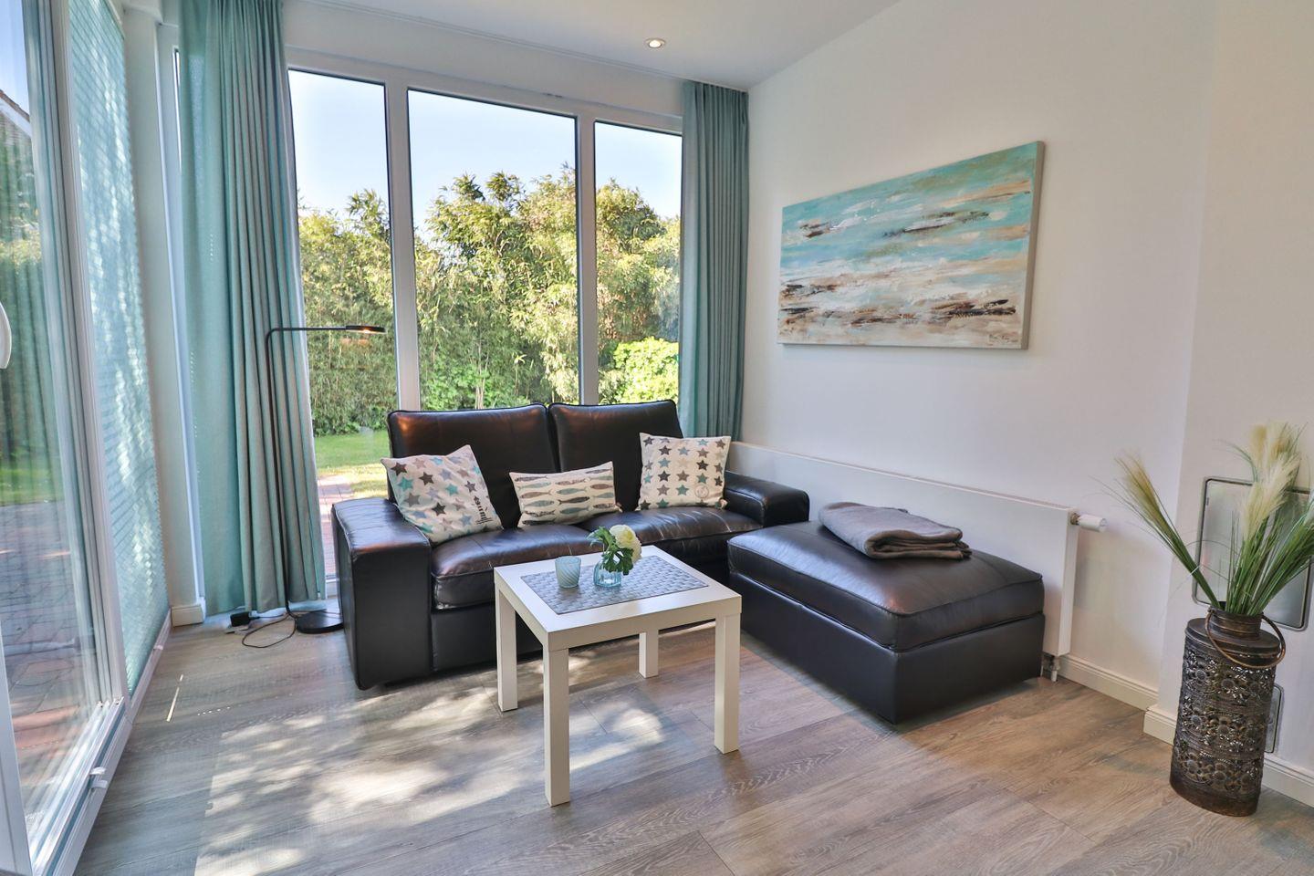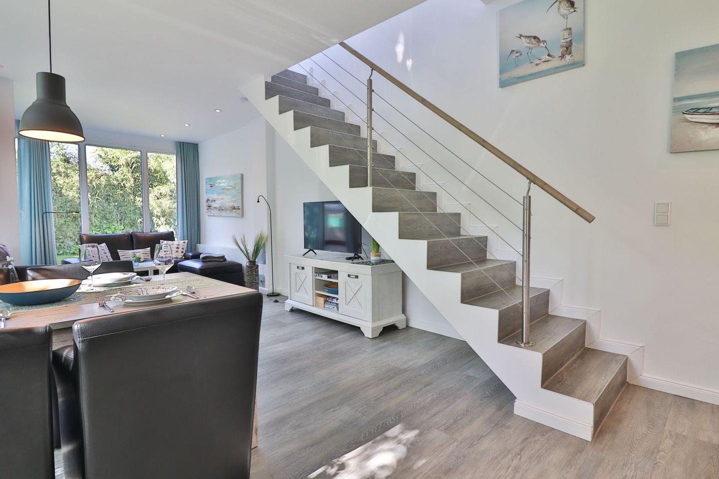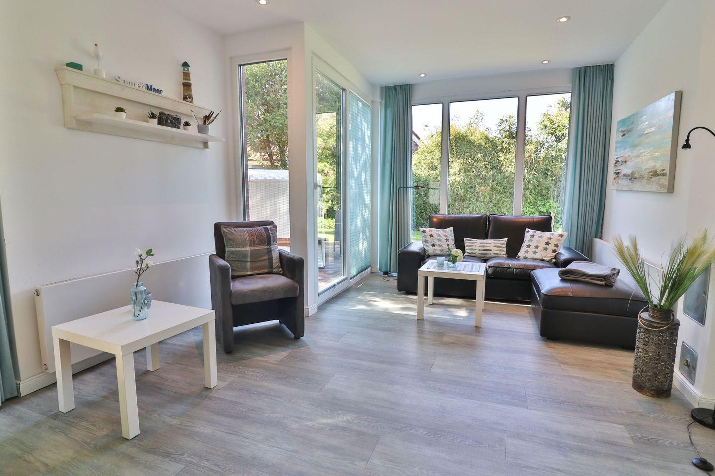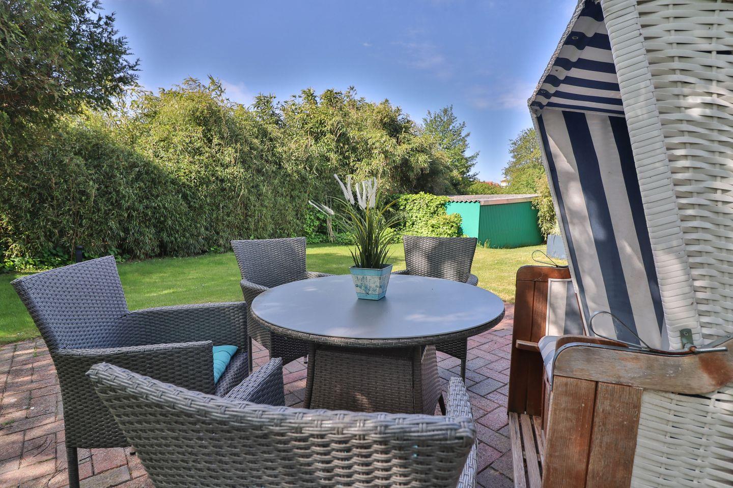 Im Erdgeschoss erwartet Sie ein großzügiges, lichtdurchflutetes Wohn- und Esszimmer mit einer großen Fensterfront, die den Blick in den ruhig gelegenen Garten auf der Rückseite des Hauses freigibt. Von hier aus gelangen Sie direkt auf die möblierte Terrasse mit Tisch, Stühlen und einem Strandkorb – der perfekte Ort für entspannte Stunden im Freien. Der Wohnbereich bietet ein komfortables Sofa, einen Fernseher und lädt zum Ausruhen nach einem Strandspaziergang oder Inselausflug ein. Der angrenzende Essbereich schafft eine gemütliche Atmosphäre für gemeinsame Mahlzeiten, Spieleabende oder geselliges Beisammensein.