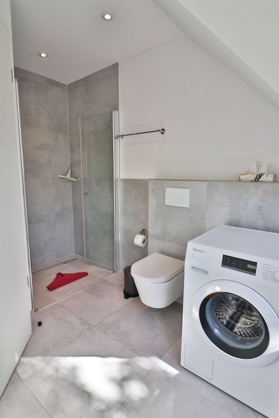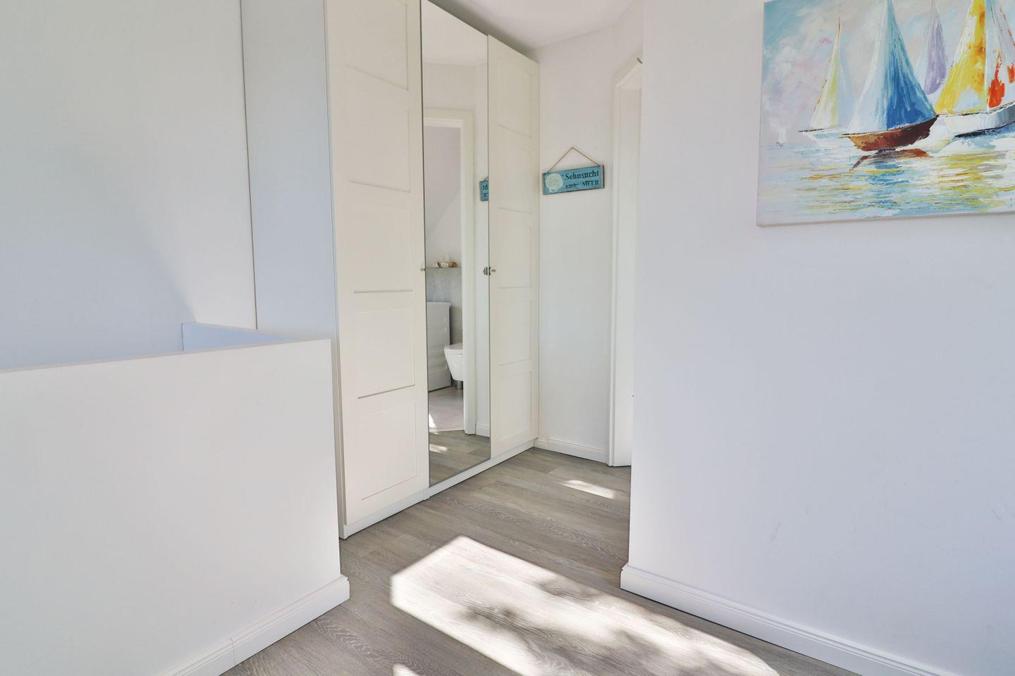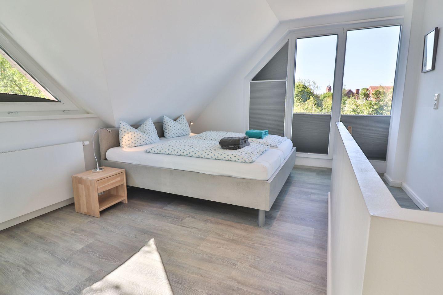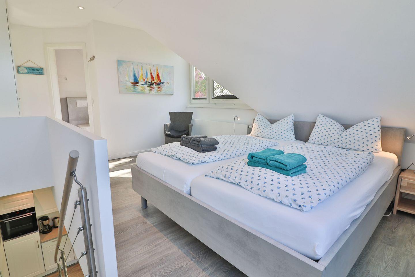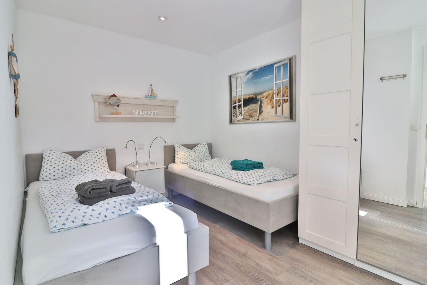 Die Ferienwohnung verfügt über zwei Schlafzimmer: Im Erdgeschoss befindet sich ein Schlafzimmer mit zwei Einzelbetten (je 90 x 200 cm) und Kleiderschrank – ideal für Kinder oder Freunde. Über eine offene Treppe gelangen Sie ins Obergeschoss, wo sich ein weiteres Schlafzimmer mit einem gemütlichen Doppelbett (180 x 200 cm) befindet. Beide Etagen sind jeweils mit einem eigenen, modernen Badezimmer ausgestattet. Die Bäder verfügen über bodengleiche Duschen, WC und Waschbecken, im oberen Bad steht Ihnen zusätzlich eine eigene Waschmaschine zur Verfügung – ideal auch für längere Aufenthalte.