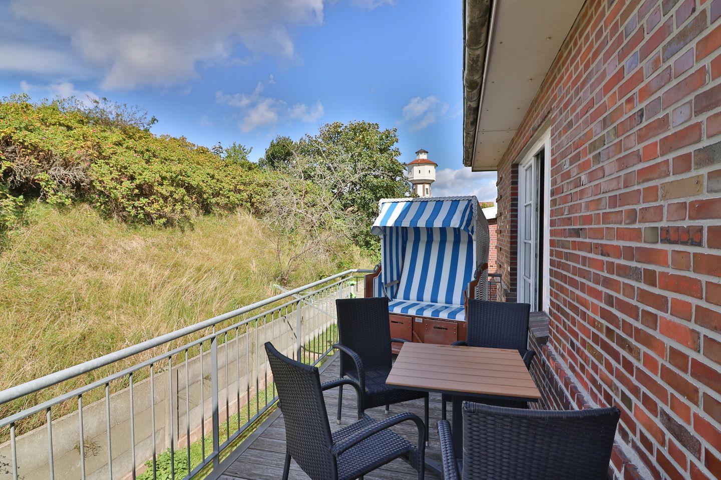 Ein weiteres Highlight ist der am Dünenrand gelegene Balkon mit Blick auf den Wasserturm und die katholische Kirche, auf dem Gartenmöbel und ein eigener Strandkorb zum Entspannen einladen. Für erholsame Stunden in der Natur stehen Ihnen im gemeinschaftlich nutzbaren Garten Sonnenstühle und weitere Gartenmöbel zur Verfügung. Kinder profitieren von einem Sandkasten, einer Schaukel und den Spielgeräten auf dem Spielplatz direkt am Haus. Familien mit Kleinkindern finden somit ideale Voraussetzungen für einen unbeschwerten Aufenthalt vor.