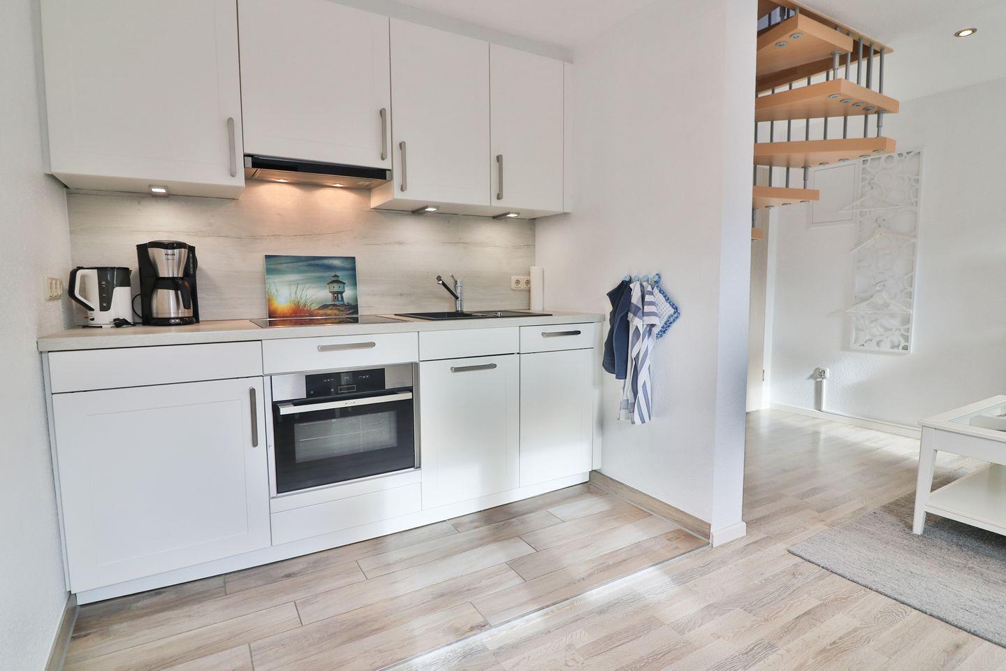 Die moderne Küchenzeile ist umfassend ausgestattet. Sie verfügt über einen Kühlschrank mit integriertem Gefrierfach, eine Spülmaschine, einen Herd mit vier Kochplatten und ein Kombigerät aus Backofen und Mikrowelle. Toaster, Wasserkocher und Kaffeemaschine sind ebenso vorhanden. Geschirr, Besteck, Töpfe, Küchenutensilien und Geschirrhandtücher werden bereitgestellt, sodass Sie jederzeit für Ihr leibliches Wohl sorgen können.