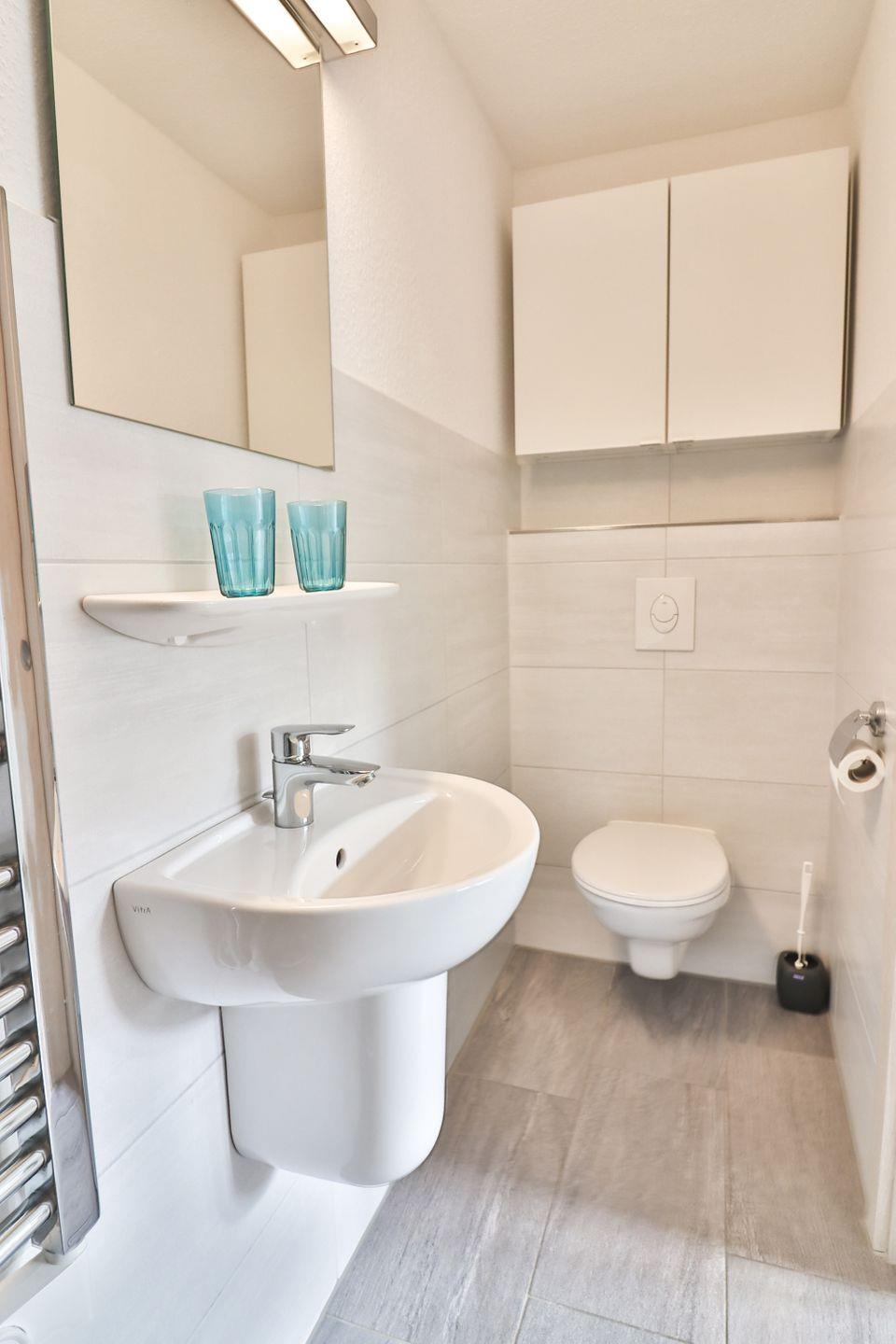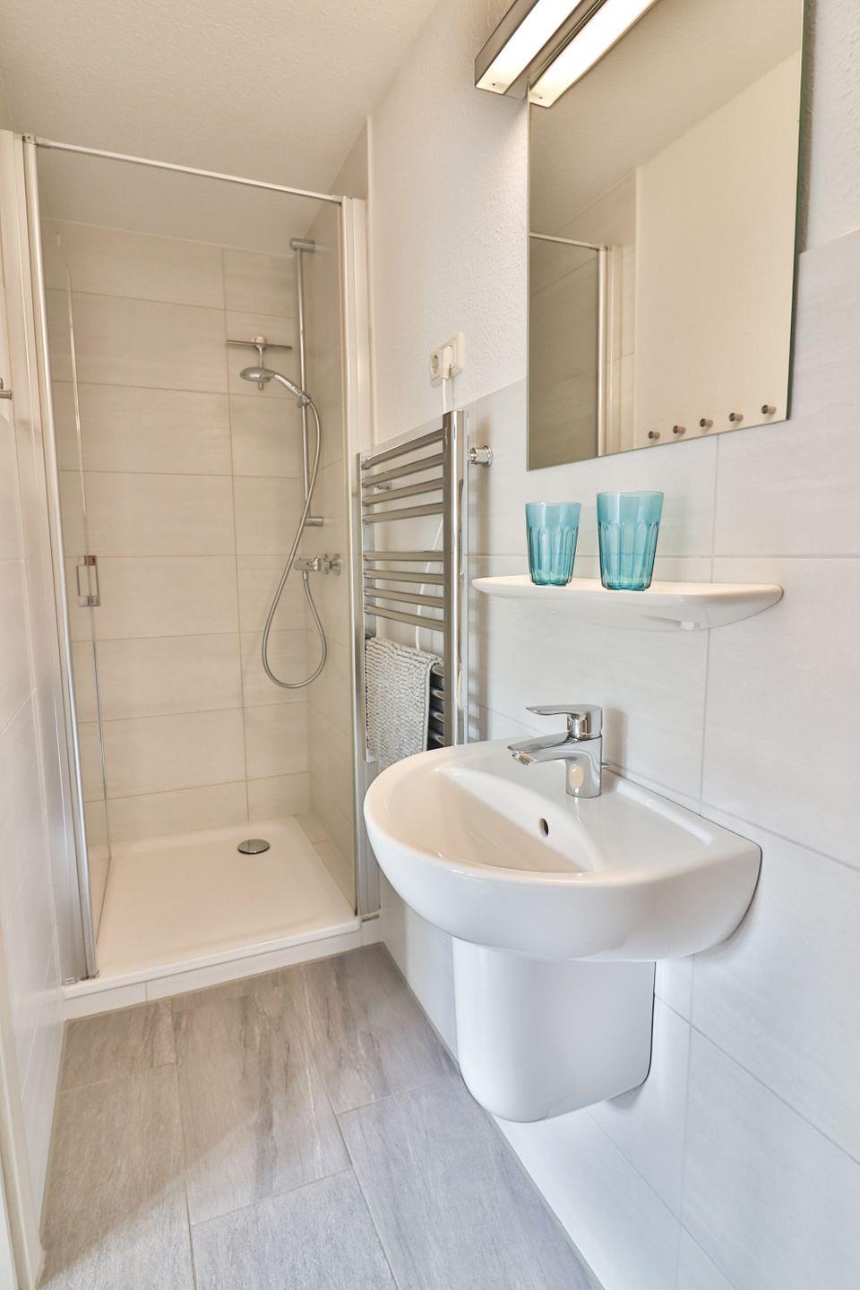 Im Badezimmer finden Sie eine Dusche, ein Waschbecken, ein WC und einen Föhn. Handtücher und Bettwäsche gehören zur Grundausstattung. Im gemeinschaftlich nutzbaren Waschraum können Sie Ihre Wäsche gegen Gebühr komfortabel waschen und trocknen.