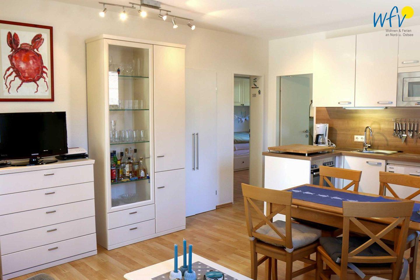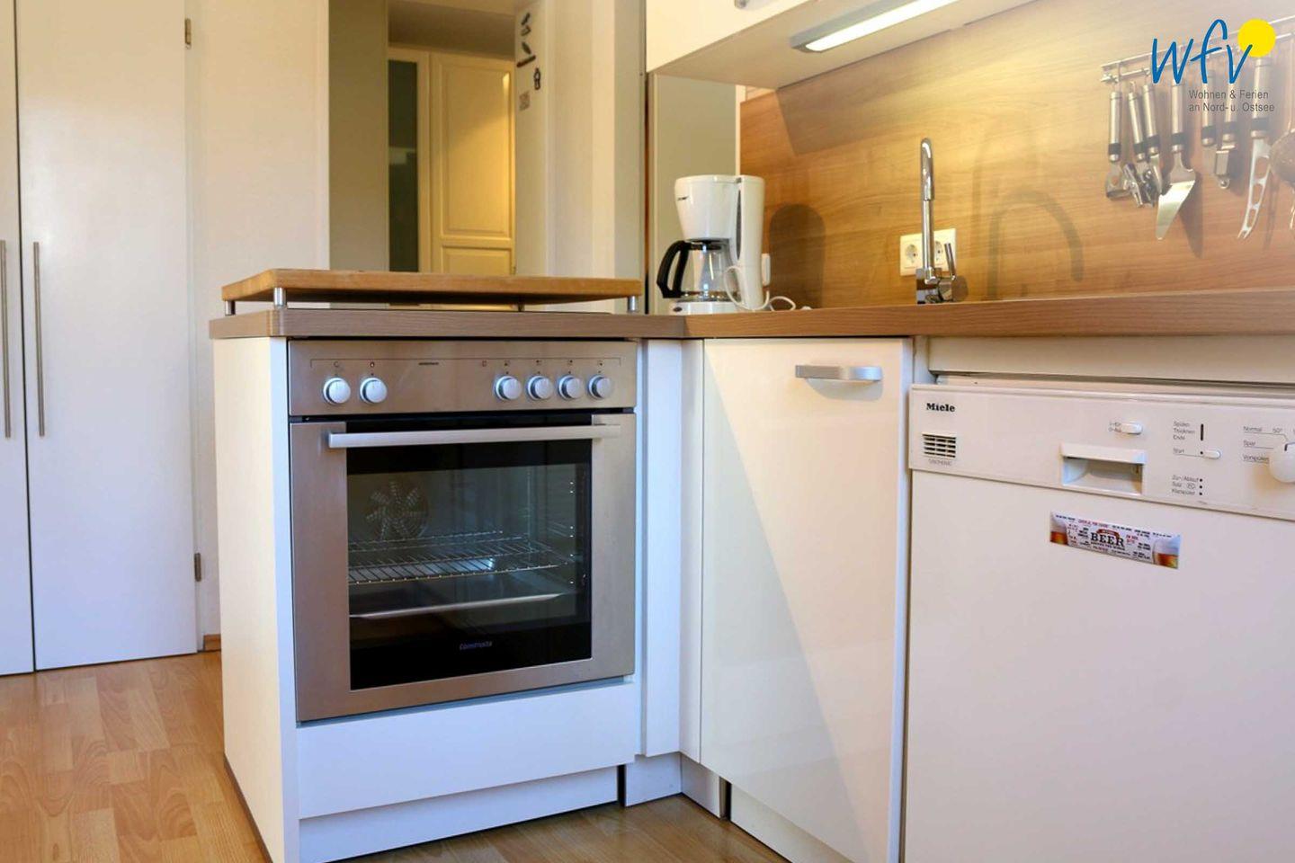 Mit insgesamt drei Zimmern, darunter ein gemütlicher Wohnraum und zwei separate Schlafzimmer, ermöglicht die Unterkunft sowohl gemütliches Beisammensein, als auch Privatsphäre. Im wohnlich gestalteten Essbereich können Sie gemeinsam speisen oder gesellige Abende verbringen. Leckere Mahlzeiten und kleine Snacks lassen sich schnell und bequem in der offenen Küche zubereiten. Hier finden Sie einen 4-Platten-Ceran-Herd, einen Backofen, eine Mikrowelle und eine Spülmaschine sowie einen Kühlschrank mit integriertem Gefrierfach. Für die Zubereitung verschiedenster Mahlzeiten stehen Ihnen außerdem eine Kaffeemaschine, ein Wasserkocher, ein Toaster, ein Mixer sowie ein großer Kontaktgrill zur Verfügung.