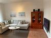 Die Wohnung verfügt über ein Wohnzimmer mit Couch und Essgelegenheiten sowie einem Flat-TV.