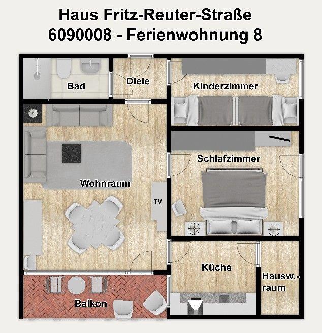 Herzlich willkommen in unserer gemütlichen "Ferienwohnung 8" im "Haus Fritz-Reuter-Straße", in zentraler und strandnaher Lage. Bei uns erwartet Sie eine rundum erholsame Auszeit auf Langeoog. Mit einem hellen Wohnraum, einer separaten Küche, einem eleganten Duschbad, zwei separaten Schlafzimmern und sonnigem Balkon bietet Ihnen die Ferienwohnung einen Wohlfühlort für bis zu vier Personen - perfekt für den Urlaub mit der Familie oder mit Freunden.