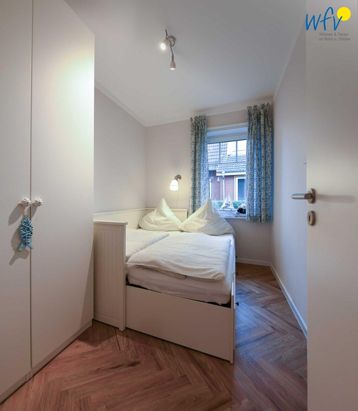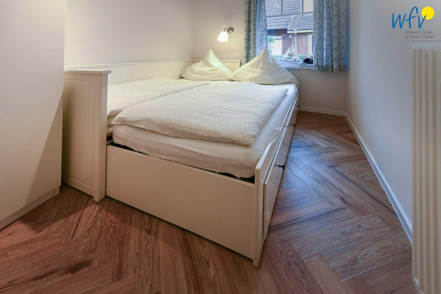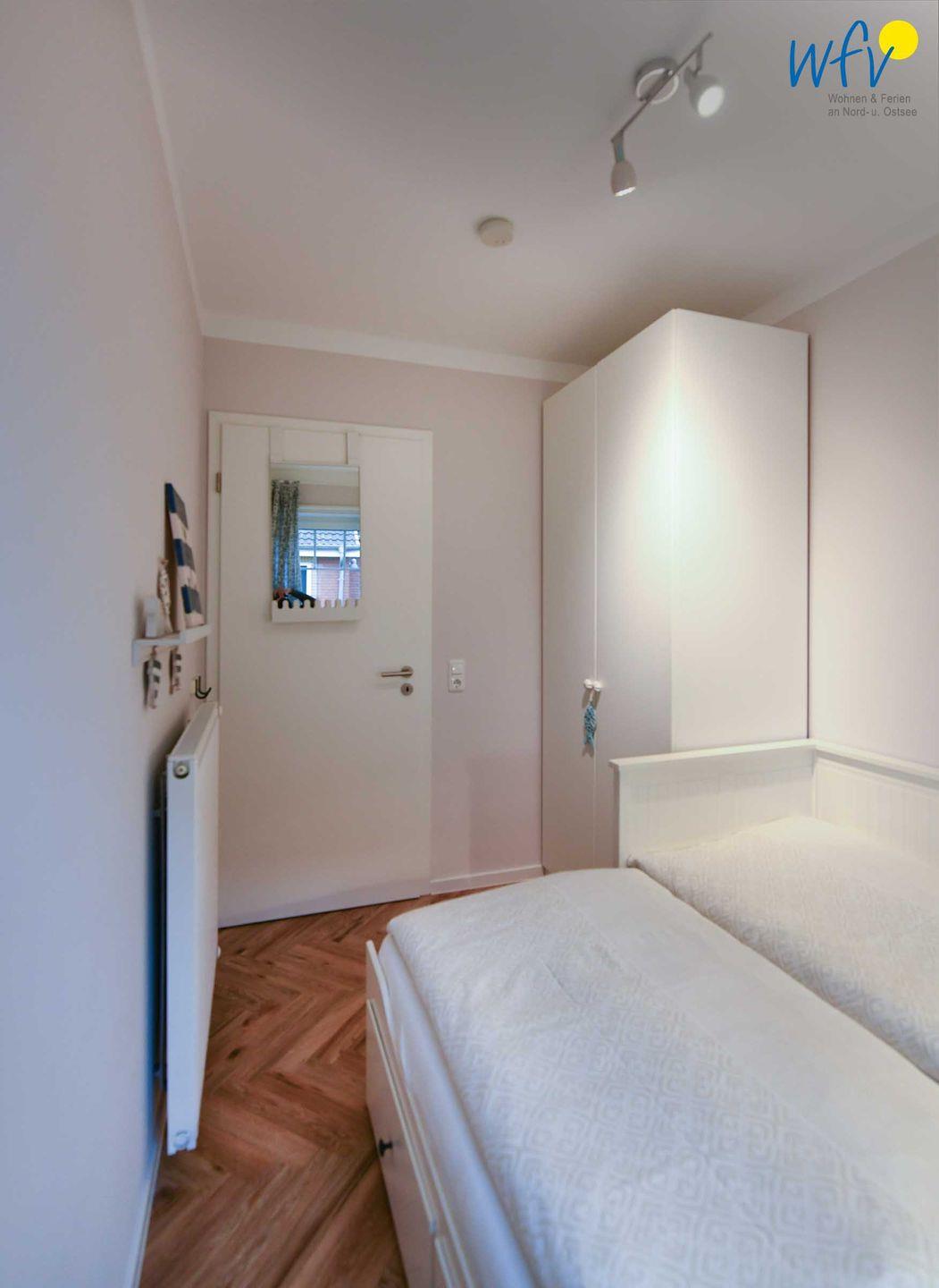 Wenn auf Langeoog die Sonne untergeht, finden Sie in den zwei separaten Schlafzimmern angenehme Rückzugsmöglichkeiten. Das größere Schlafzimmer ist mit einem Doppelbett (180 x 200 cm) und TV ausgestattet, während das zweite kleinere Schlafzimmer ein Einzelbett bietet, das sich bei Bedarf zu einem Doppelbett erweitern lässt (160 x 200 cm). In den großzügigen Kleiderschränken mit Fächern, Schubladen und genügend Kleiderbügeln können sie Ihre Kleidung und Gepäckstücke verwahren.