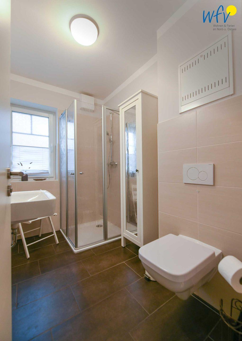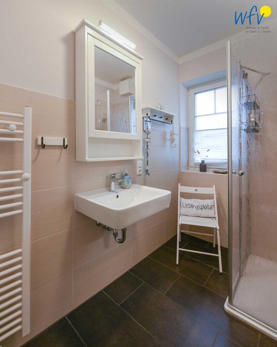 Das moderne Tageslichtbad mit flacher Dusche, Spiegelschrank, vielen Ablagen und Handtuchheizung sowie Föhn und Kosmetikspiegel ergänzt den Wohnkomfort.