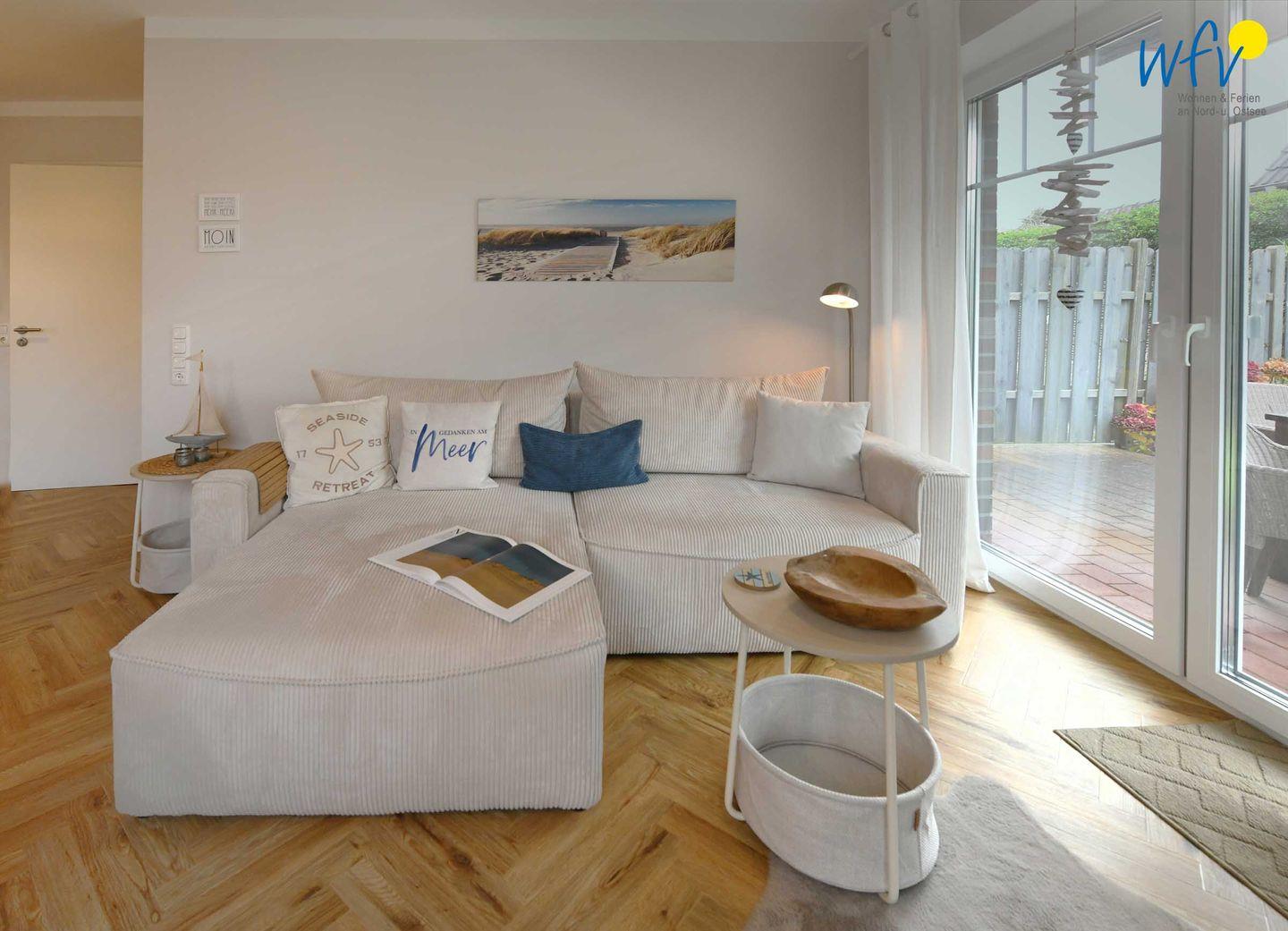 Der helle, großzügige Wohn/Essbereich ist wie die gesamte Wohnung in sanften Farben gehalten. Am Esstisch mit schönem Lichteinfall können Sie nach dem Strandtag oder der Fahrradtour gemütlich beisammen sitzen und Ihre Mahlzeiten genießen. Die bequeme Couchlandschaft bietet Ihnen Platz zum Entspannen, Fernsehen und Lesen. Ein modernes TV und eine HiFi-Anlage (+CDs) sowie freies WLAN sorgen für abwechslungsreiche Unterhaltung.