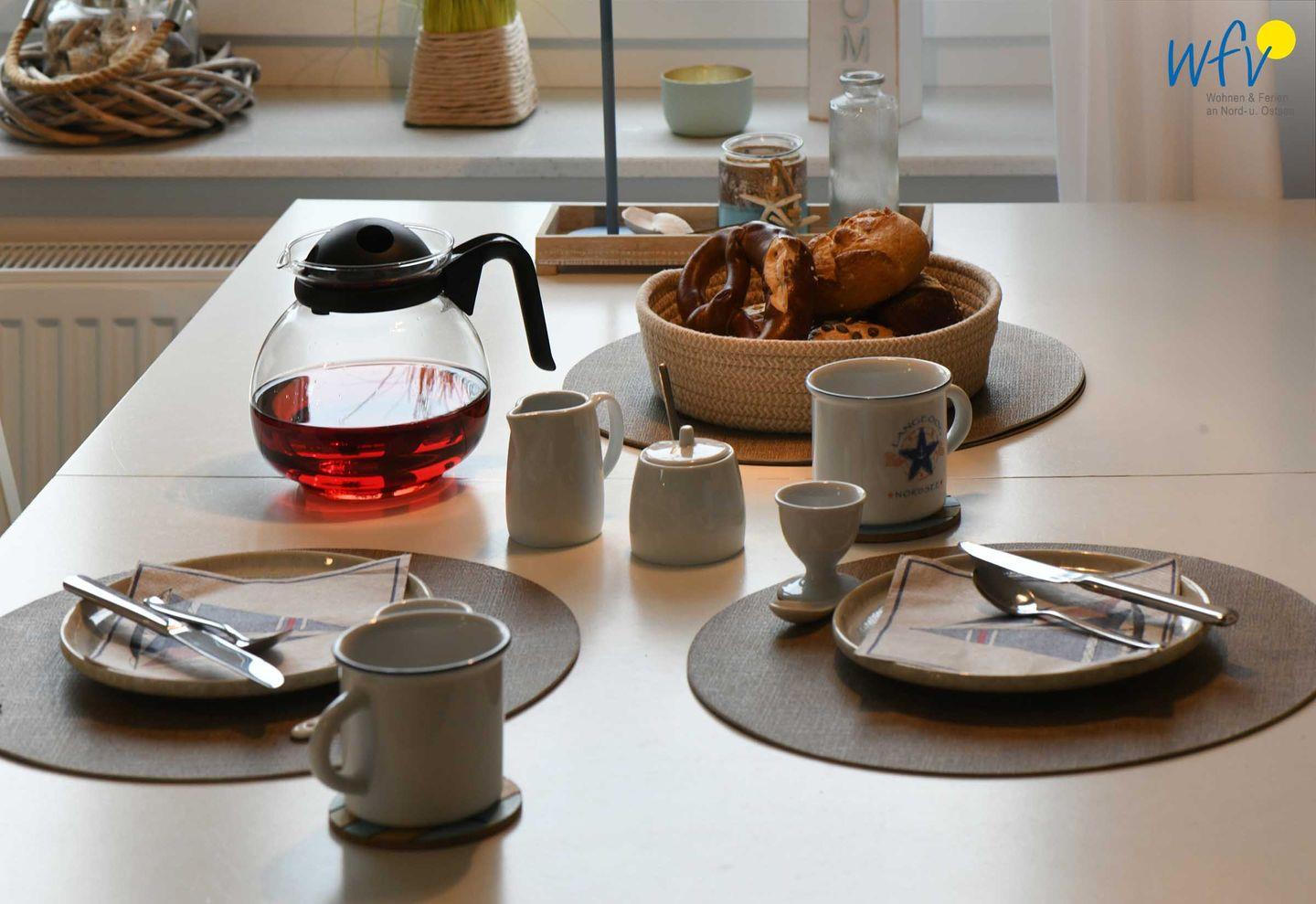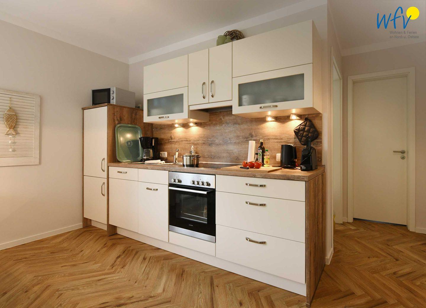 Oder Sie finden Ihren Lieblingsplatz in der offenen modernen Küche mit Küchenzeile - ein herrlicher Ort zum gemeinsamen Kochen und Klönen! Mit den hochwertigen Elektro- und Kleingeräten wie Mikrowelle, Ceranherd, Backofen, Kühl- und Gefrierschrank, Geschirrspülmaschine, Wasserkocher und Toaster lassen sich schnell und einfach leckere Gerichte zaubern oder Snacks für den Ausflug zubereiten. Als Kaffeegourmet können Sie zwischen einer Filterkaffeemaschine und einer Nespresso-Kapselmaschine wählen.