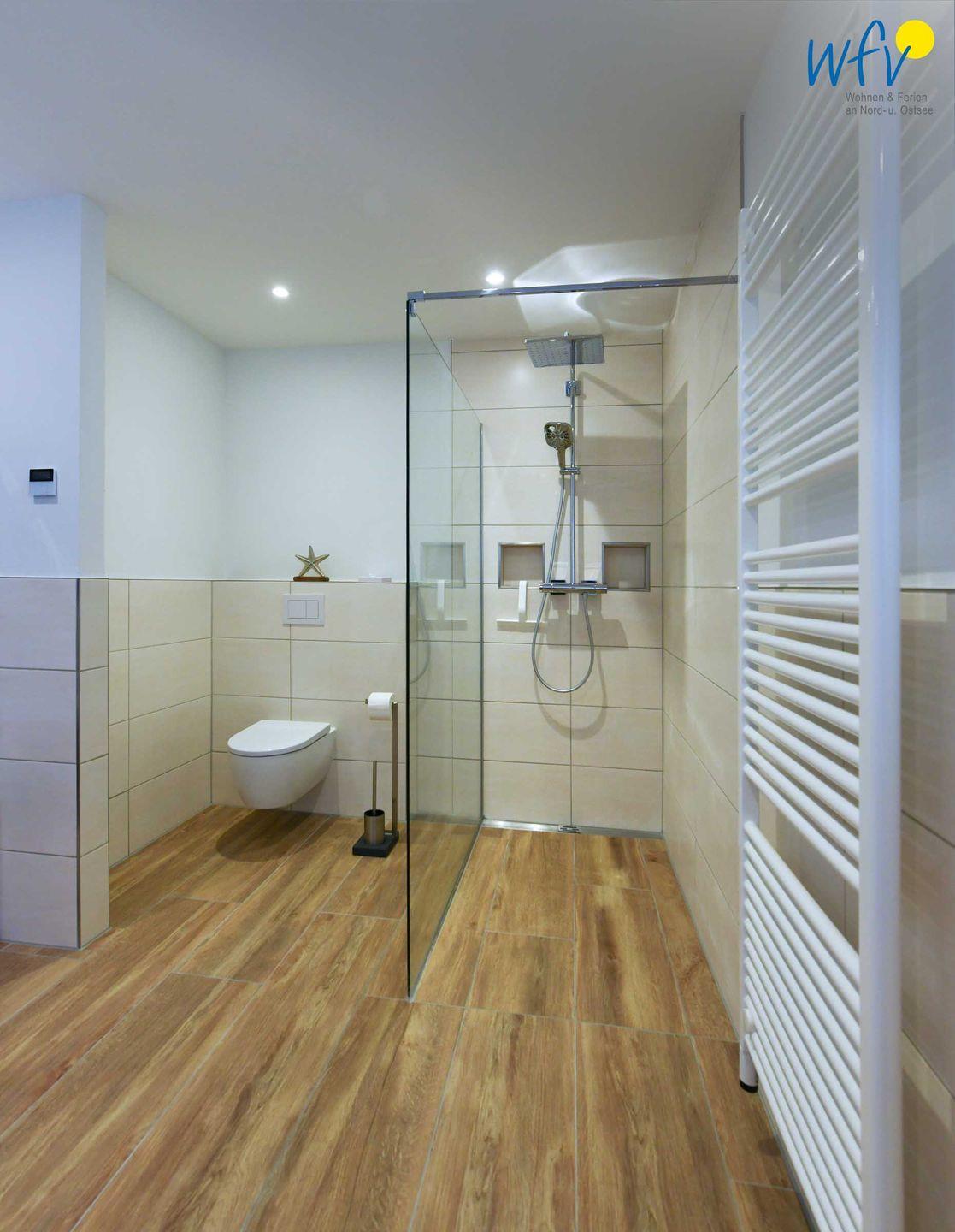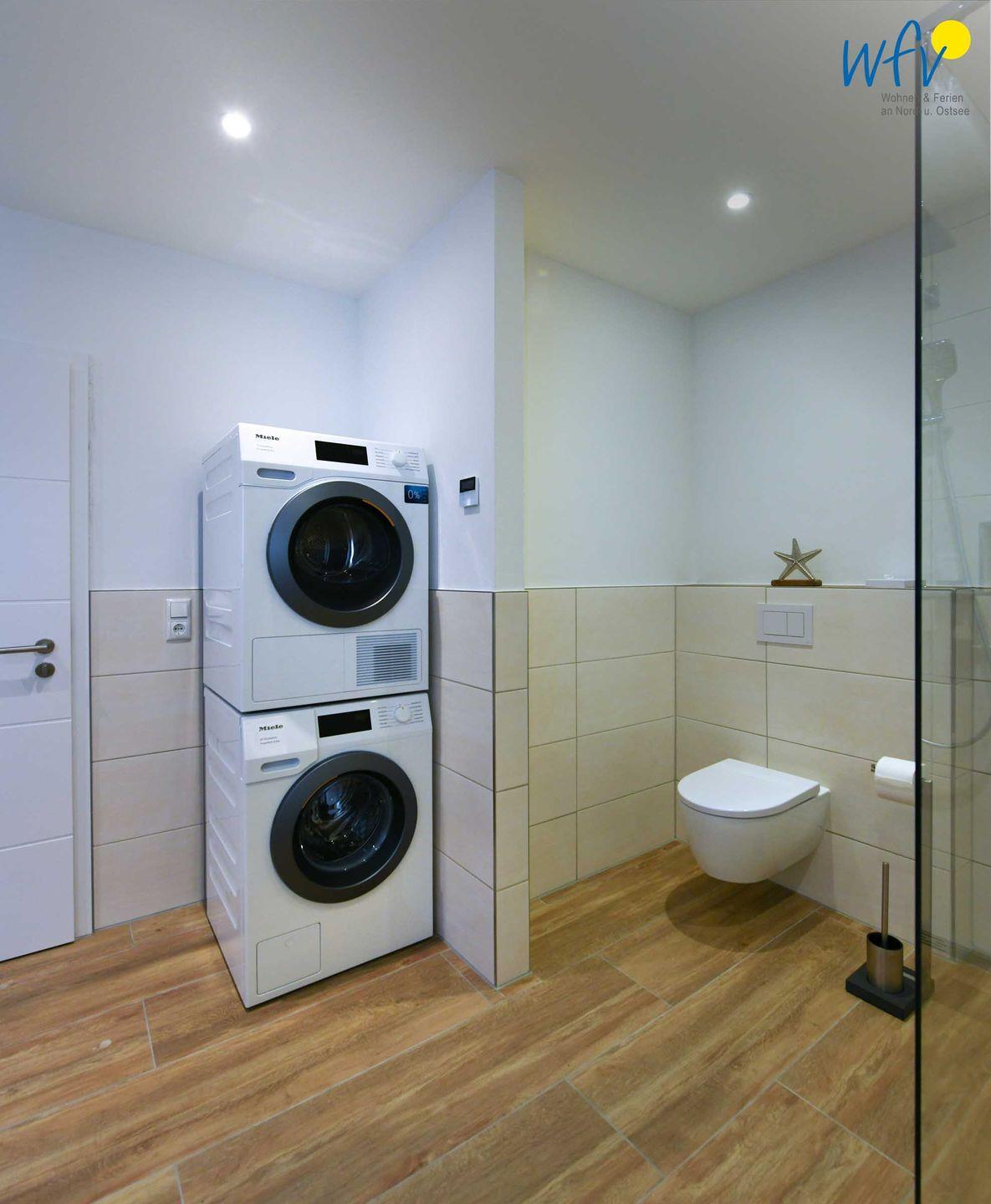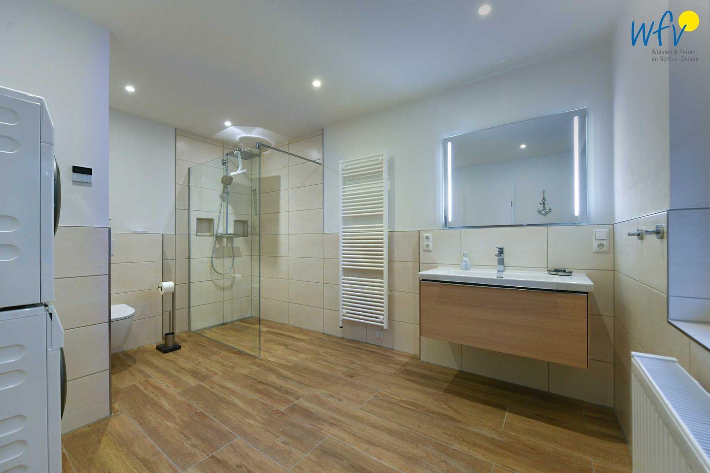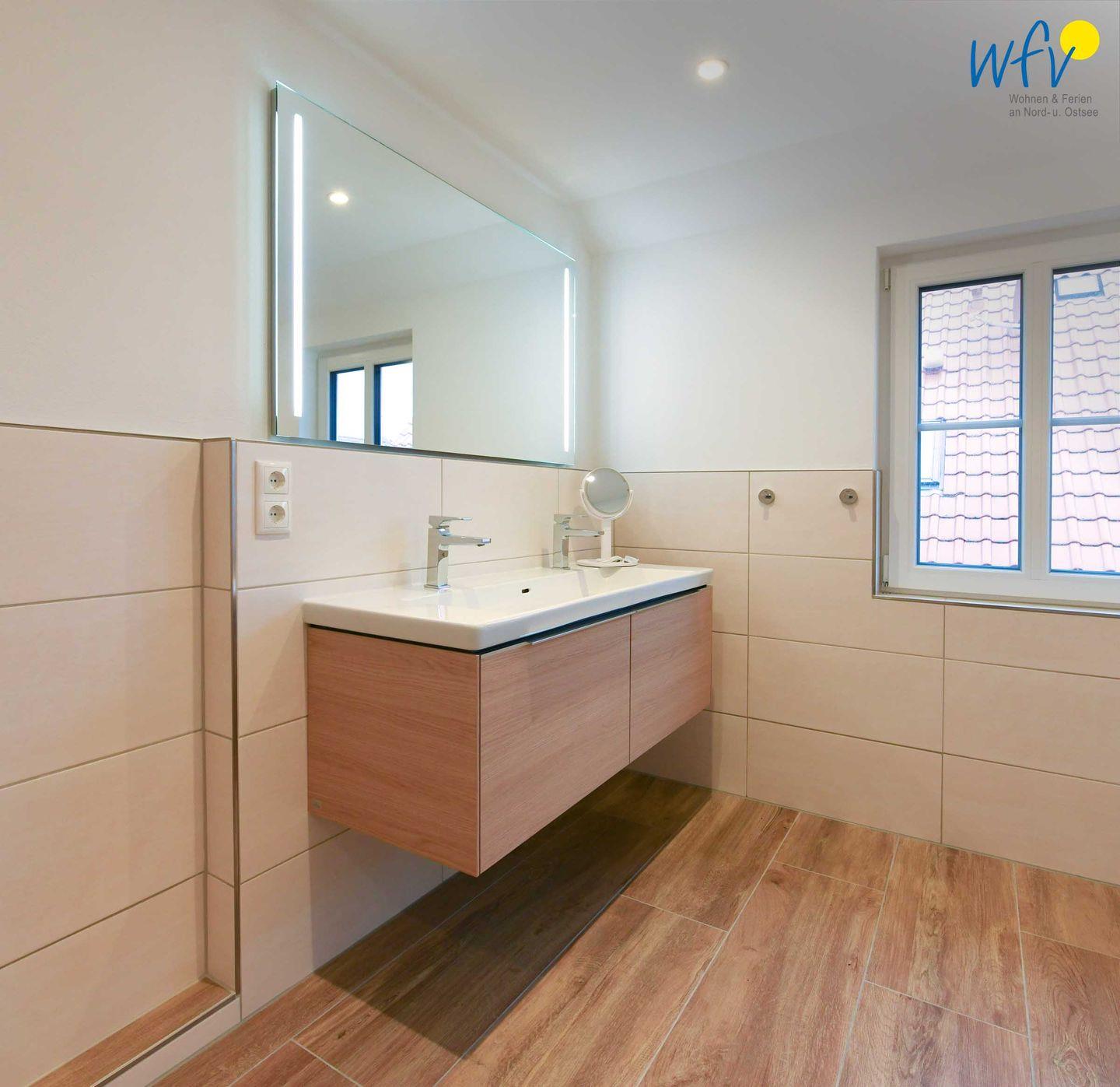 Zwei großzügige lichtdurchflutete Tageslichtbäder (EG + OG) mit moderner und hochwertiger Einrichtung in harmonischen Farben sowie ein zusätzliches Gäste-WC sorgen für angenehme Ausweichmöglichkeiten und wohltuende Entspannungszeit. Große Regenduschen (bodengleich) mit Walk-in für das ultimative Duscherlebnis, elegante Waschtische und Handtuchheizungen ergänzen den Komfort. In einem Bad befinden sich zudem Waschmaschine und Trockner.