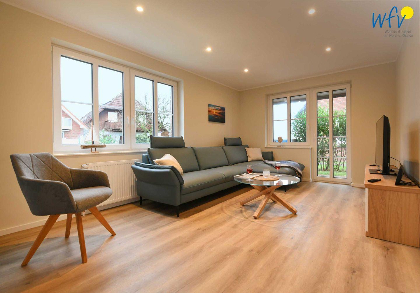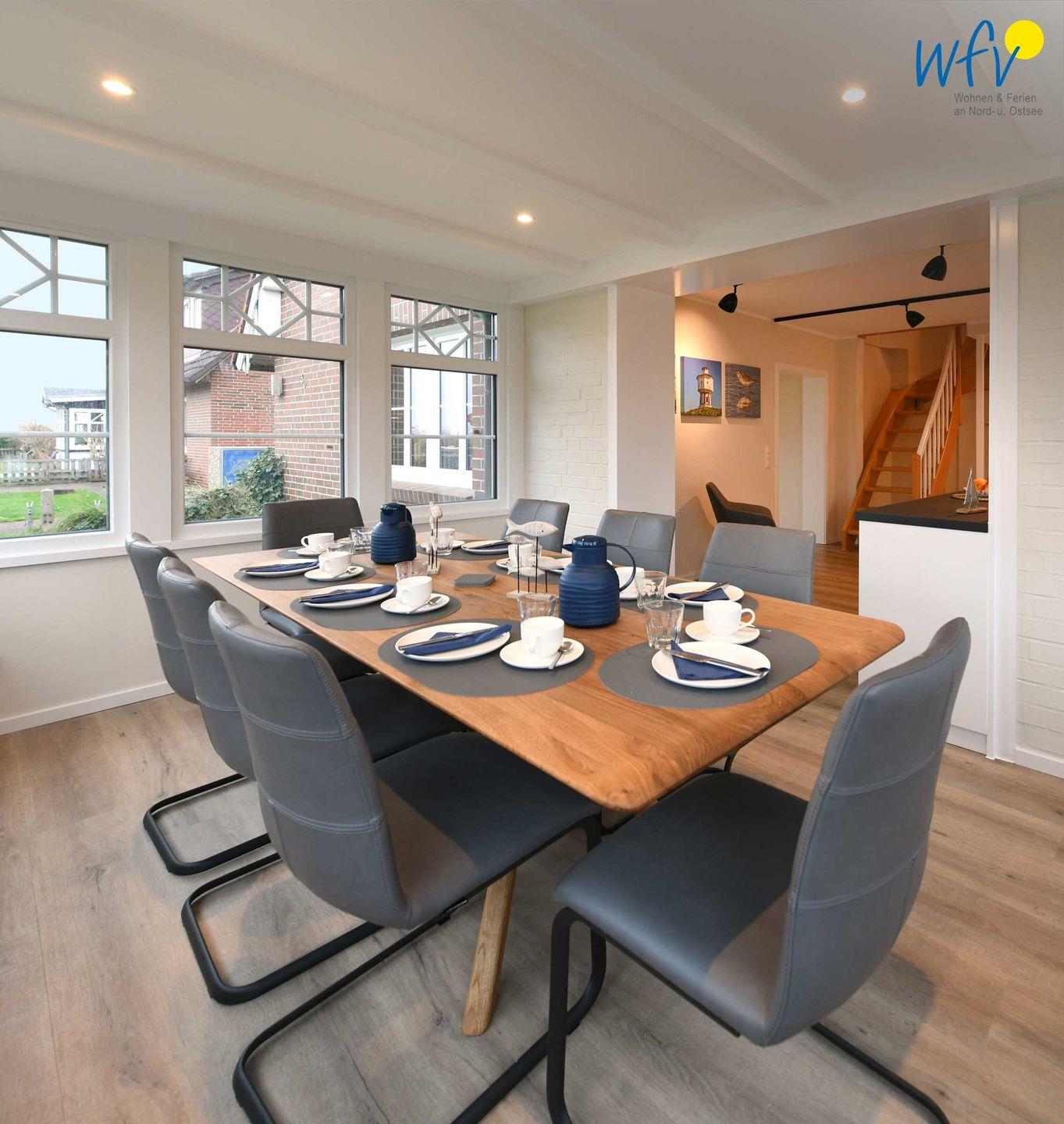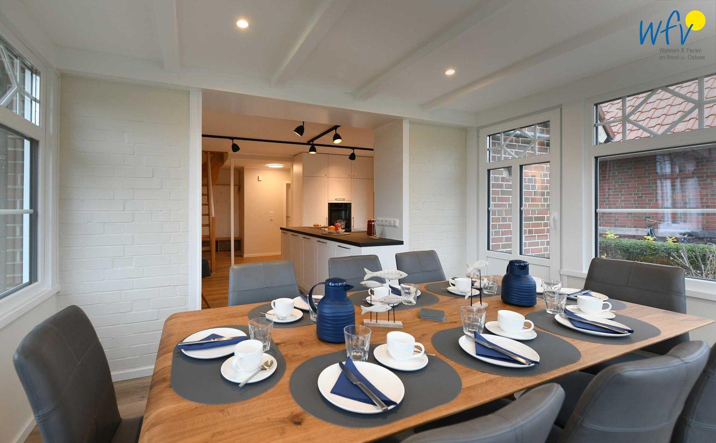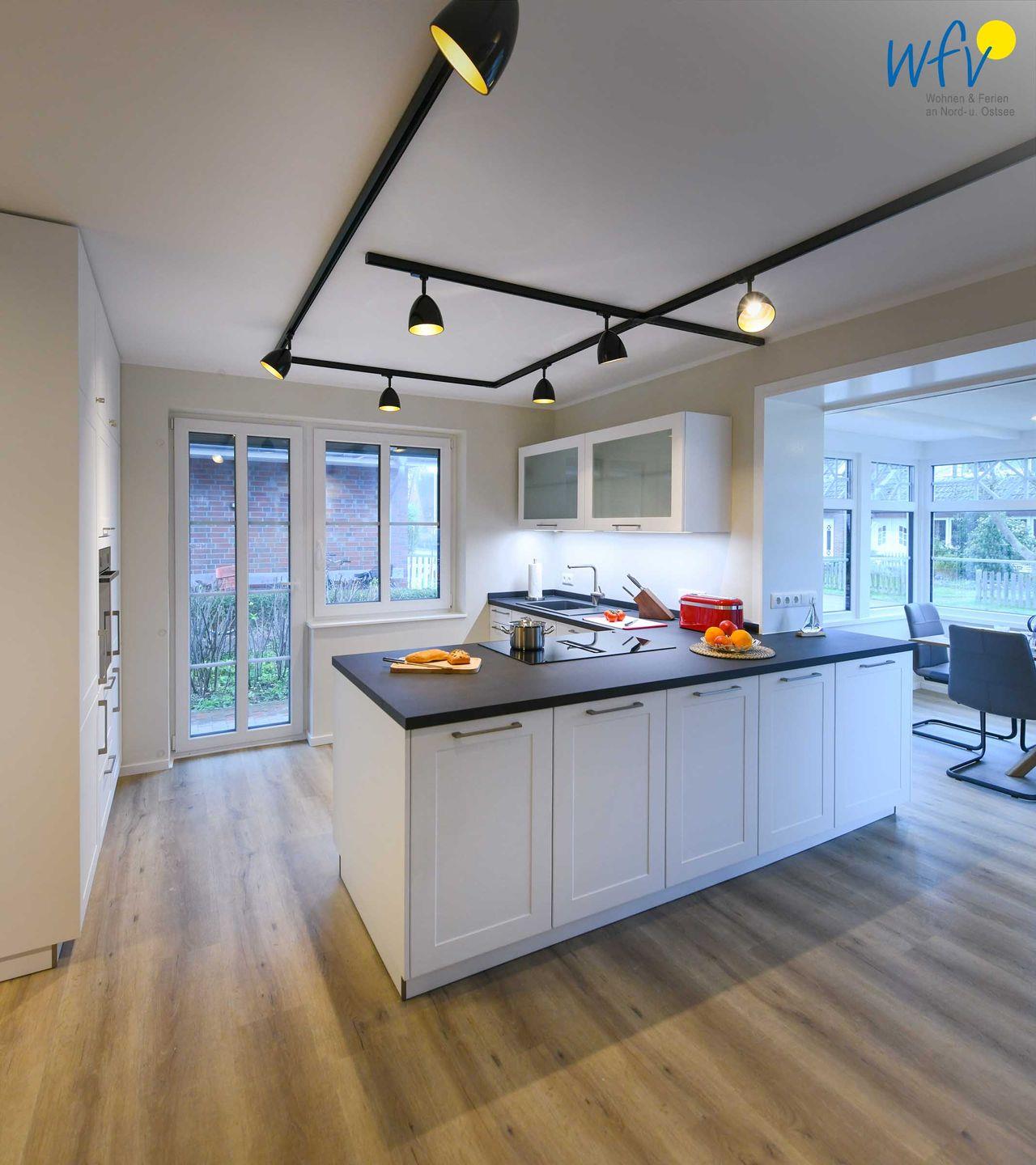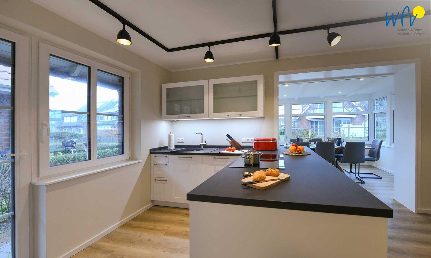 Im Erdgeschoss sind Wohnbereich und Küche harmonisch miteinander verbunden und eine breite Fensterfront mit schönem Lichteinfall sorgt für ein weites Raumgefühl. Hier können Sie nach dem Strandtag oder der Fahrradtour gemütliche Stunden auf dem bequemen Sofa verbringen, fernsehen, lesen oder Musik hören. Für das gemeinsame Ferienfrühstück oder gesellige Kochabende ist die moderne Küche wie Zuhause komplett und praktisch eingerichtet - u.a. mit einem 4-Platten-Induktionsherd, einem Backofen, einem Kühlschrank mit Gefrierfach sowie einer Spülmaschine. Die angrenzende Veranda (Wintergarten) mit wunderschönem seitlichen Blick in die Salzwiesen, lädt zu gemeinsamen Mahlzeiten ein.