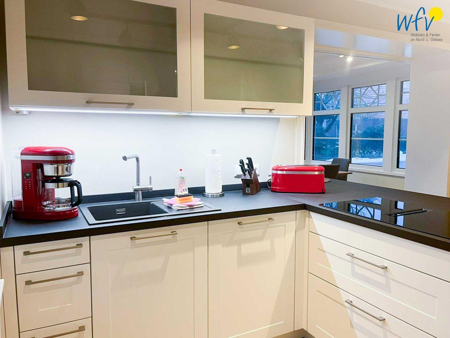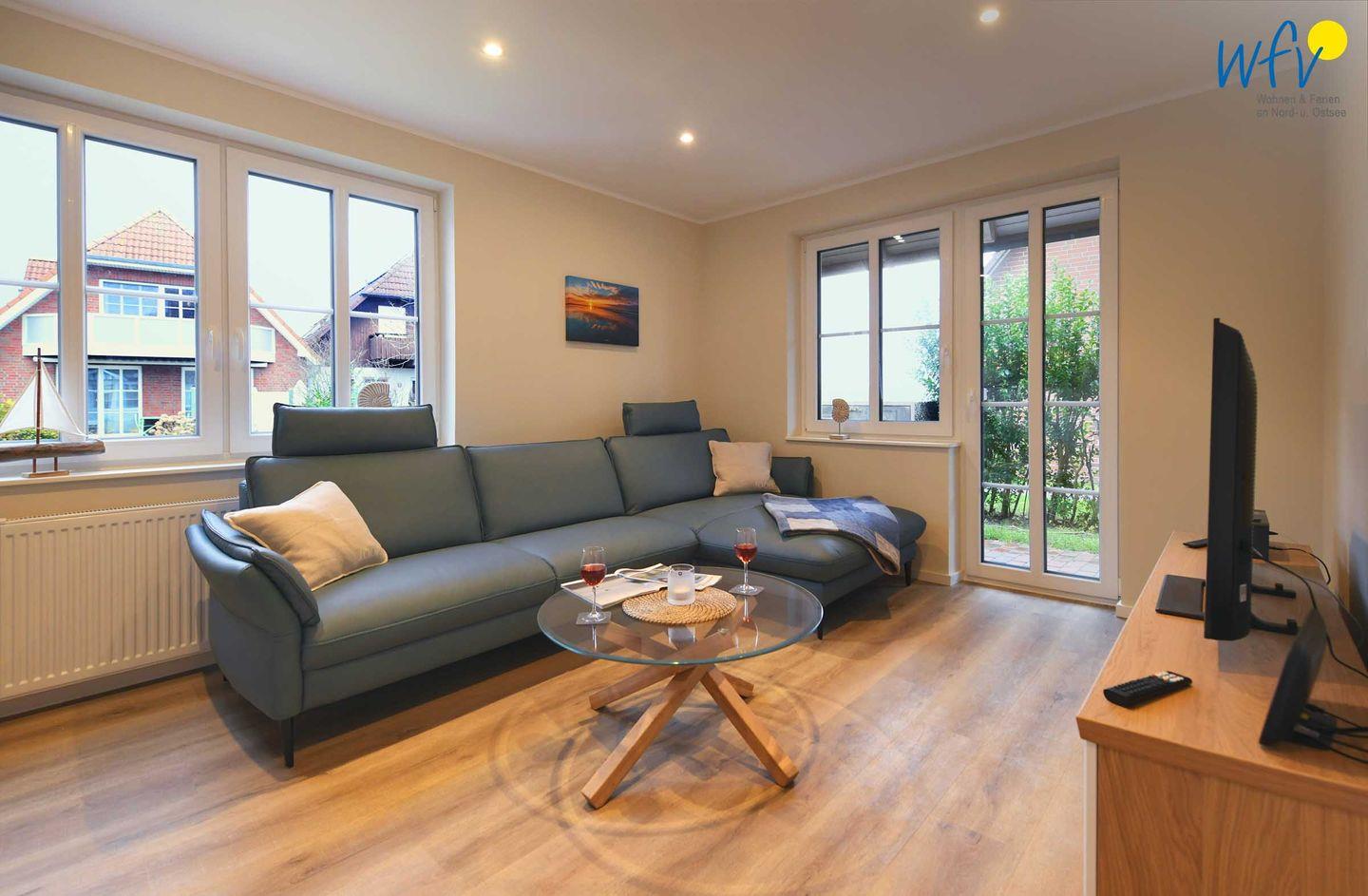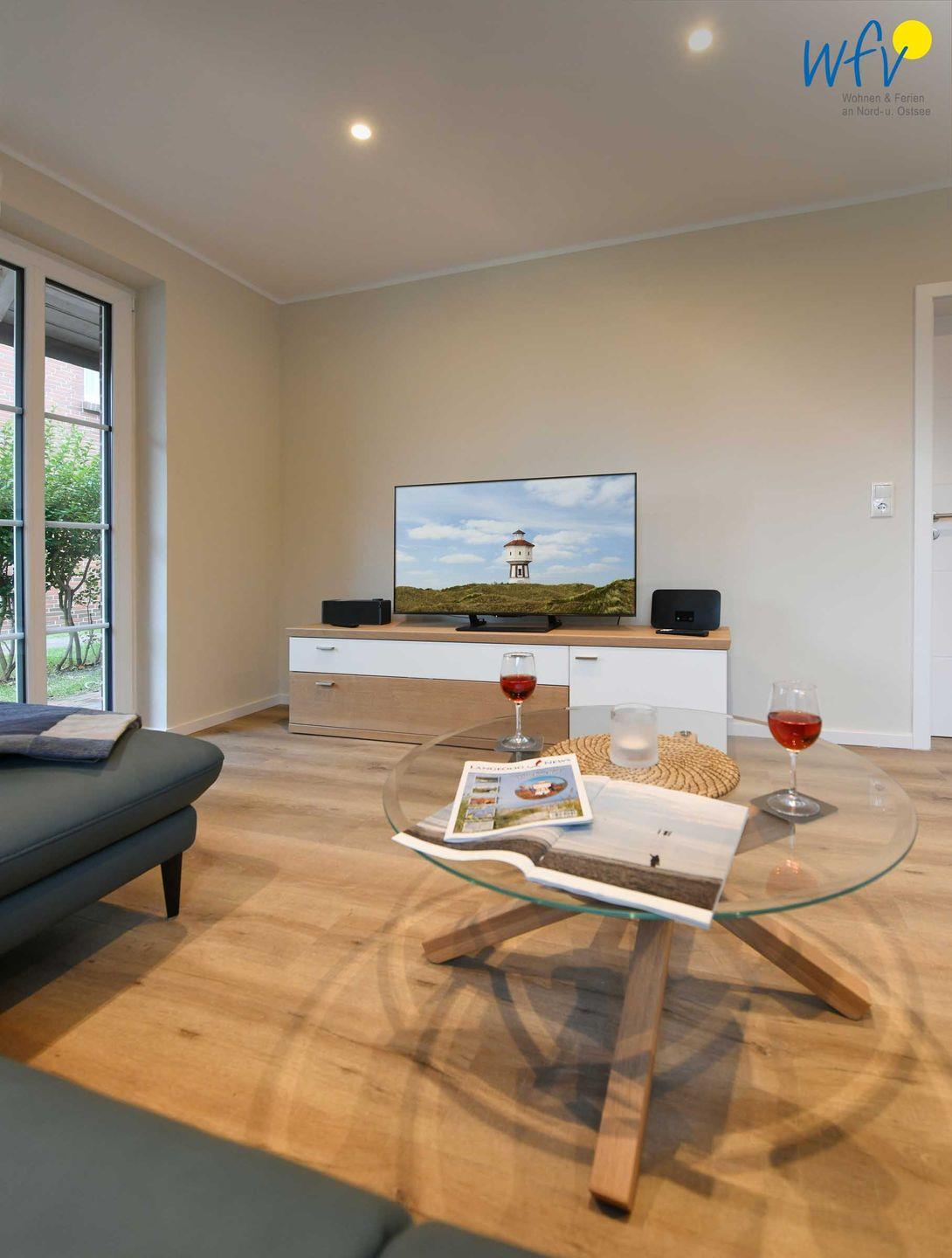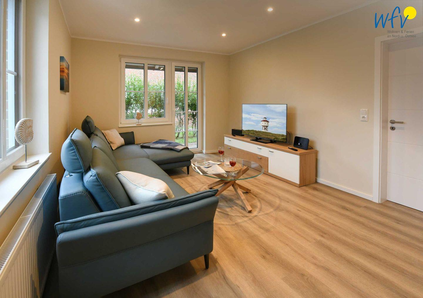 Im Erdgeschoss sind Wohnbereich und Küche harmonisch miteinander verbunden und eine breite Fensterfront mit schönem Lichteinfall sorgt für ein weites Raumgefühl. Hier können Sie nach dem Strandtag oder der Fahrradtour gemütliche Stunden auf dem bequemen Sofa verbringen, fernsehen, lesen oder Musik hören. Für das gemeinsame Ferienfrühstück oder gesellige Kochabende ist die moderne Küche wie Zuhause komplett und praktisch eingerichtet - u.a. mit einem 4-Platten-Induktionsherd, einem Backofen, einem Kühlschrank mit Gefrierfach sowie einer Spülmaschine. Die angrenzende Veranda (Wintergarten) mit wunderschönem seitlichen Blick in die Salzwiesen, lädt zu gemeinsamen Mahlzeiten ein.