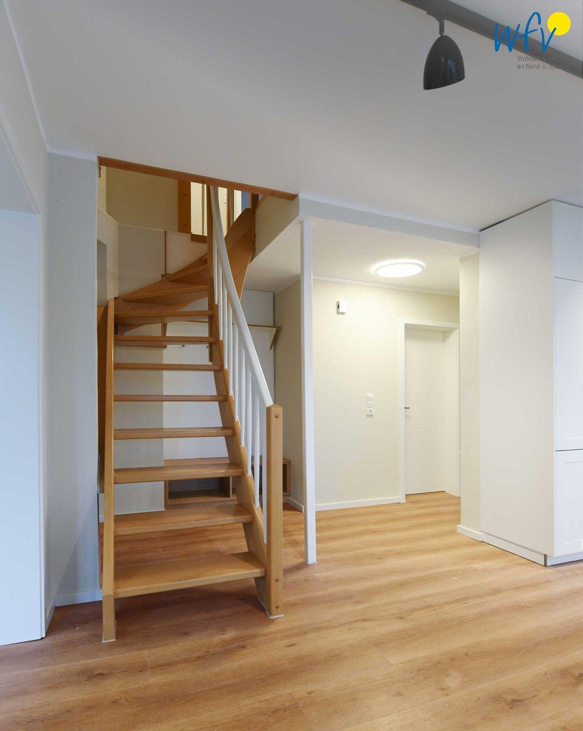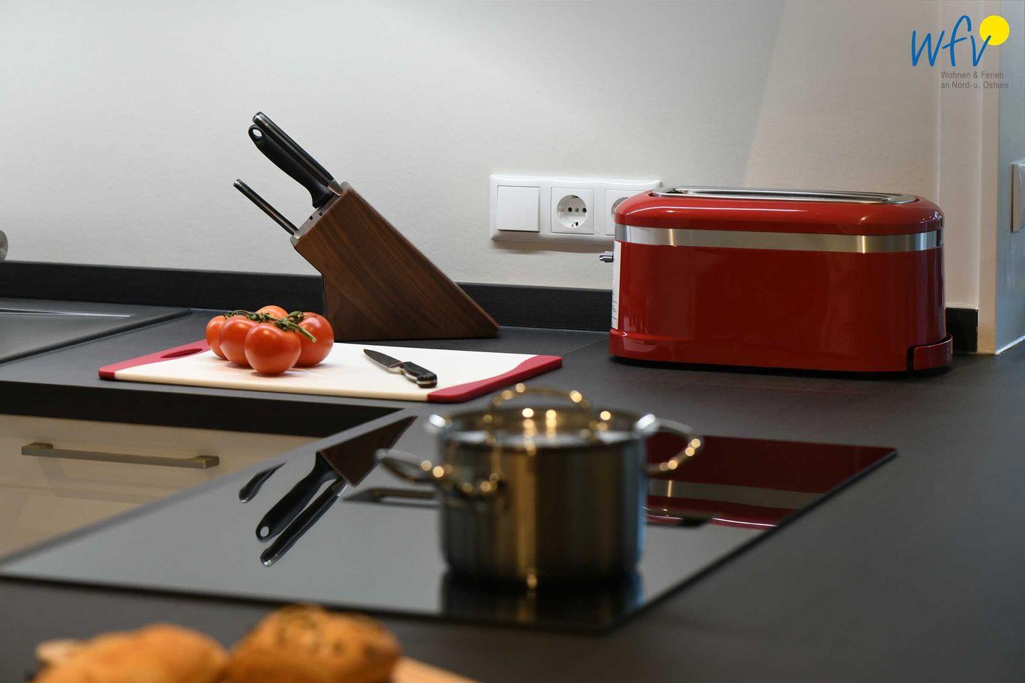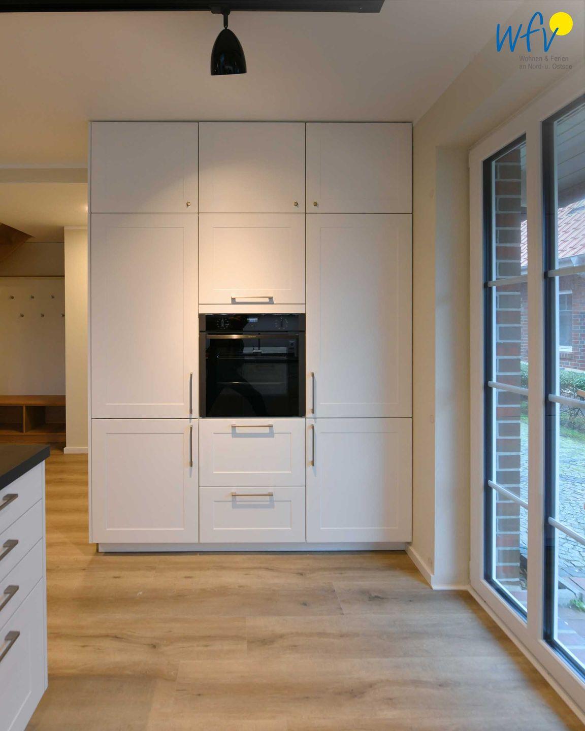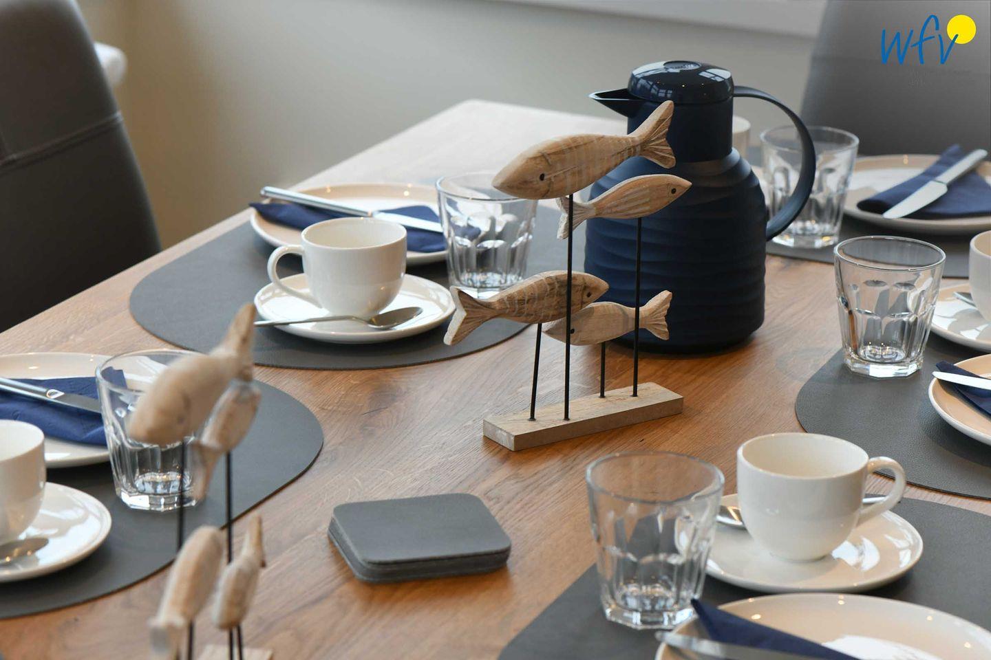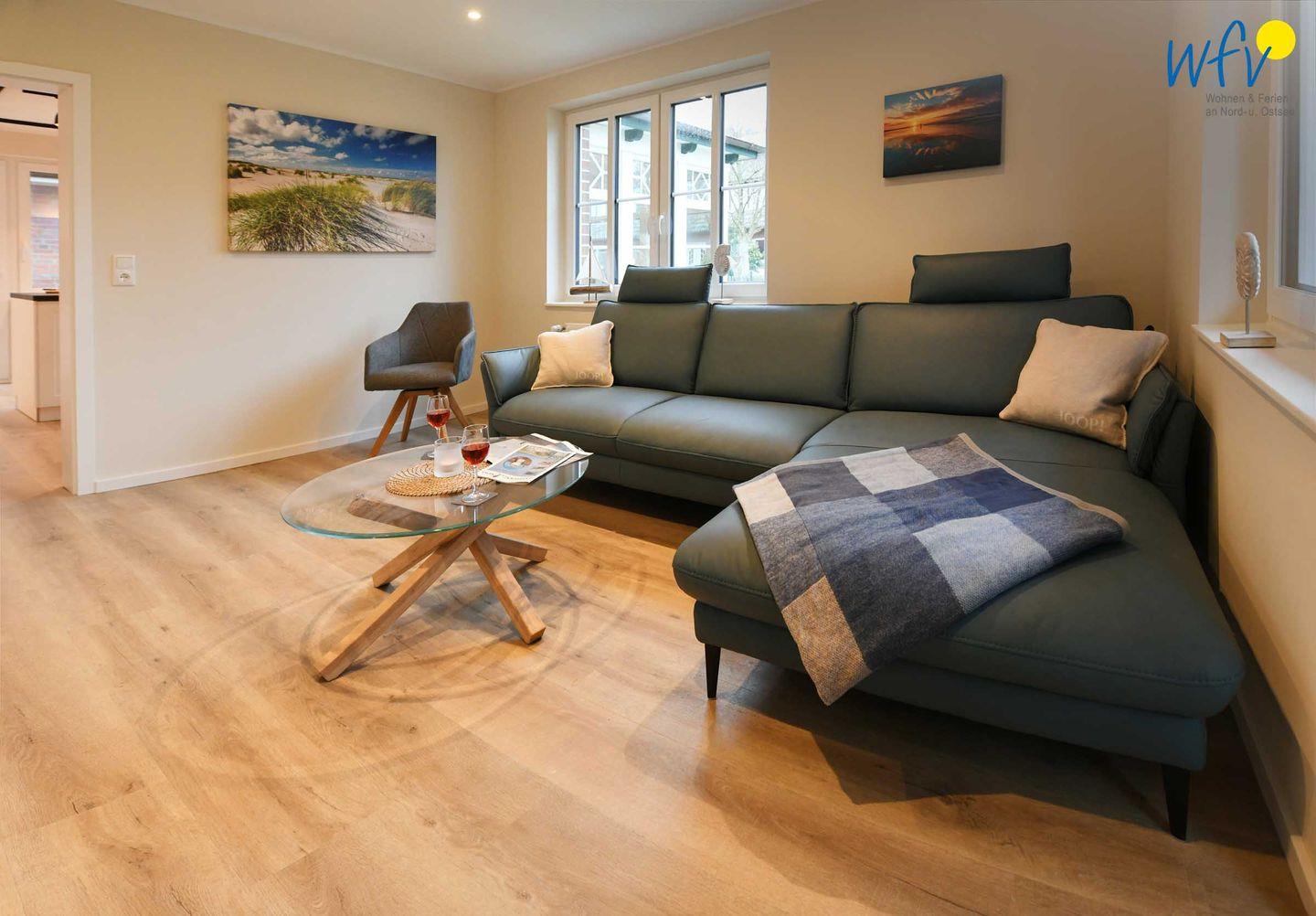 Im Erdgeschoss sind Wohnbereich und Küche harmonisch miteinander verbunden und eine breite Fensterfront mit schönem Lichteinfall sorgt für ein weites Raumgefühl. Hier können Sie nach dem Strandtag oder der Fahrradtour gemütliche Stunden auf dem bequemen Sofa verbringen, fernsehen, lesen oder Musik hören. Für das gemeinsame Ferienfrühstück oder gesellige Kochabende ist die moderne Küche wie Zuhause komplett und praktisch eingerichtet - u.a. mit einem 4-Platten-Induktionsherd, einem Backofen, einem Kühlschrank mit Gefrierfach sowie einer Spülmaschine. Die angrenzende Veranda (Wintergarten) mit wunderschönem seitlichen Blick in die Salzwiesen, lädt zu gemeinsamen Mahlzeiten ein.