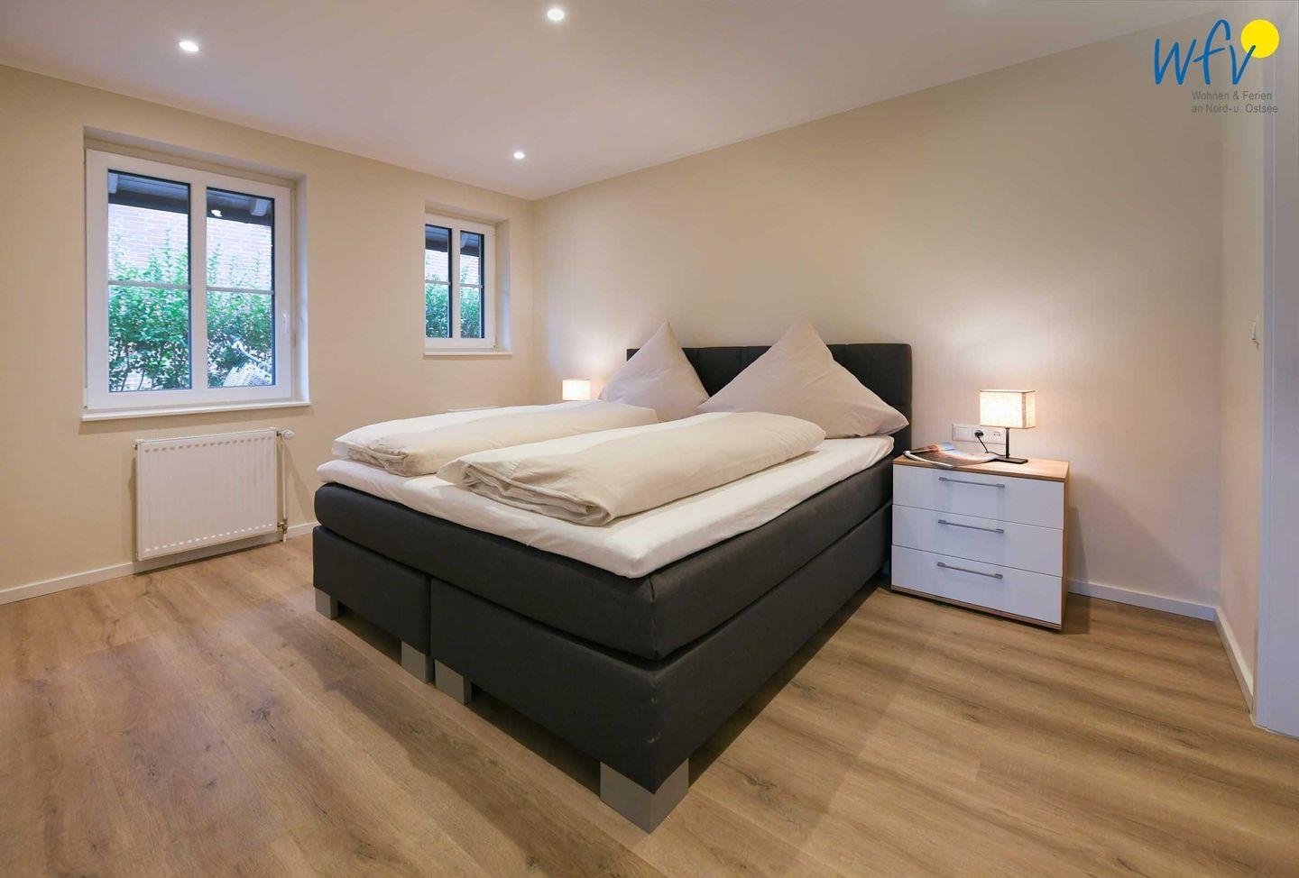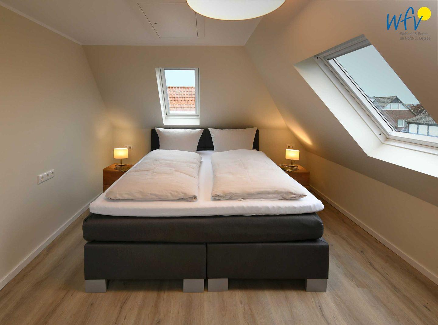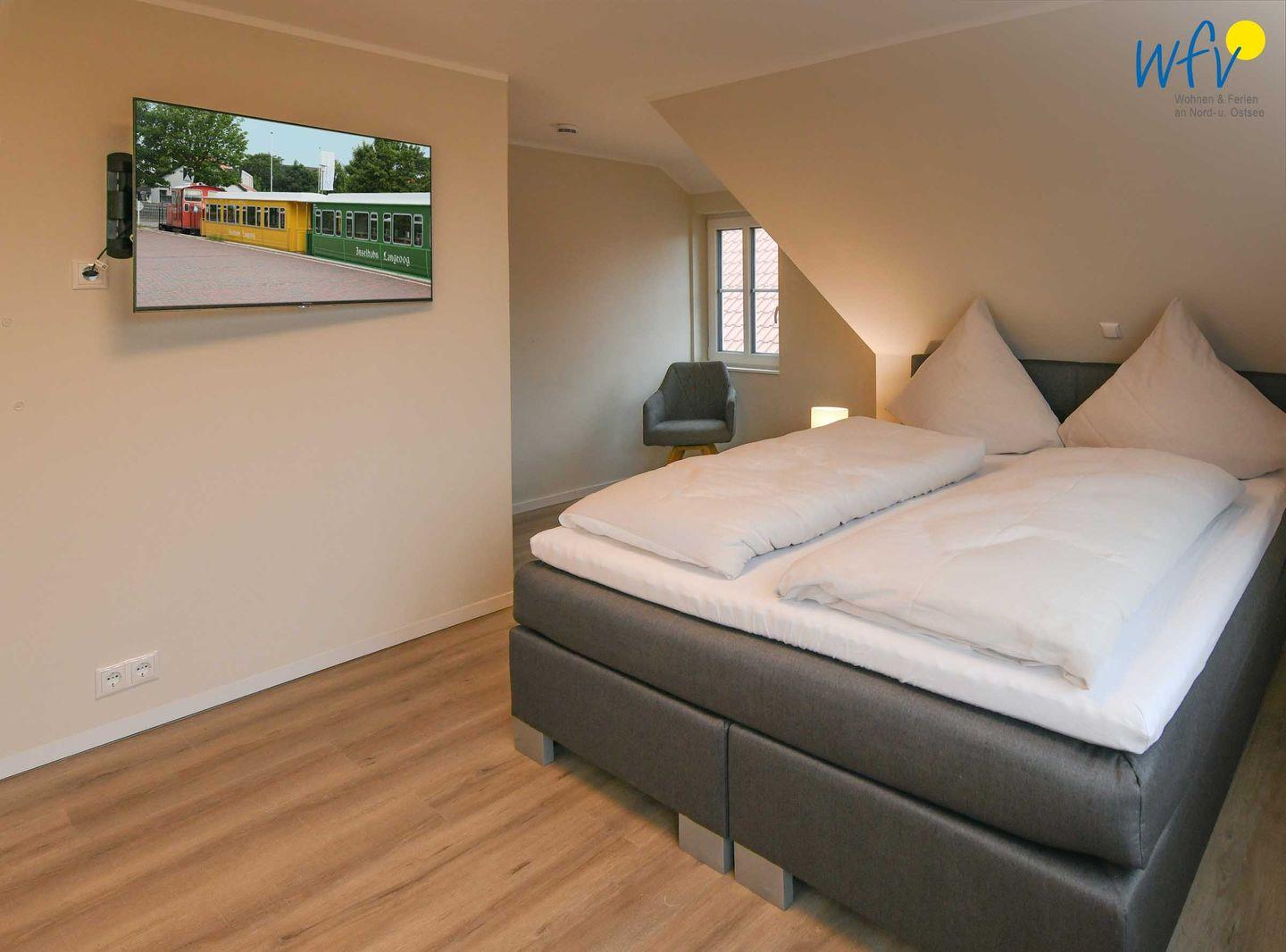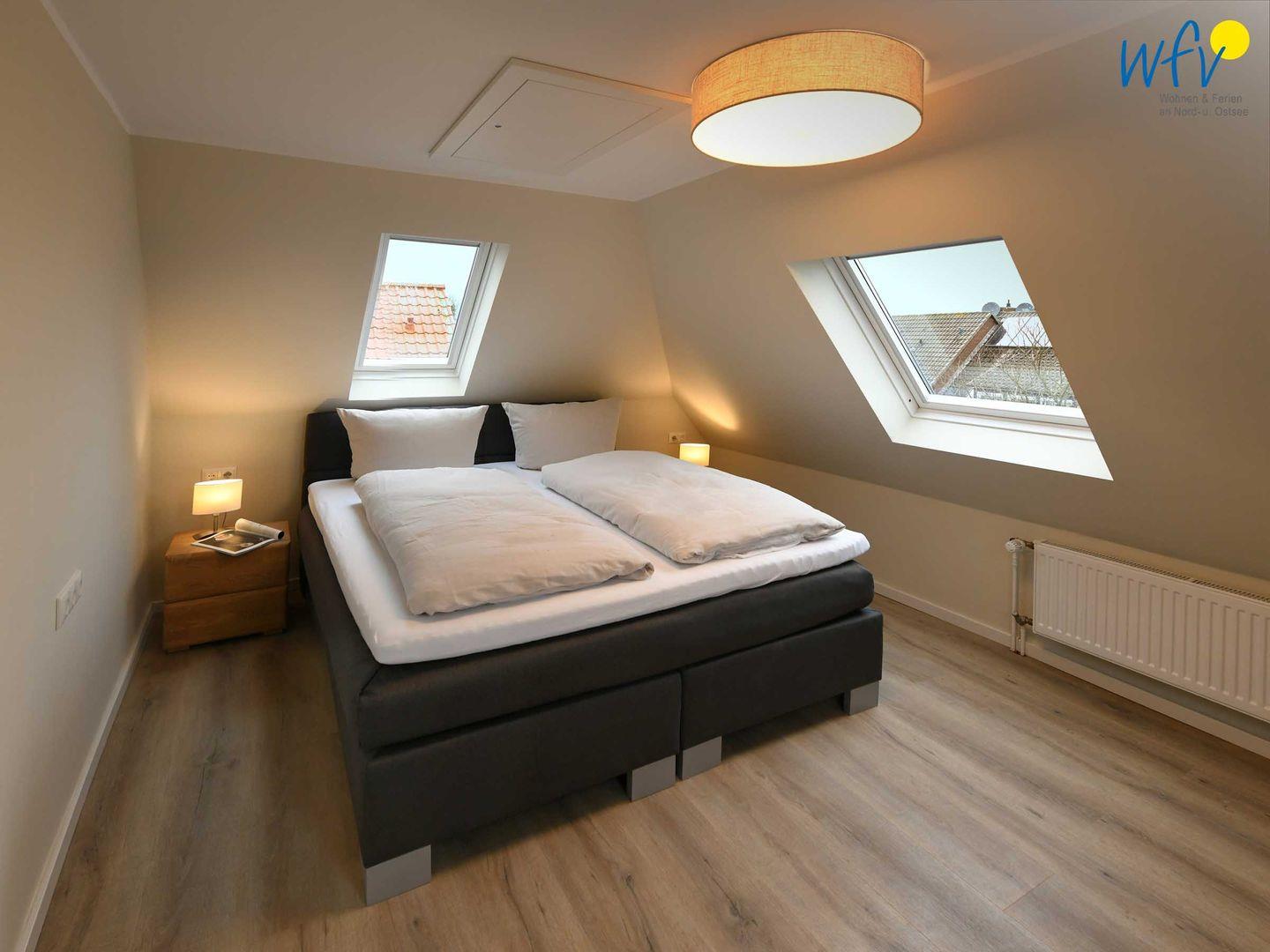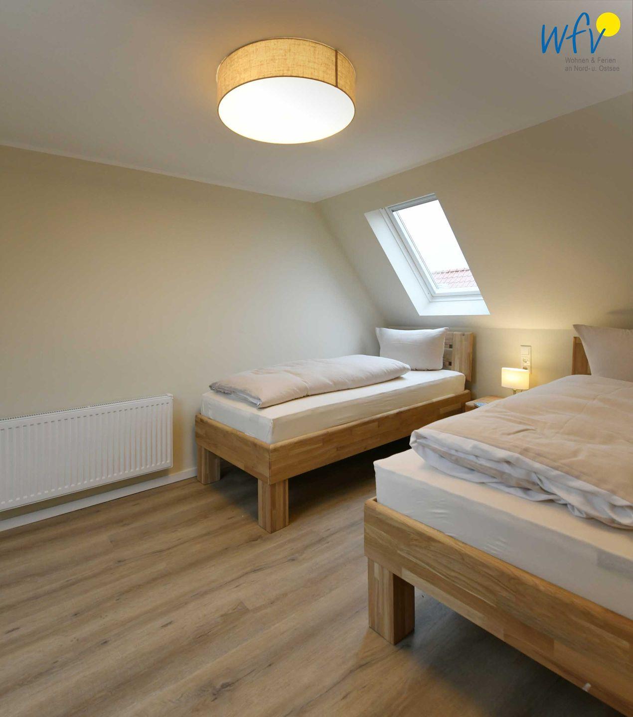 Vier separate Schlafzimmer (EG, OG, DG) bieten Ihnen bei einem Aufenthalt mit mehreren Personen sowohl Komfort, als auch Privatsphäre. Die beiden Schlafzimmer im EG + OG sowie ein Schlafzimmer im DG sind jeweils mit einem komfortablen Doppelbett ausgestattet (180 x 200 cm), das vierte Schlafzimmer (DG) mit zwei Einzelbetten (je 90 x 200 cm). Die Betten in den beiden oberen Zimmern verfügen über Komforthöhe. Kleiderschränke bieten ausreichend Platz für Ihre Urlaubsgarderobe. In zwei Schlafzimmern können Sie gemütlich fernsehen.
