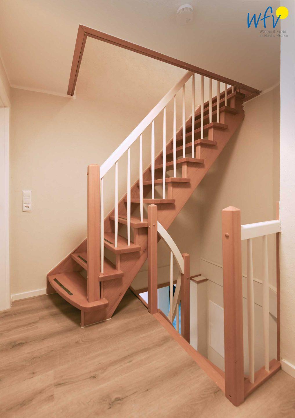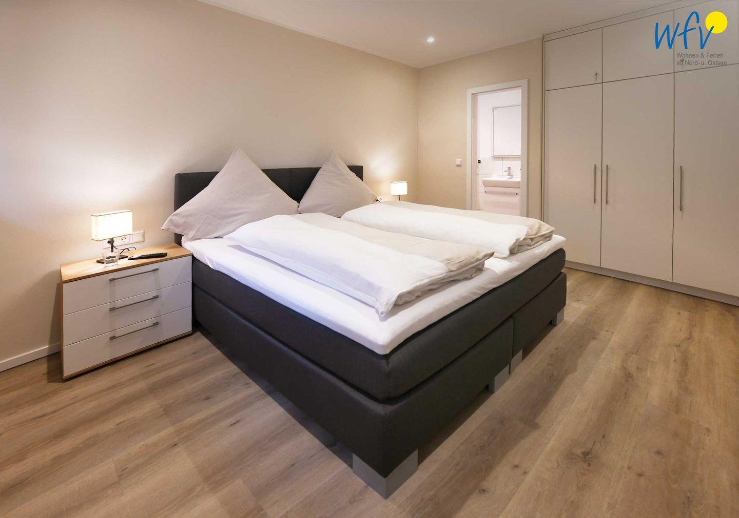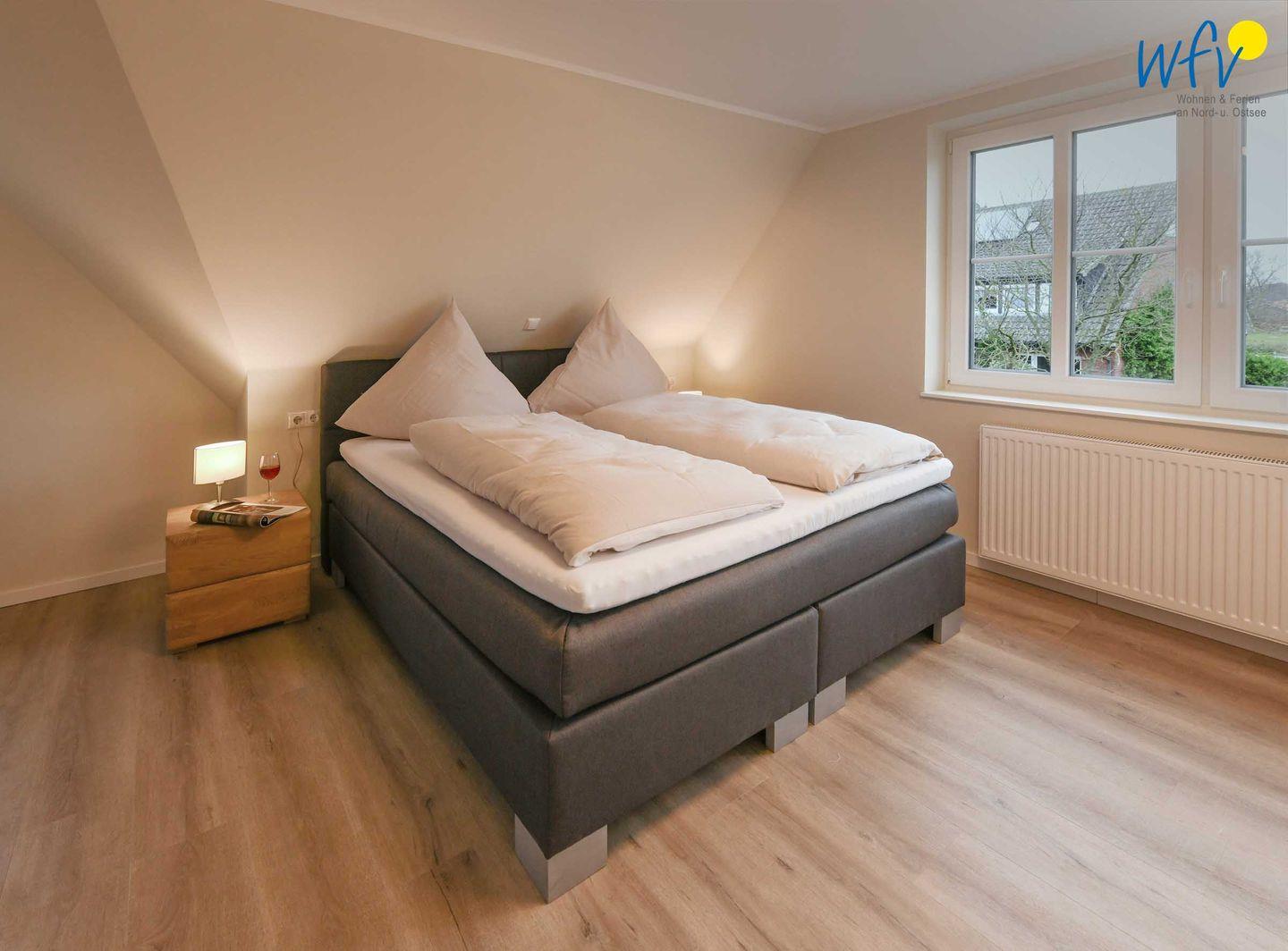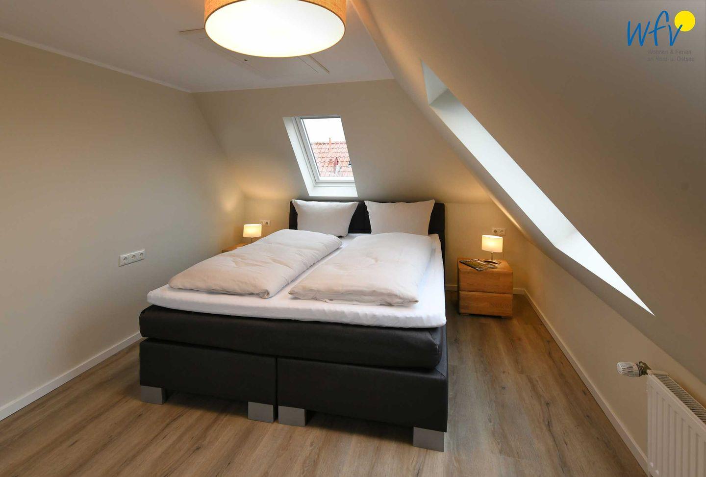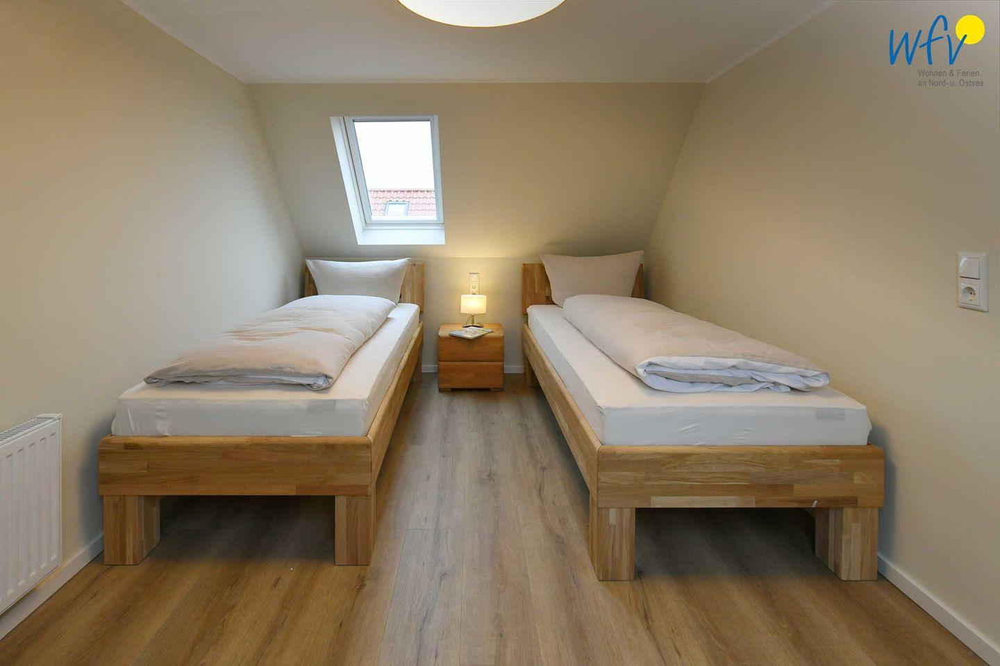 Vier separate Schlafzimmer (EG, OG, DG) bieten Ihnen bei einem Aufenthalt mit mehreren Personen sowohl Komfort, als auch Privatsphäre. Die beiden Schlafzimmer im EG + OG sowie ein Schlafzimmer im DG sind jeweils mit einem komfortablen Doppelbett ausgestattet (180 x 200 cm), das vierte Schlafzimmer (DG) mit zwei Einzelbetten (je 90 x 200 cm). Die Betten in den beiden oberen Zimmern verfügen über Komforthöhe. Kleiderschränke bieten ausreichend Platz für Ihre Urlaubsgarderobe. In zwei Schlafzimmern können Sie gemütlich fernsehen.