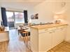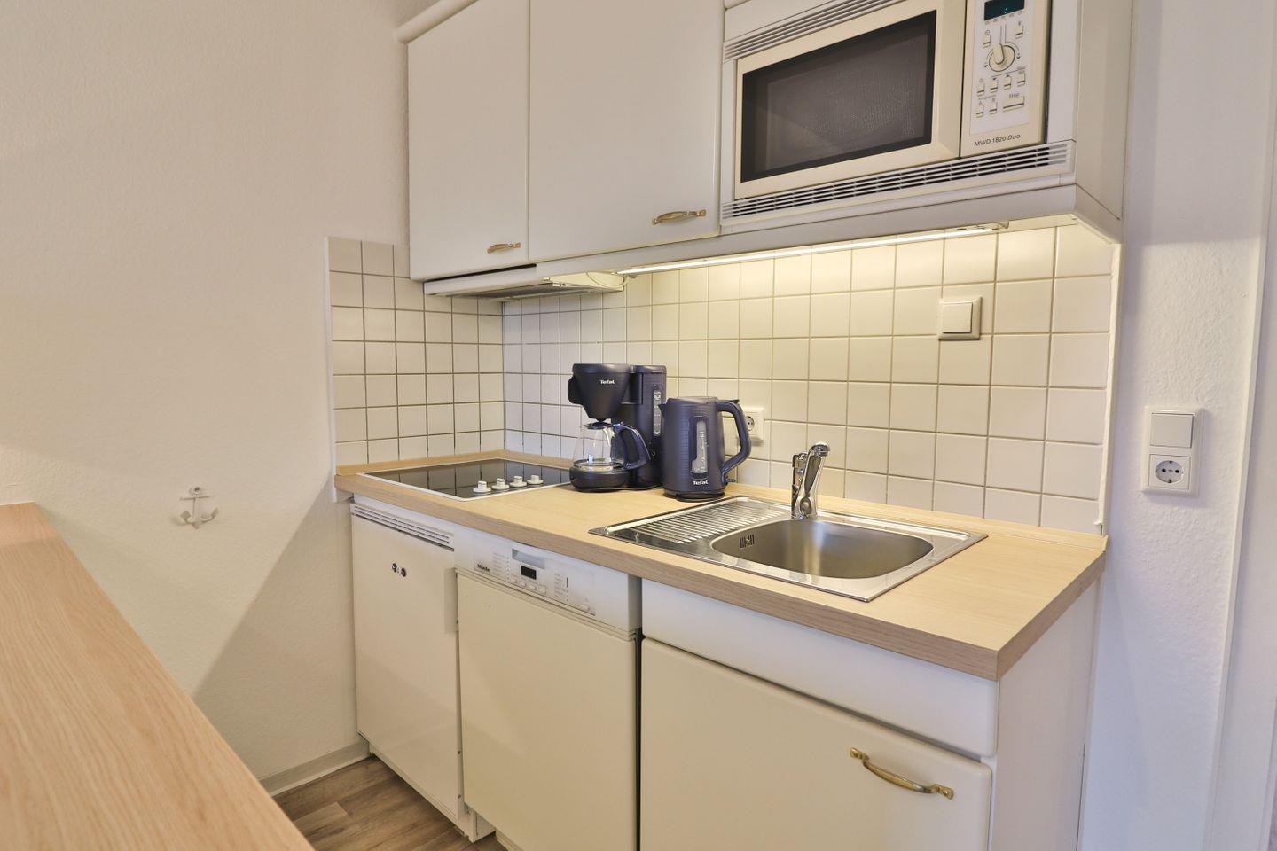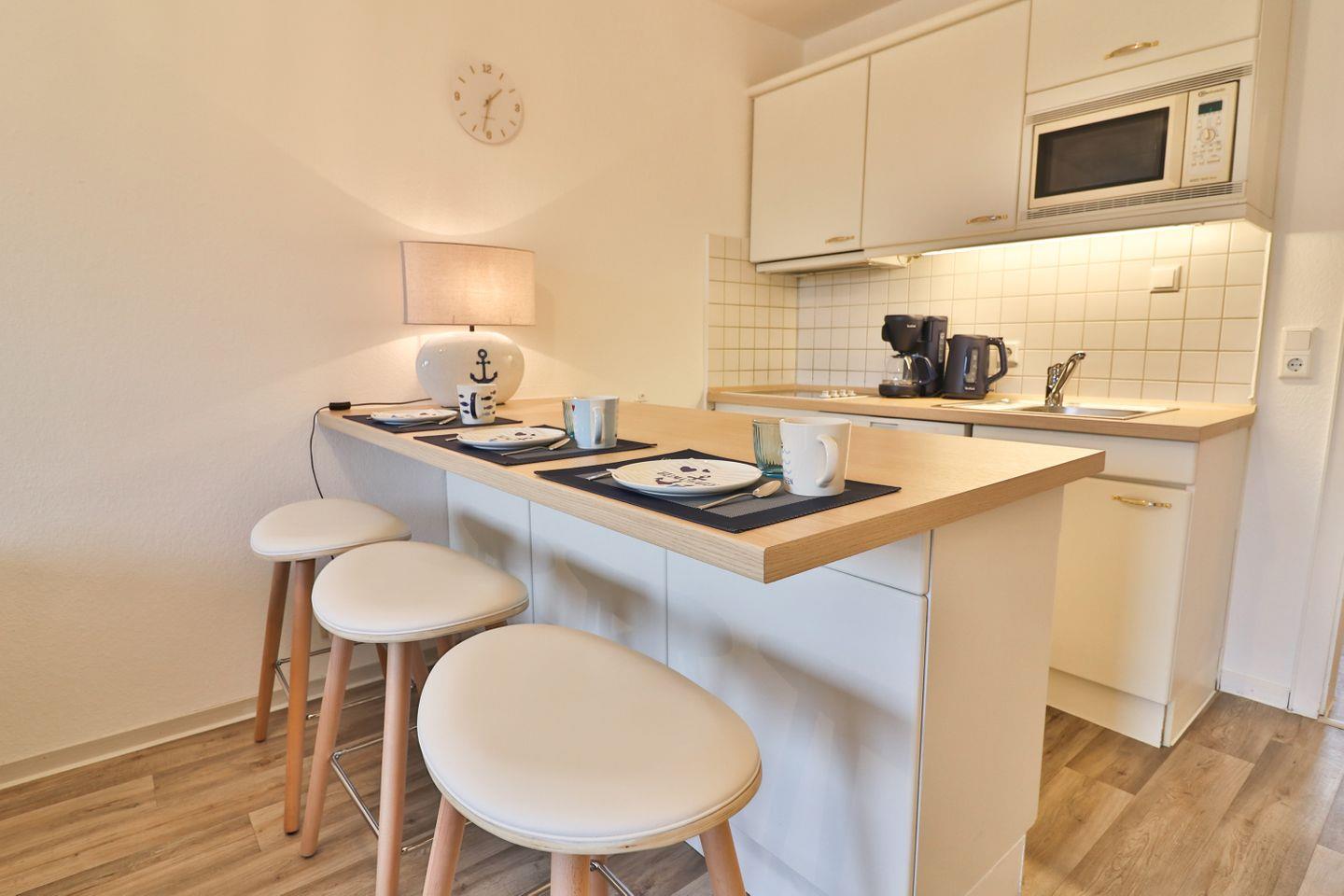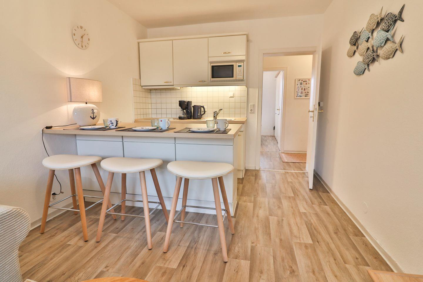 Der offene Wohnbereich lädt zum Verweilen ein. Hier erwarten Sie ein bequemes Sofa, ein Fernseher, sowie eine Auswahl an Büchern und Spielen für entspannte Stunden. Die moderne Küchenzeile lässt keine Wünsche offen: ein Herd mit 4-Platten-Kochfeld, Kühlschrank mit Gefrierfach, Spülmaschine, Mikrowelle, Kaffeemaschine, Wasserkocher und Toaster stehen für Sie bereit. Eine große, moderne Küchentheke verbindet Küche und Wohnbereich und schafft den idealen Rahmen für gesellige Abende.