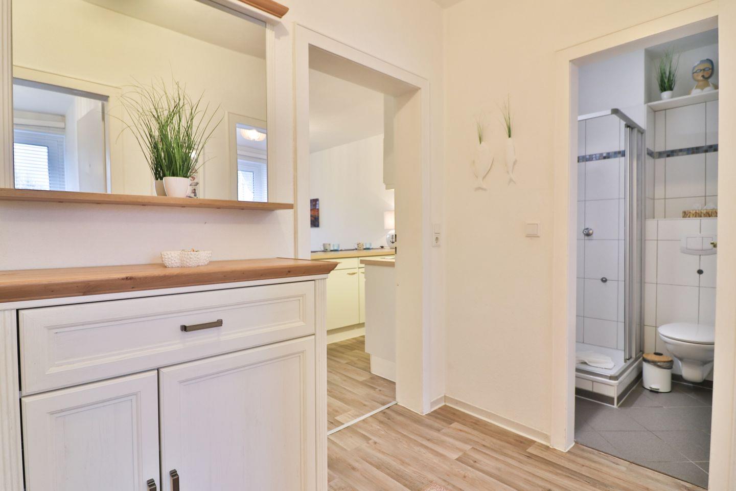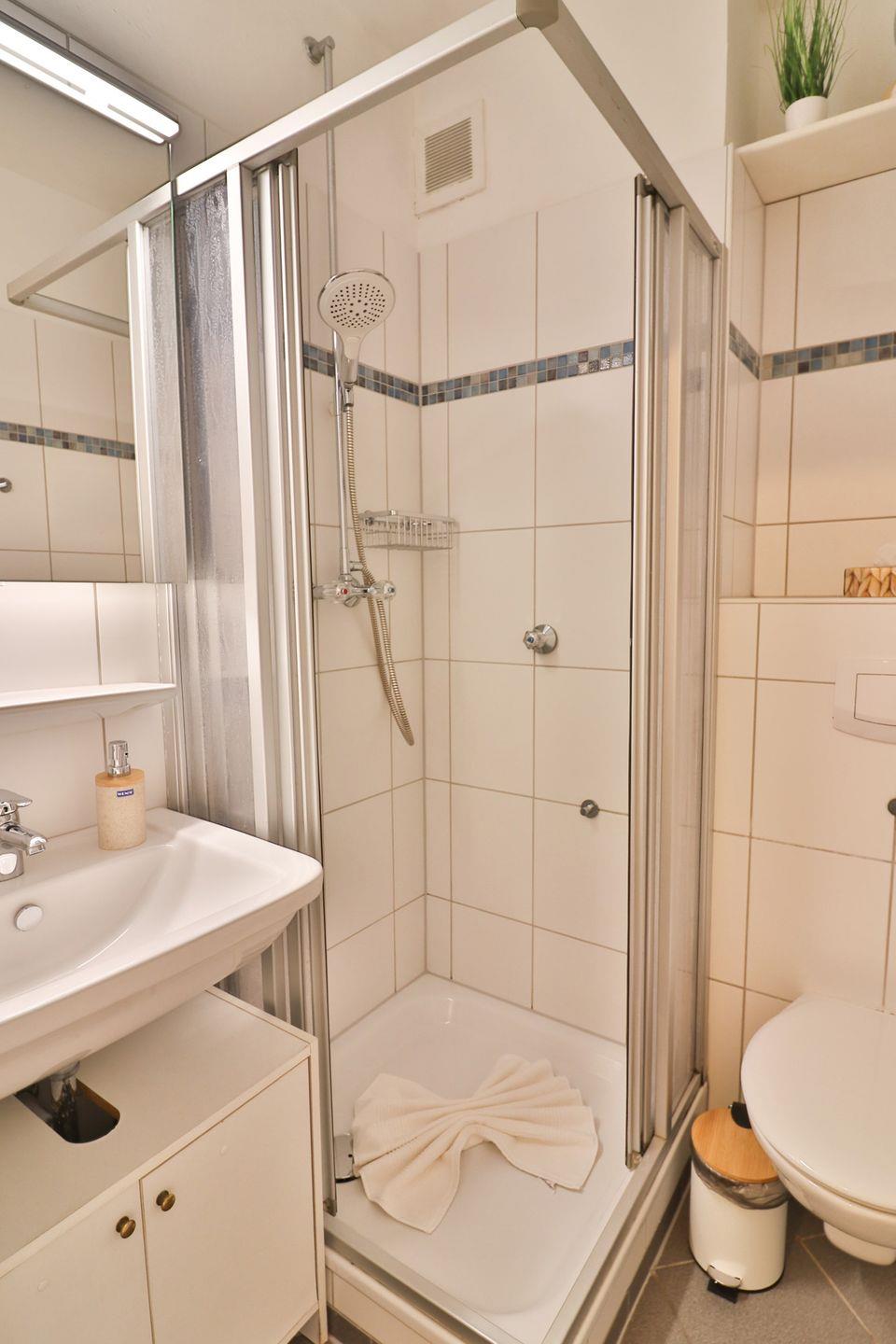 Das Badezimmer rundet den hohen Wohnkomfort der Ferienwohnung ab. Es ist mit einer Dusche, WC, Waschbecken und einer Handtuchheizung ausgestattet und bietet alles, was Sie für einen entspannten Start in den Tag oder eine erfrischende Dusche nach einem Urlaubstag benötigen.
