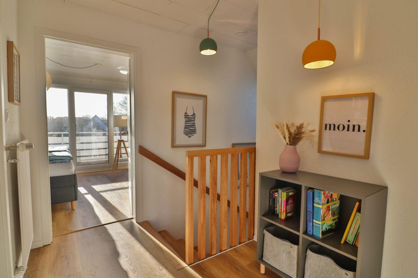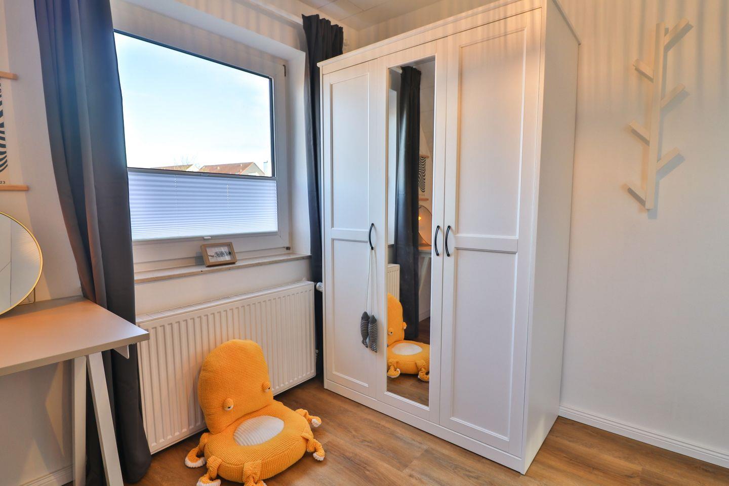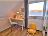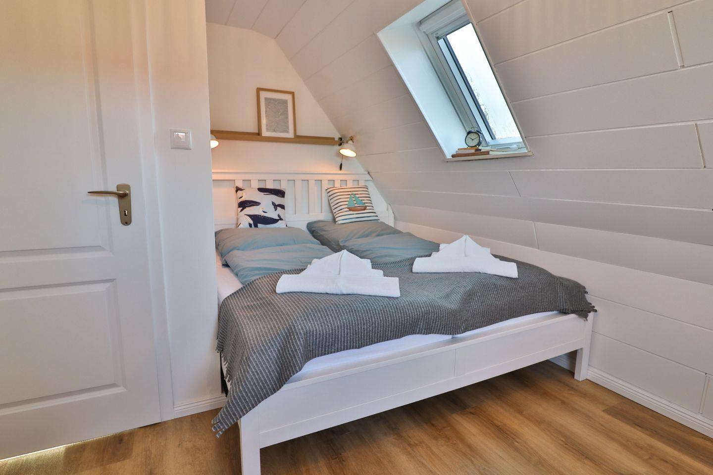 Mit insgesamt fünf Zimmern, darunter vier separate Schlafzimmer - je zwei Zimmer mit Doppelbetten (180 x 200 cm) und zwei mit Einzelbetten (je 90 x 200 cm), von denen sich eines der Schlafzimmer im Erdgeschoss befindet - bietet das Haus Meer reichlich Platz sowohl für erholsame Nächte als auch für ausreichend Privatsphäre und Gemütlichkeit für die einzelnen Gäste. Von einem der Doppelzimmer aus gelangen Sie auf den großen überdachten Balkon mit Blick in die Nachbarschaft.