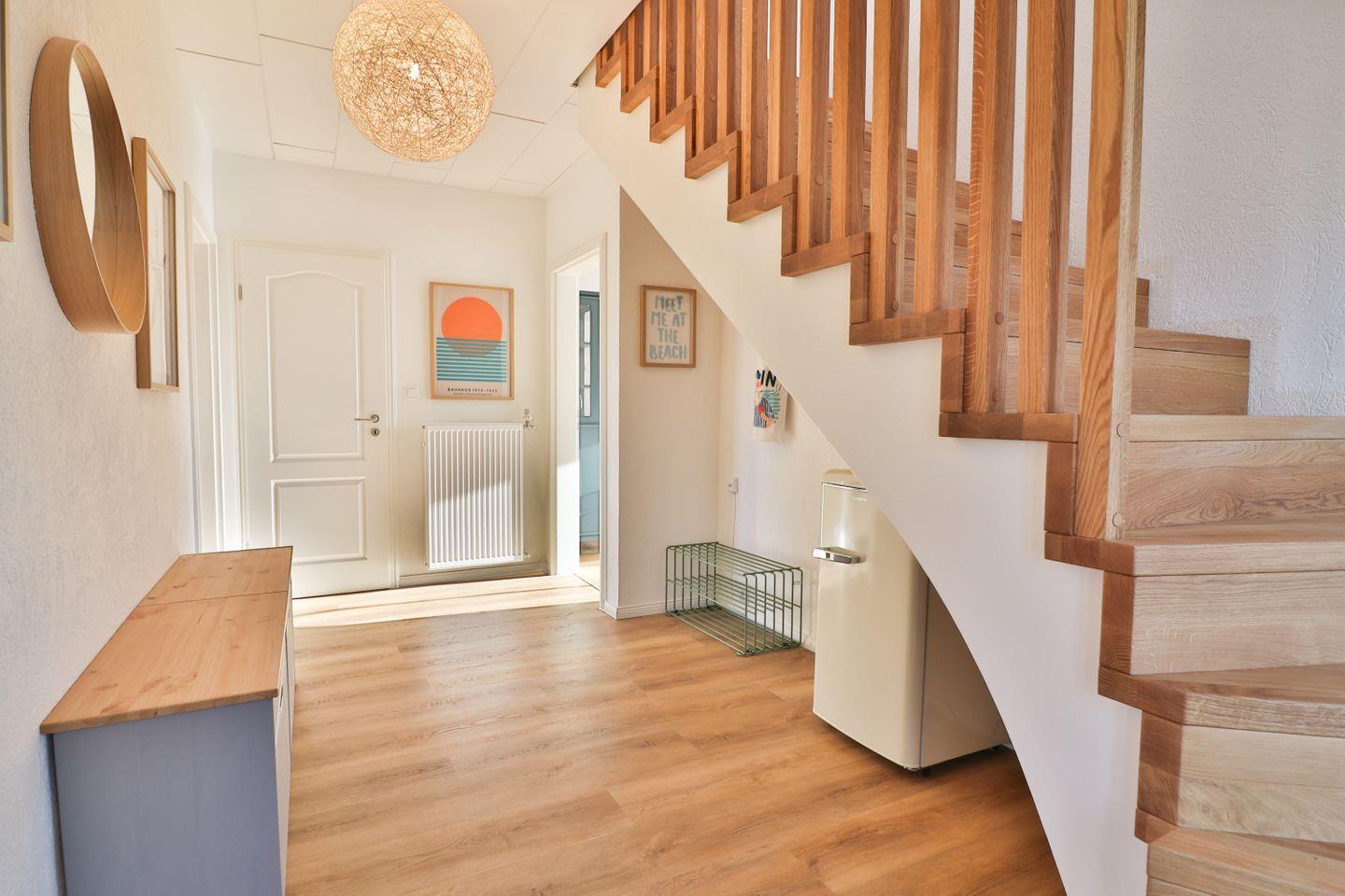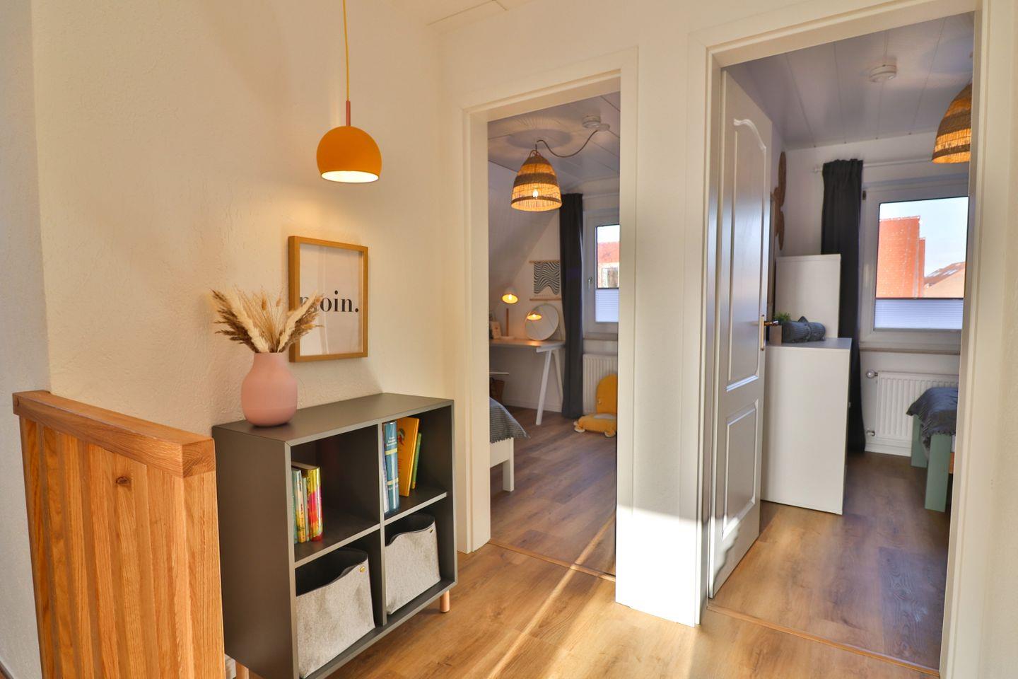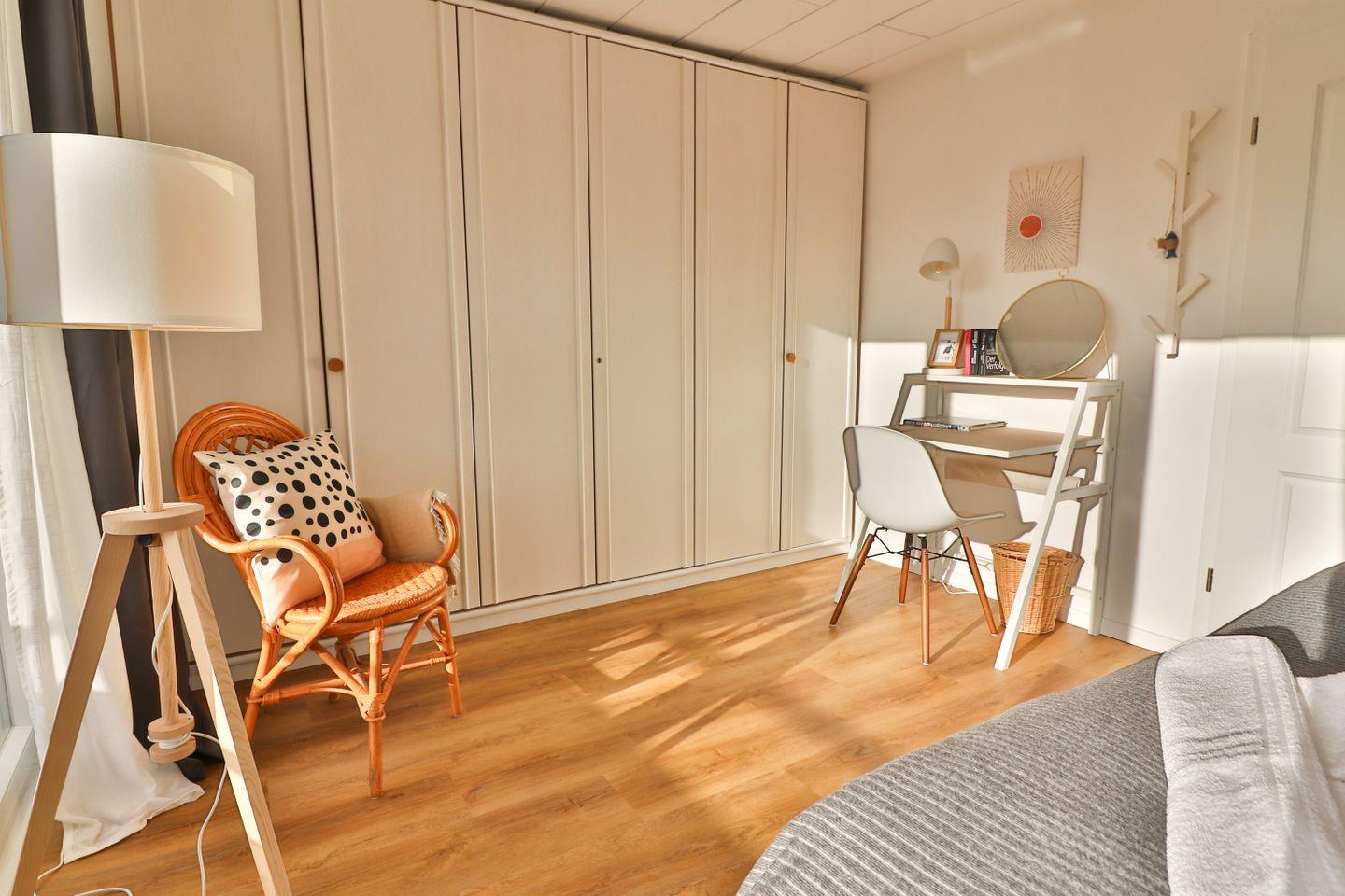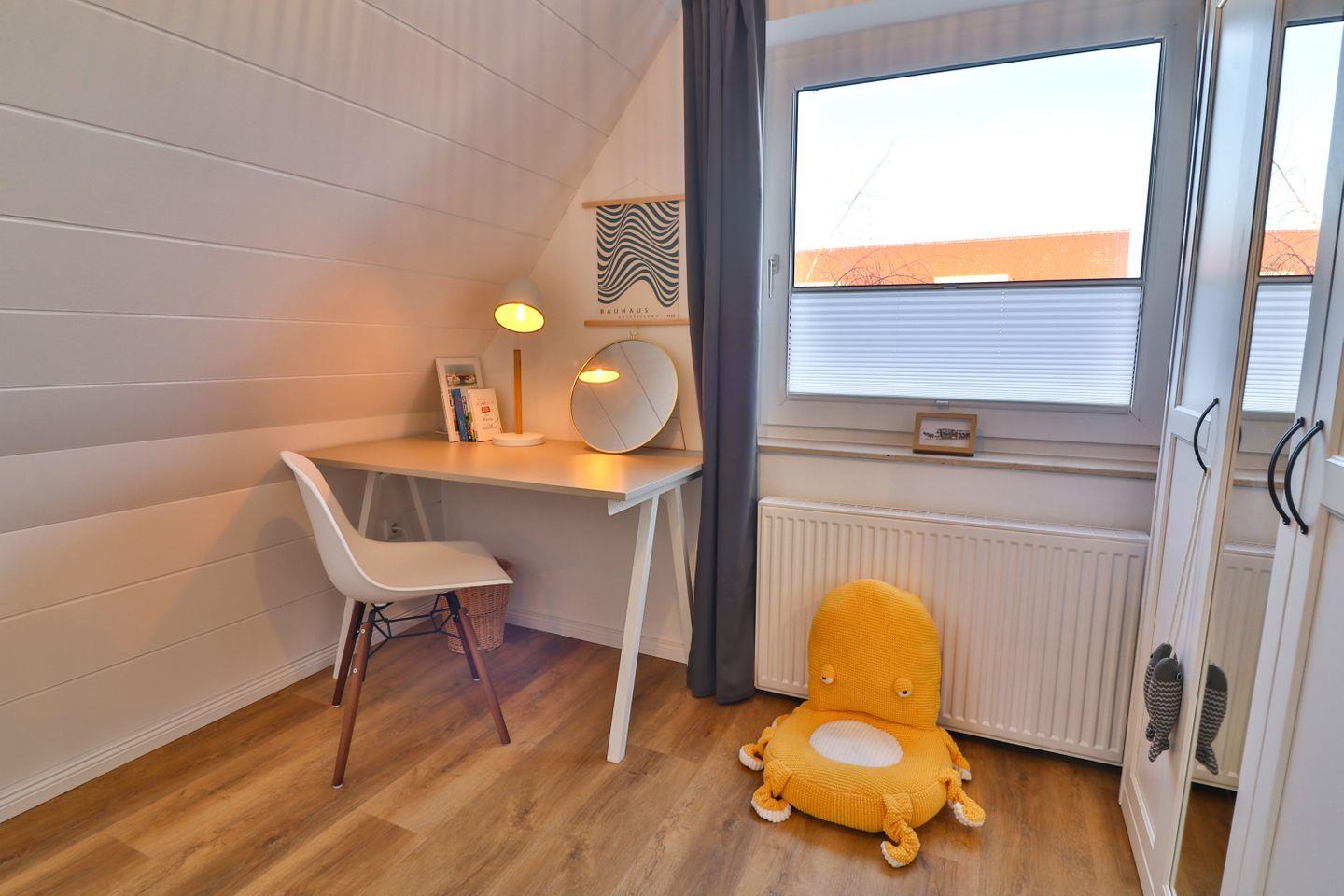 Mit insgesamt fünf Zimmern, darunter vier separate Schlafzimmer - je zwei Zimmer mit Doppelbetten (180 x 200 cm) und zwei mit Einzelbetten (je 90 x 200 cm), von denen sich eines der Schlafzimmer im Erdgeschoss befindet - bietet das Haus Meer reichlich Platz sowohl für erholsame Nächte als auch für ausreichend Privatsphäre und Gemütlichkeit für die einzelnen Gäste. Von einem der Doppelzimmer aus gelangen Sie auf den großen überdachten Balkon mit Blick in die Nachbarschaft.