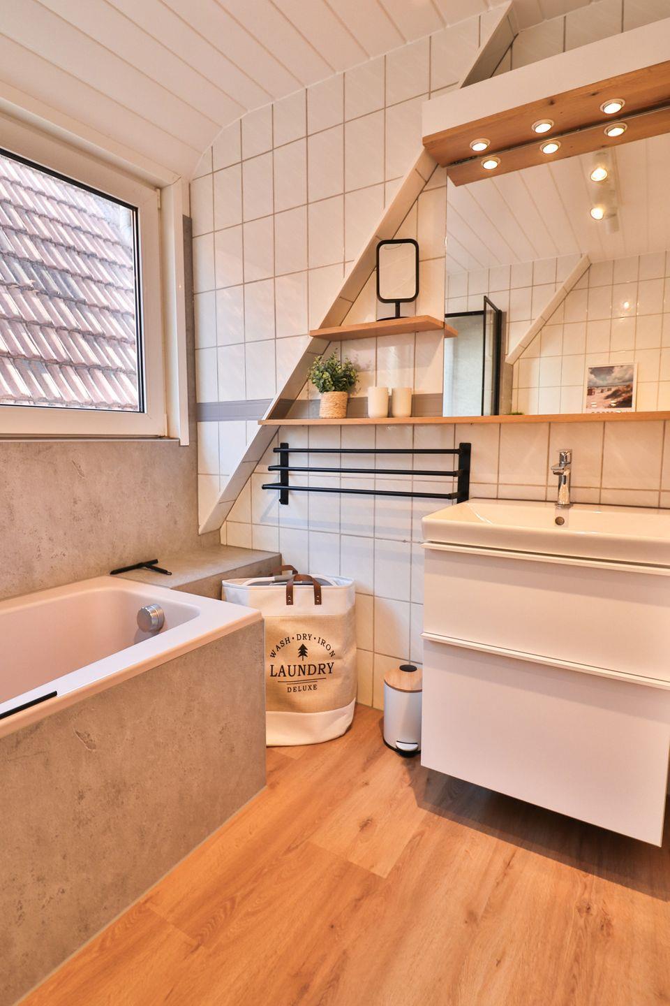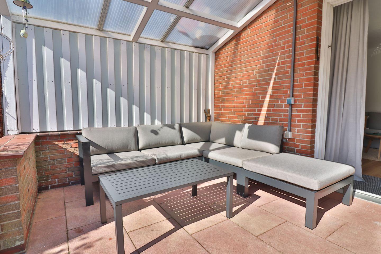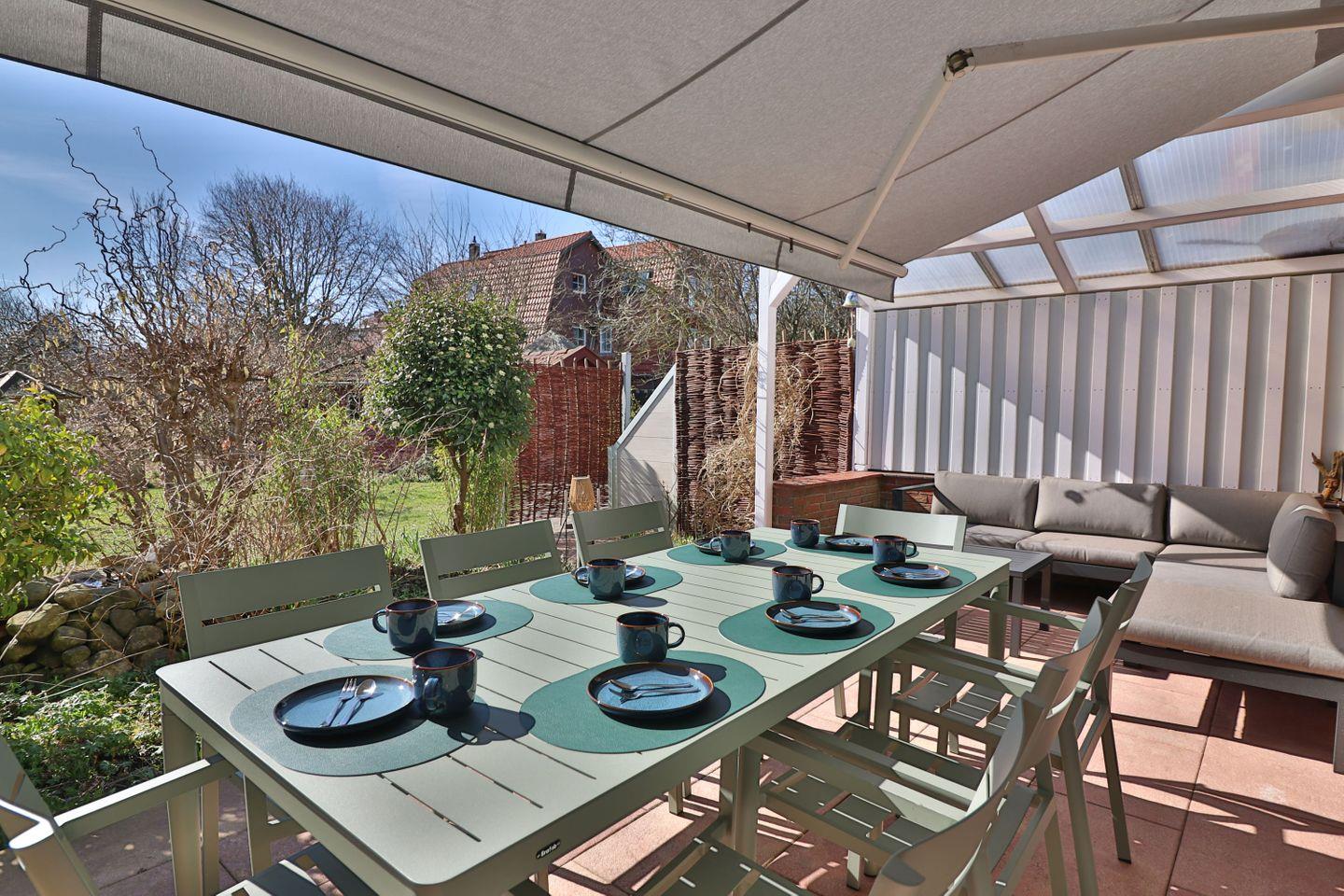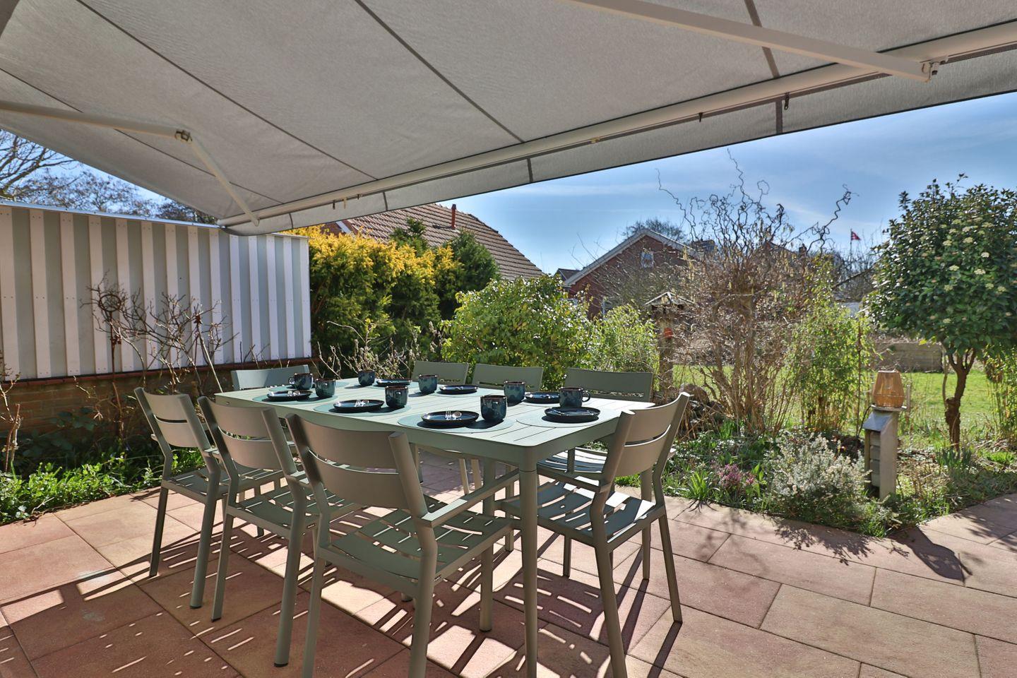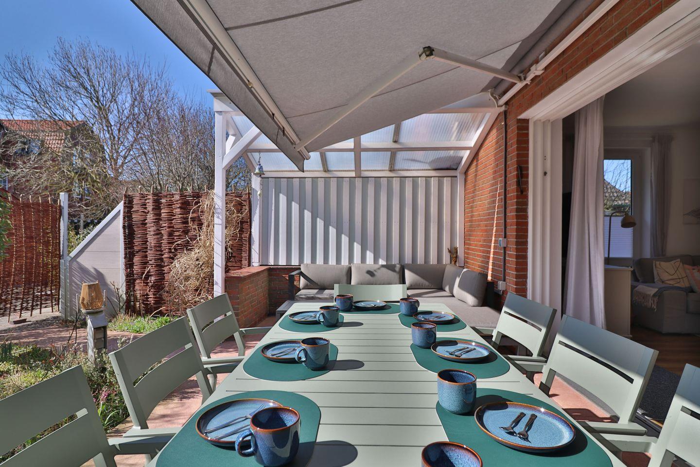Ein herausragendes Merkmal des Hauses ist die großzügige Außenanlage: Die überdachte Terrasse mit Windschutz lädt auch bei wechselhaftem Wetter zum Verweilen ein. Sonnenliegen, Gartenmöbel und eine Liegewiese bieten optimale Möglichkeiten zur Entspannung in den Sommermonaten. Der gepflegte Garten und ein zusätzlicher Balkon erweitern das Raumangebot im Freien und sorgen für flexible Nutzungsmöglichkeiten sowohl für Erwachsene als auch Kinder.