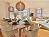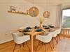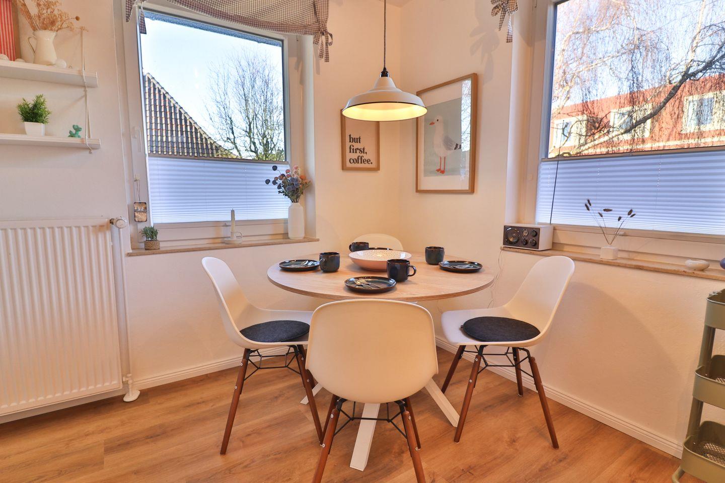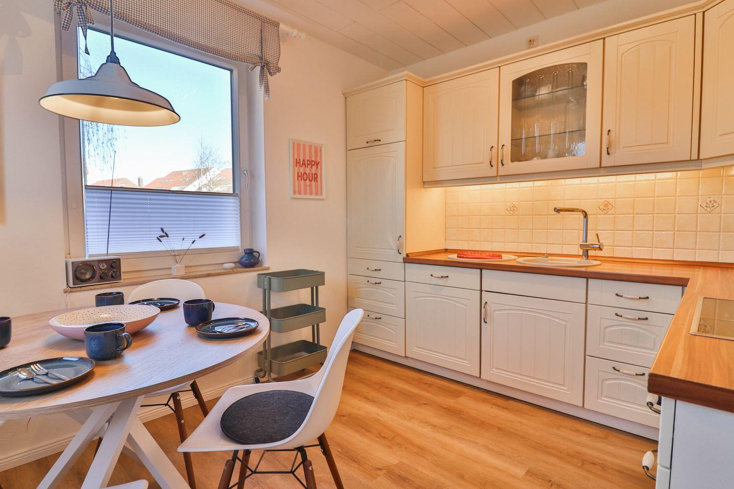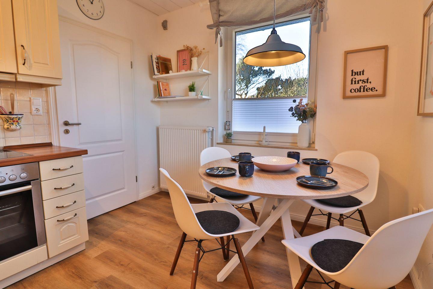 Die geschlossene Küche ist voll ausgestattet und bietet eine alternative Essmöglichkeit für vier Personen am runden Esstisch. Moderne Geräte wie Ceranherd, Backofen, Mikrowelle, Spülmaschine, Kaffeemaschine, Toaster, Wasserkocher, Kühlschrank und Gefrierschrank sowie eine umfassende Auswahl an Küchenutensilien lassen keine Wünsche offen.