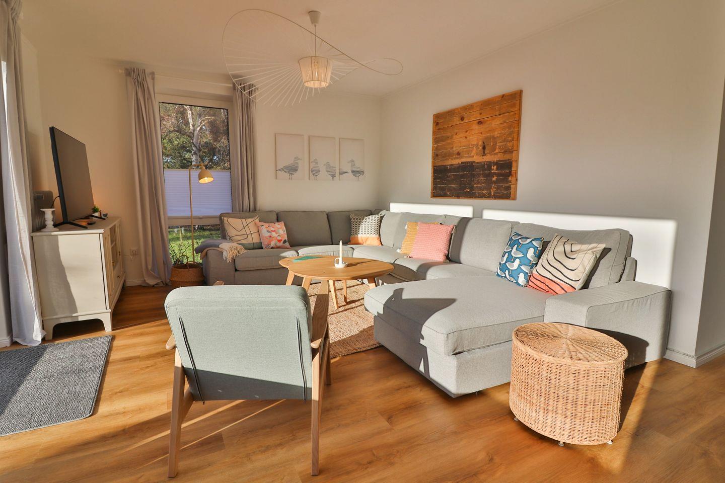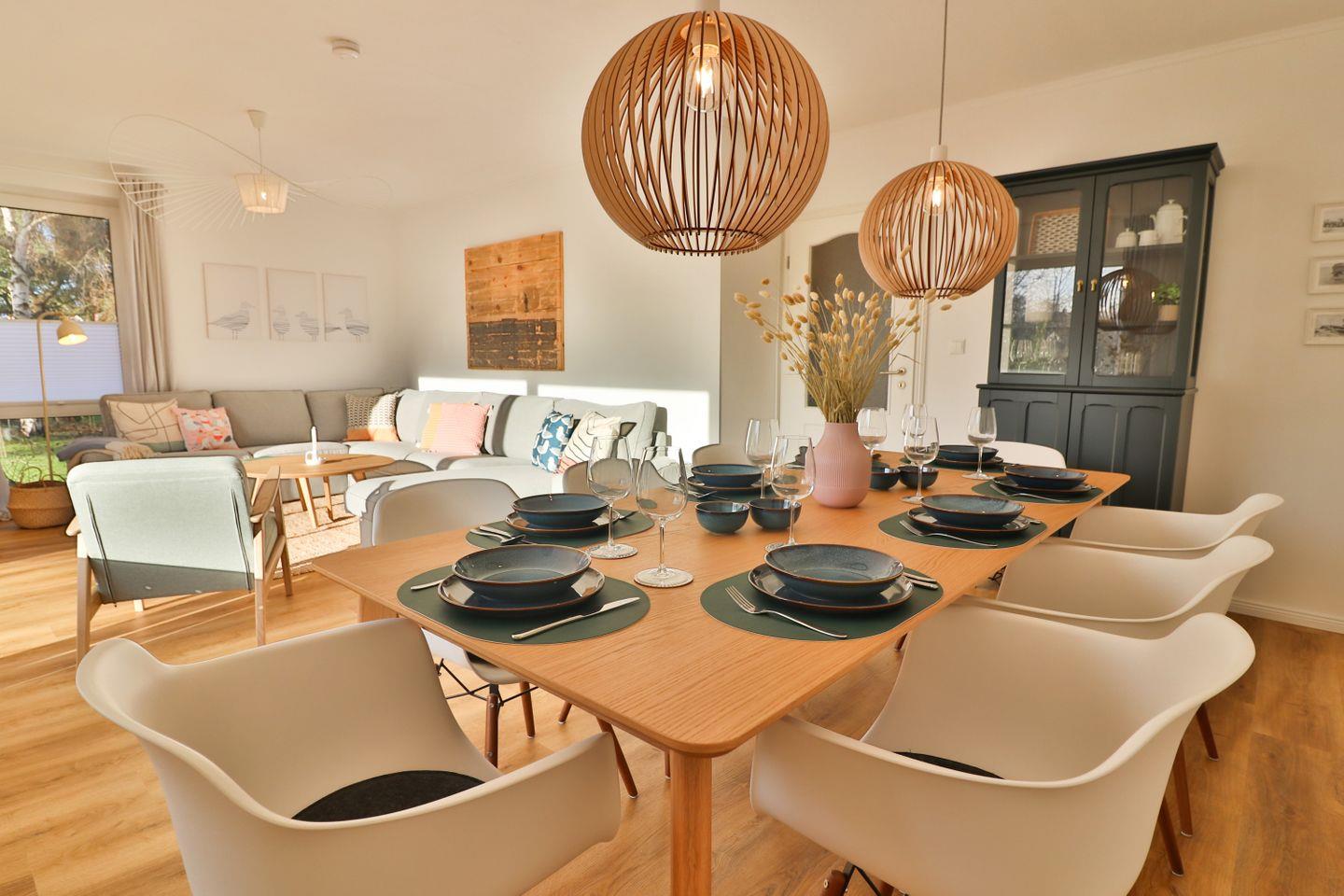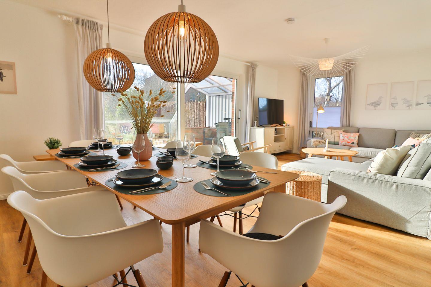 Der Wohnbereich ist großzügig gestaltet und umfasst eine bequeme XXL-Sofaecke, die zu gemütlichen Fernseh- oder Gesprächsabenden einlädt, sowie einen separaten Essbereich. Hier finden alle Gäste ausreichend Platz, um gemeinsam zu speisen oder bei einer Spielerunde zusammenzusitzen. Ein Fernseher, Radio, Bücher sowie eine Auswahl an Spielen sorgen für abwechslungsreiche Unterhaltung. Sollten Sie im Urlaub im Home-Office arbeiten müssen, stehen Ihnen zwei Schreibtische sowie zuverlässiges WLAN zur Verfügung. Die komplette Einrichtung ist modern und zugleich urgemütlich, und bietet eine durchdachte Ausstattung für einen wundervollen Aufenthalt.