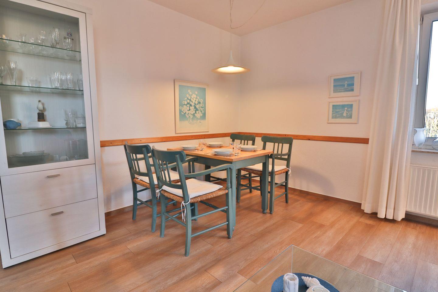 Im Wohnbereich erwarten Sie ein gemütliches Wohnzimmer mit Sofaecke, die sich zum Schlafsofa (ca.120 x 200 cm) ausziehen lässt und TV sowie Radio, HiFi-Anlage und CD-Spieler. Bücher und Spiele sorgen zusätzlich für entspannte Stunden. Ein Essbereich mit Esstisch ist ebenfalls vorhanden und bietet einen angenehmen Rahmen für gemeinsame Mahlzeiten.