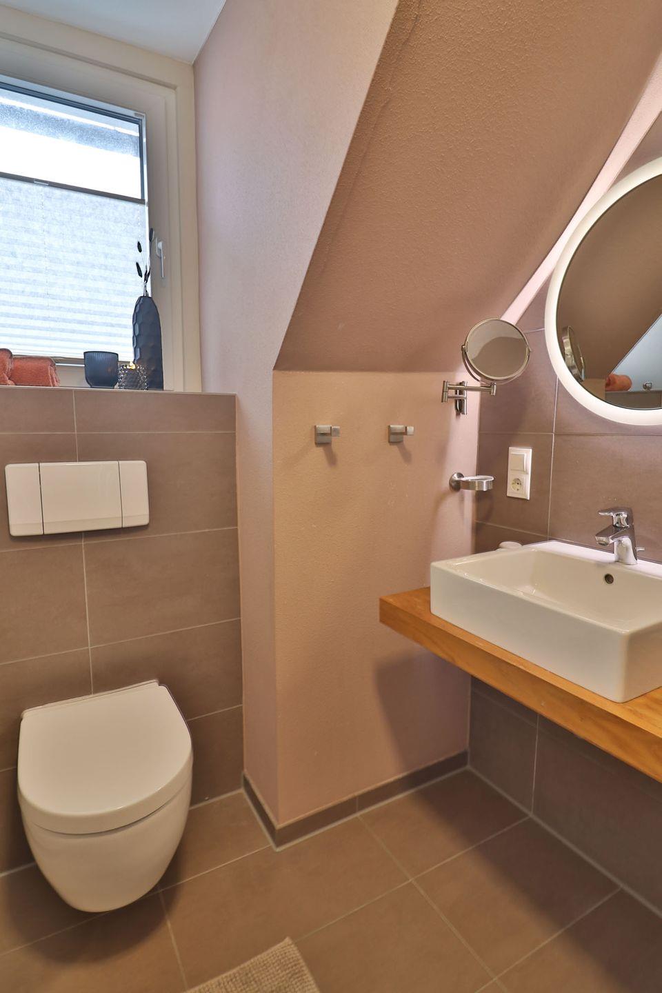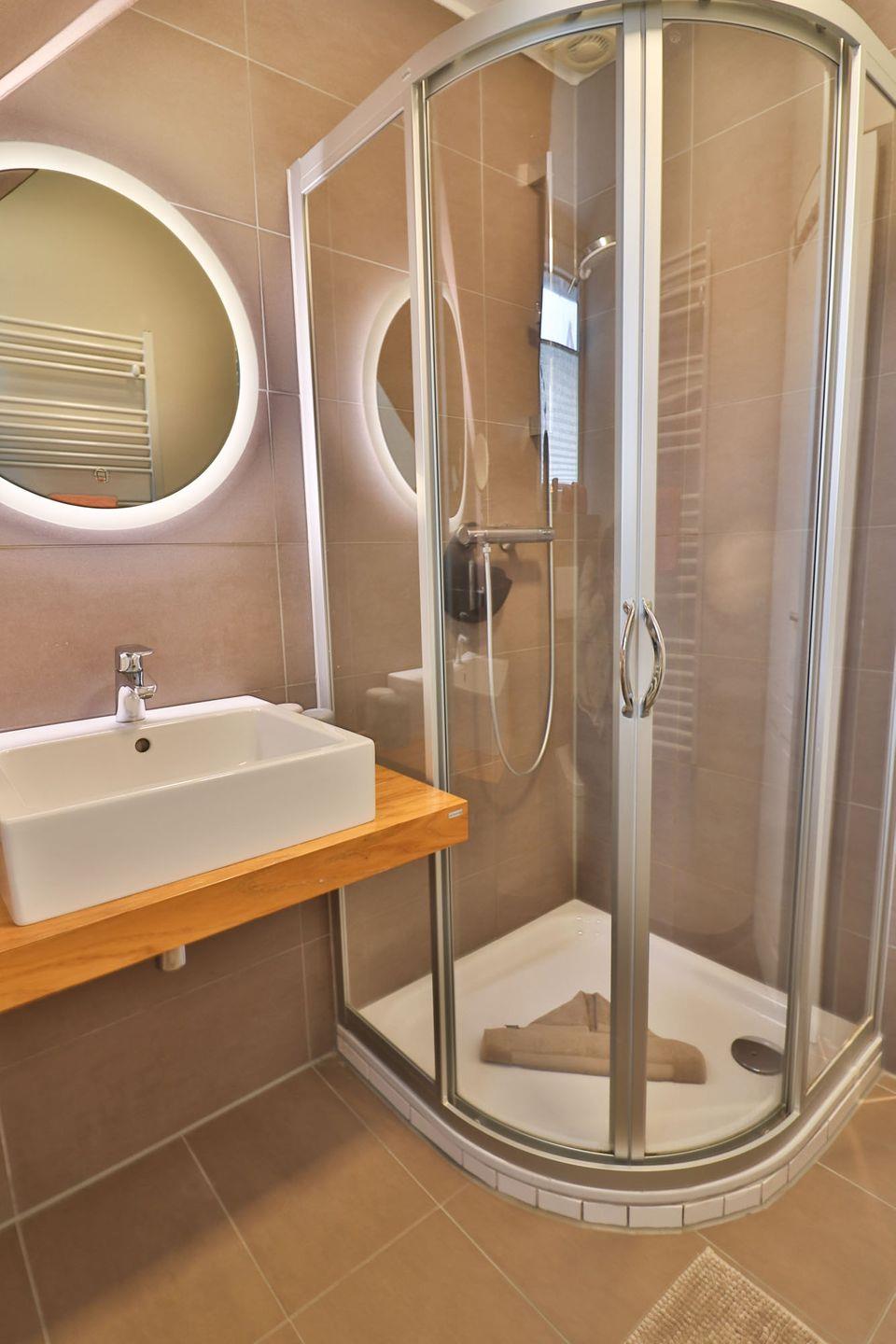 Das Tageslichtbad verfügt über Dusche, WC und Waschbecken. Spiegel, Kosmetikspiegel und Haartrockner stehen selbstverständlich für Sie bereit.