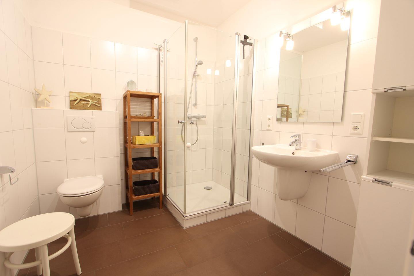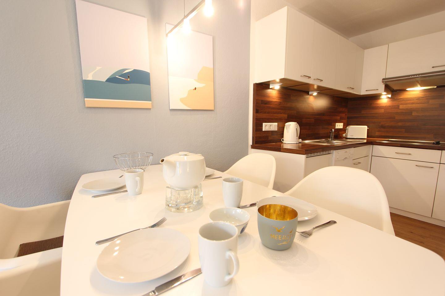 In dieser Wohnung finden Sie auf 47 Quadratmetern alles, was Sie für entspannte Tage allein, zu zweit oder zu dritt in Ihrem Inselurlaub auf Langeoog benötigen. Vom in warmen Erdtönen mit blauen Akzenten eingerichteten Wohn- und Esszimmer aus genießen Sie einen Blick auf die von Grün umgebene Terrasse. Auch die offene Küche in freundlichem weiß ist in diesen Raum integriert. Im Essbereich befindet sich ein großzügiger Essplatz für 4 Personen sowie eine gemütliche Sitzgarnitur mit Blick auf die kleine Terrasse. Die voll ausgestattete Küche bietet unter anderem Kaffeemaschine, Toaster, Geschirrspüler, Herd, Back-/Grillkombination und Mikrowelle. Das in hellen Farben gehaltene Schlafzimmer ist gemütlich und mit einem Doppelbett ausgestattet. Im in weiß und Naturtönen gehaltene Badezimmer mit modernen Regalen aus Bambusholz finden Sie eine Dusche, WC und einen Waschtisch vor; selbstverständlich gehört auch ein Föhn mit zur Ausstattung.